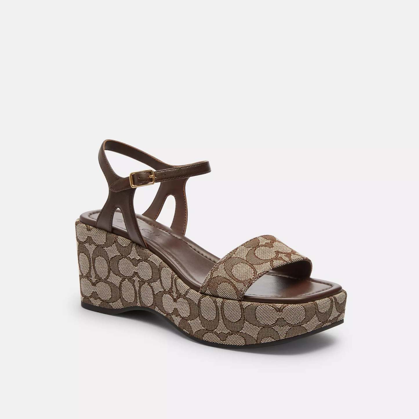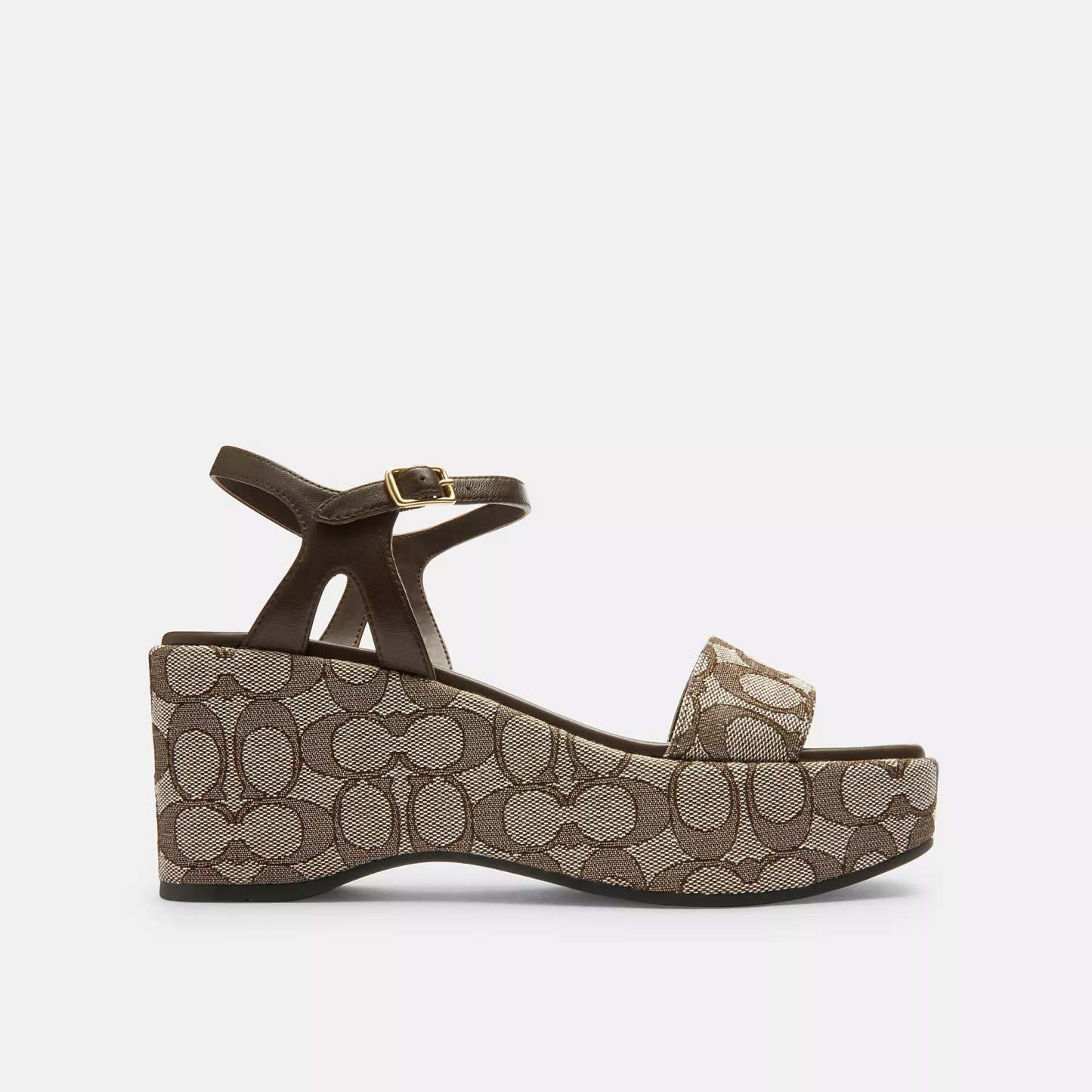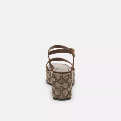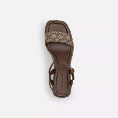 Signature jacquard and nappa leather upper Man-made leather lining and footbed Rubber outsole Buckle closure 3 1/4 platform This Coach piece is crafted with our Signature jacquard made from a blend of regenerative cotton and recycled polyester Style No. CAA26 | Coach Outlet Gale Wedge Sandal In Signature Jacquard - Brown, Size - 11