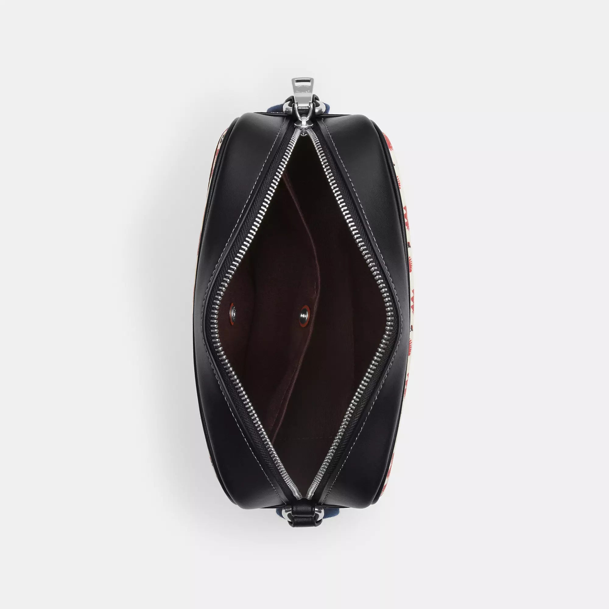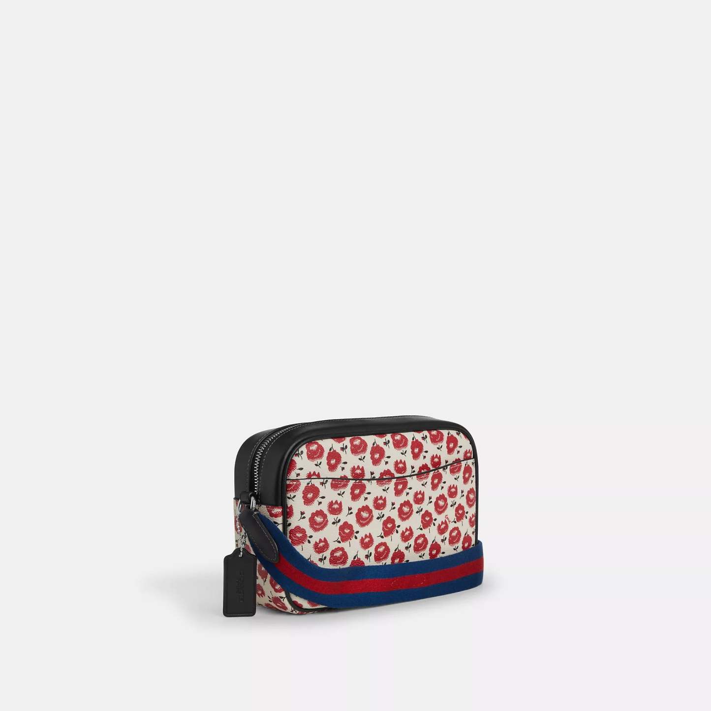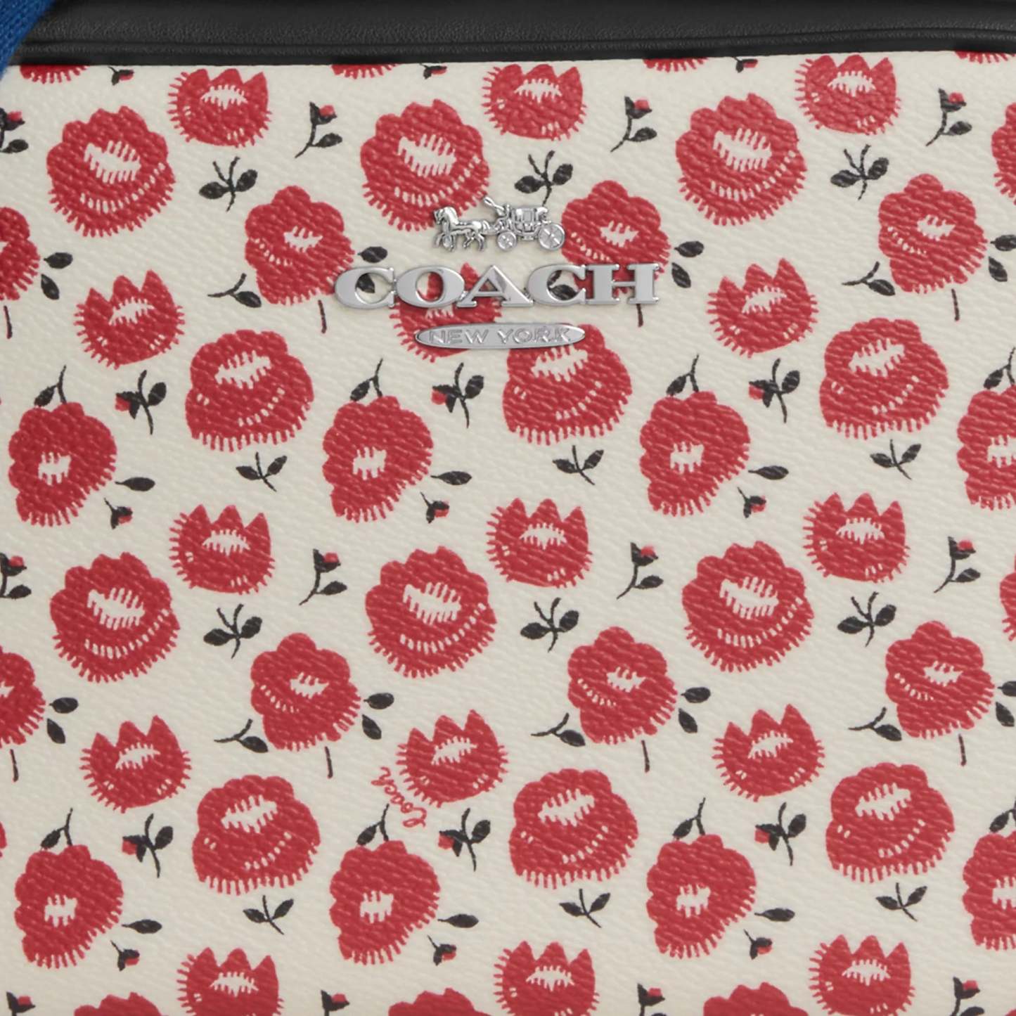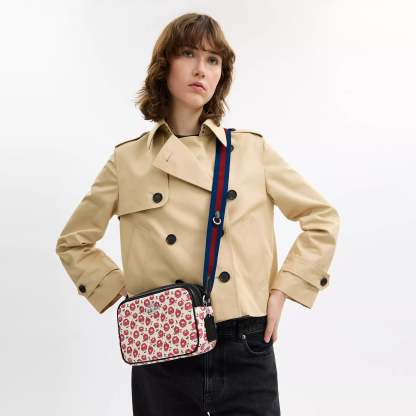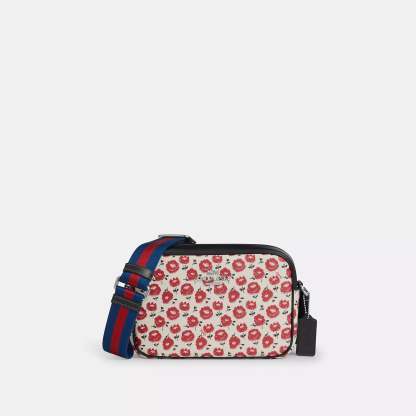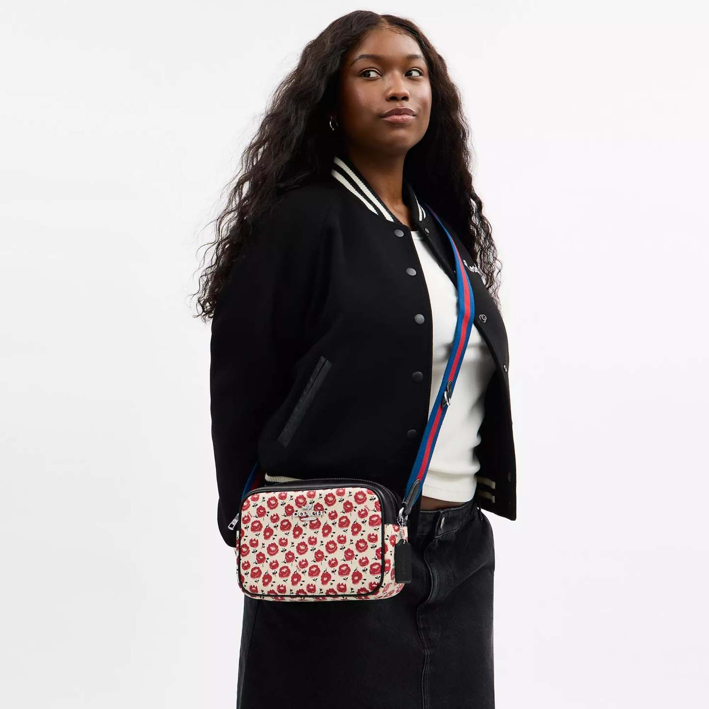 Printed coated canvas Inside snap pocket Zip closure fabric lining Outside open pocket Adjustable strap with 24 drop for shoulder or crossbody wear 8 3/4 (L) x 6 (H) x 3 (W) Style No. CBM21 | Coach Outlet Jamie Camera Bag With Floral Print - Red