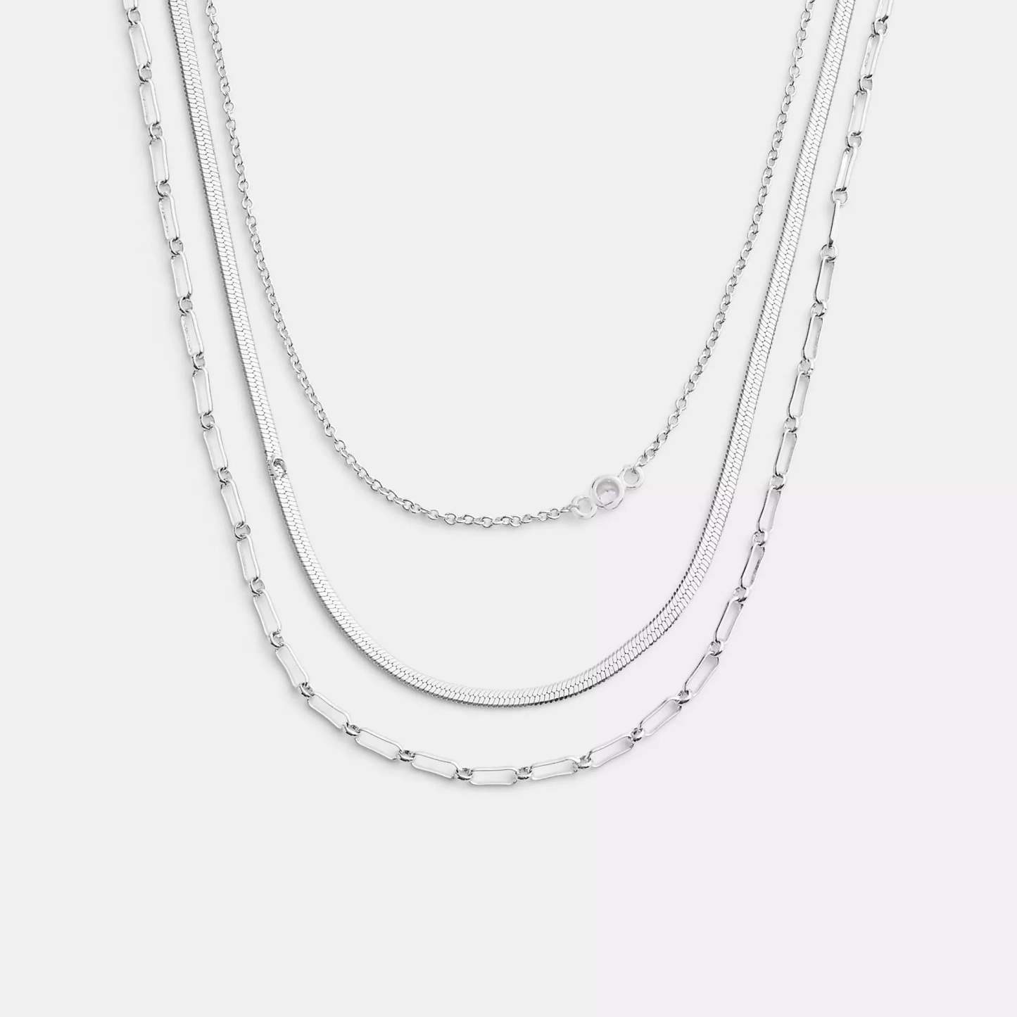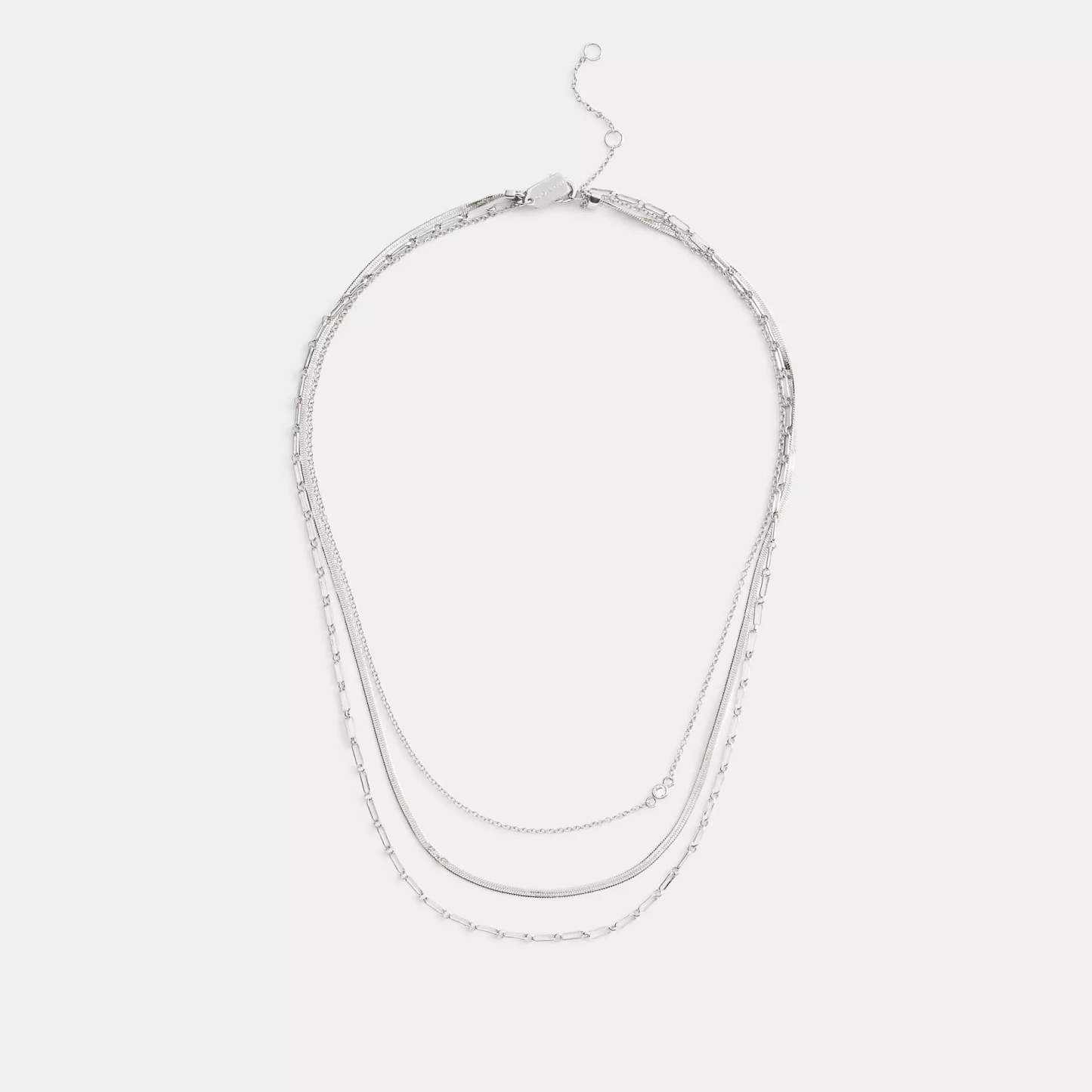 Plated brass and cubic zirconia Lobster clasp closure Short necklace - adjustable 16–18 (L) Middle necklace - adjustable 17–19 (L) Long necklace - adjustable 18–20 (L) Style No. CAD37 | Coach Outlet Layered Chain Necklace - Grey