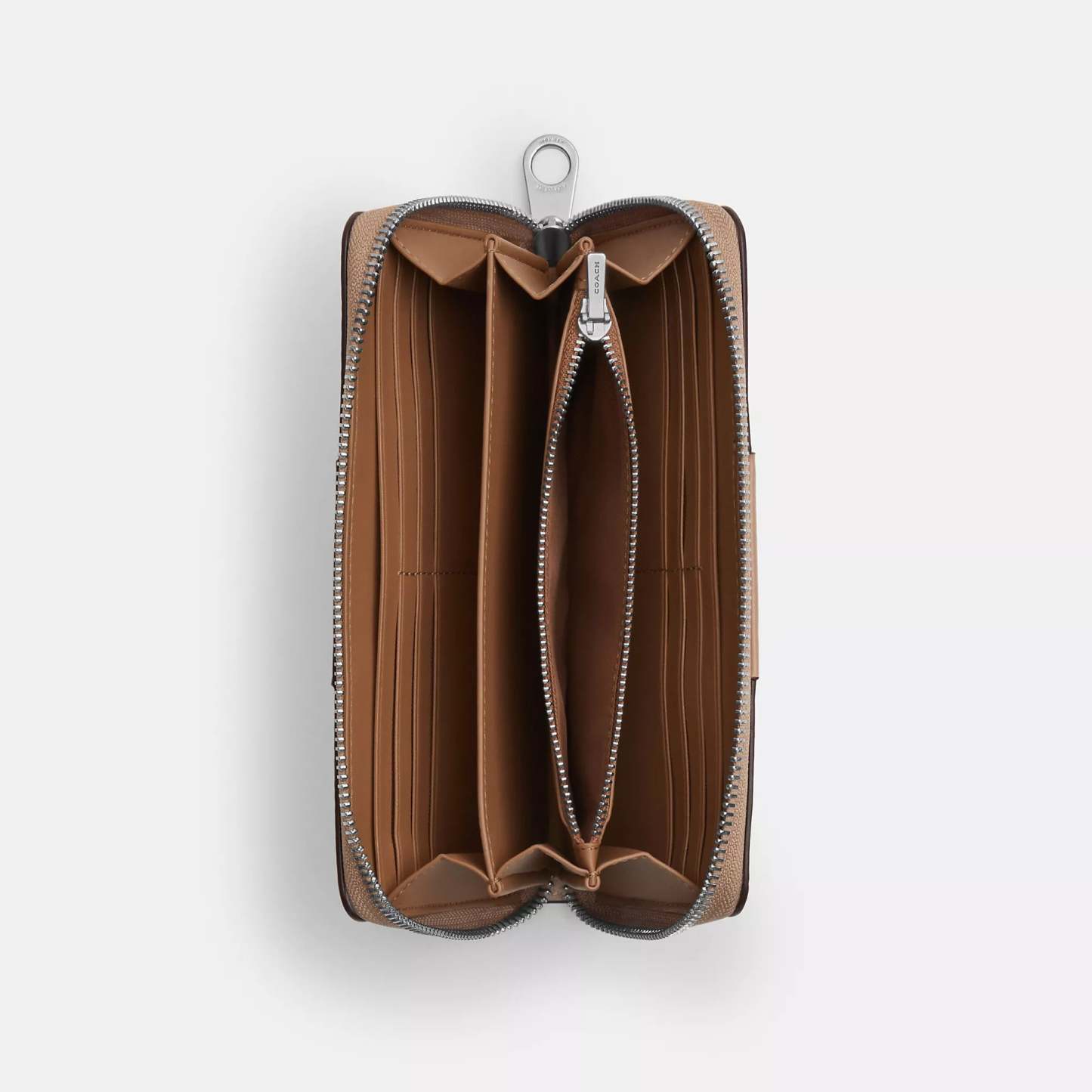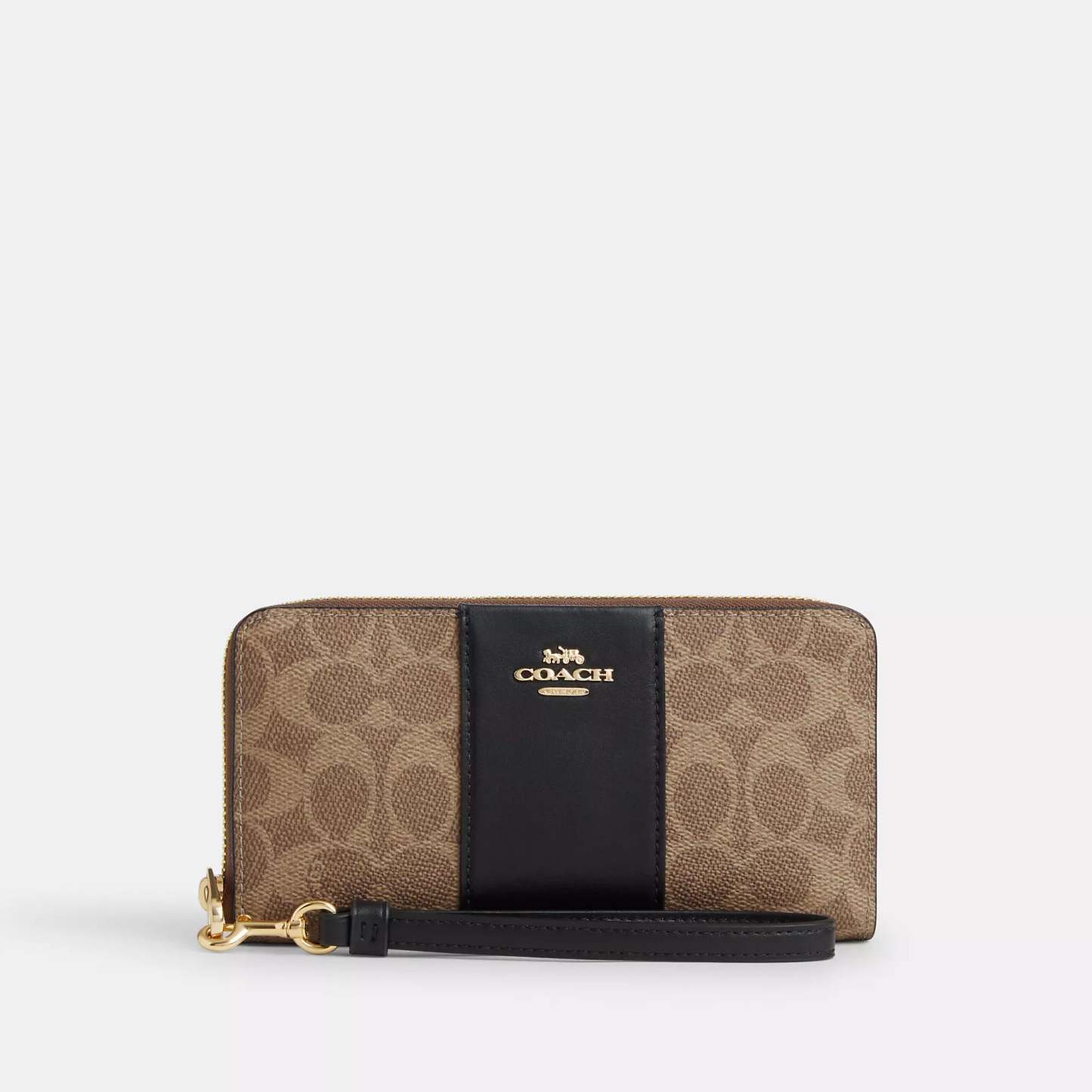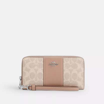 Signature coated canvas and smooth leather 12 credit card slots Full-length bill compartments Inside zip coin pocket Zip-around closure Detachable wrist strap 7 1/2 (L) x 4 (H) x 1 (W) Fits all iPhone and Samsung Galaxy phones Style No. CW947 | Coach Outlet Long Zip Around Wallet In Signature Canvas With Stripe - Beige