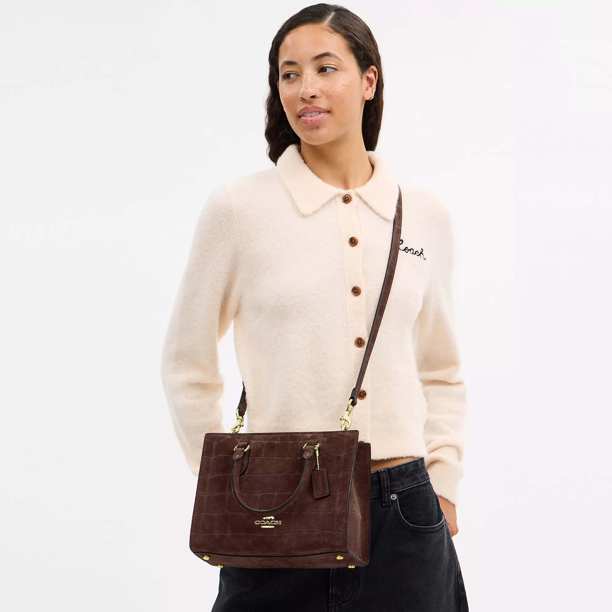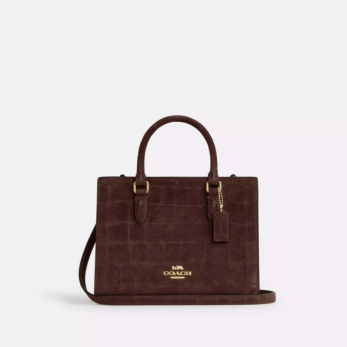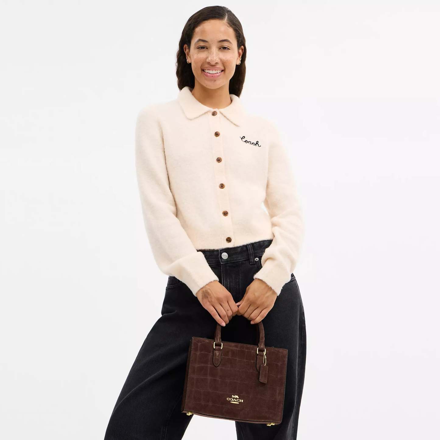 Crocodile-embossed suede and smooth leather Inside zip and multifunction pockets Zip-top closure fabric lining Handles with 3 3/4 drop Detachable strap with 22 1/2 drop for shoulder or crossbody wear Four protective feet at base 9 3/4 (L) x 7 1/2 (H) x 4 1/2 (W) Style No. CCC71 | Coach Outlet Maggie Small Tote Bag - Brown