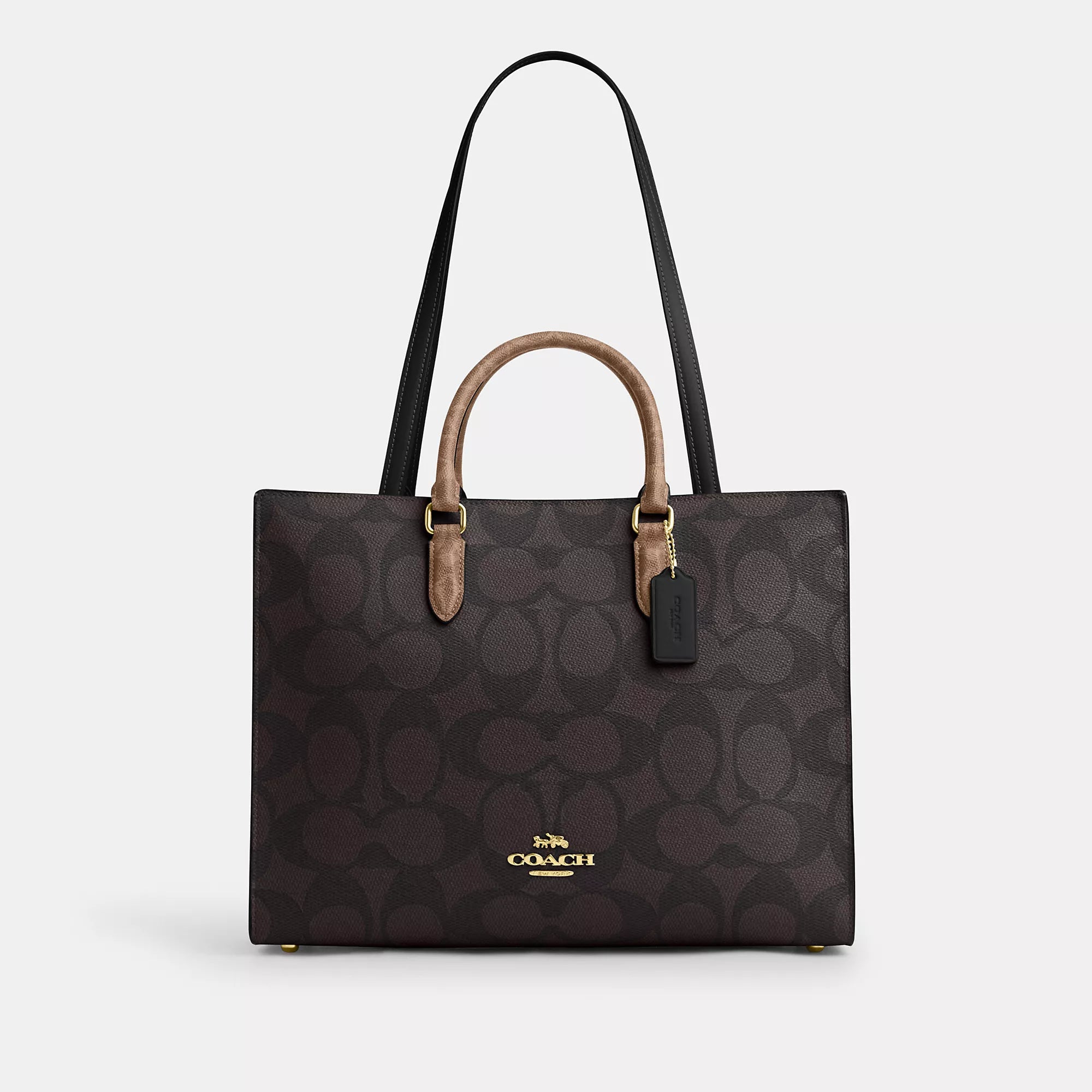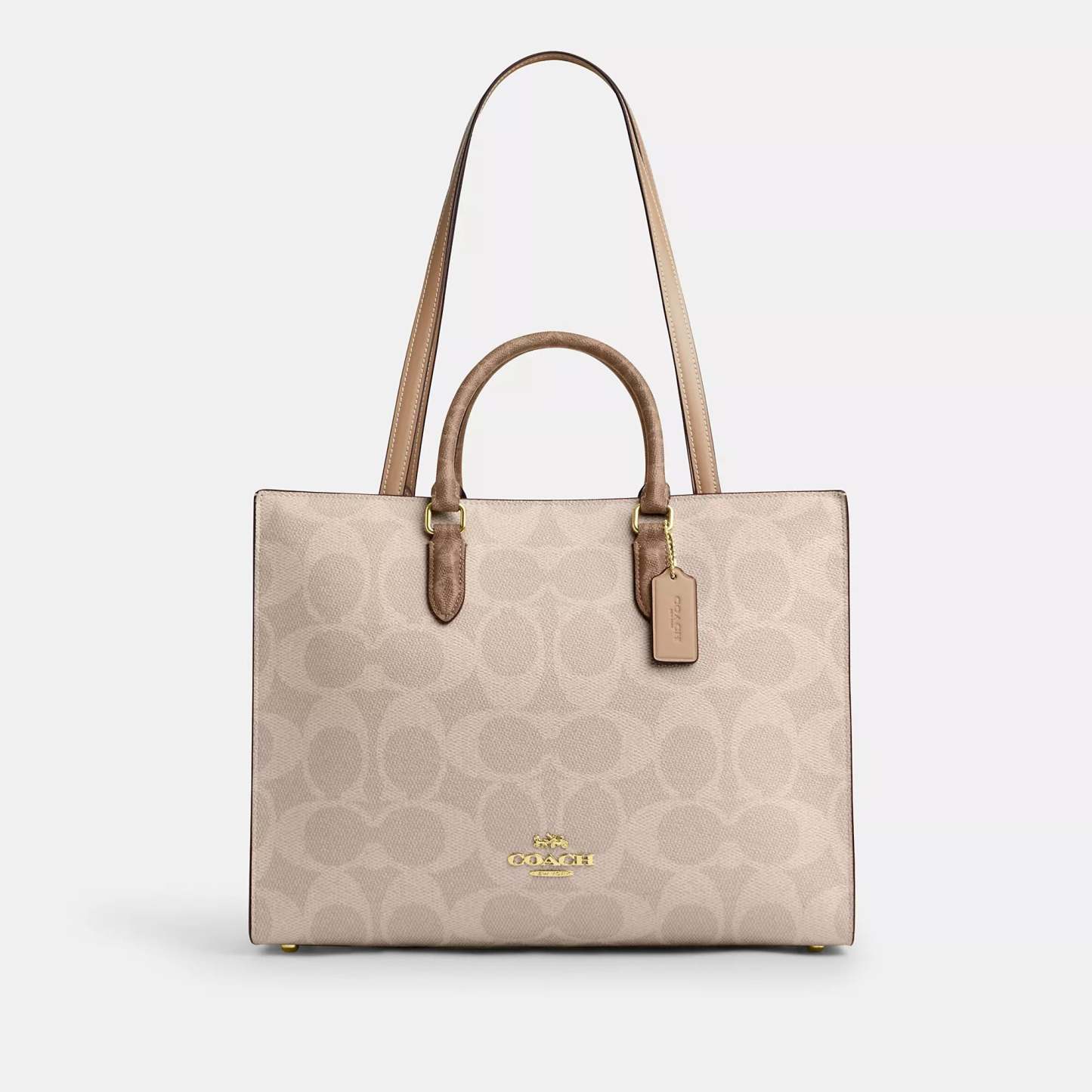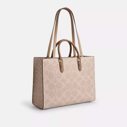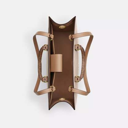 Signature coated canvas and smooth leather Inside zip pocket Magnetic snap closure fabric lining Handles with 4 1/4 drop Strap with 11 1/2 drop Four protective feet at base 14 1/4 (L) x 11 (H) x 5 1/2 (W) Style No. CY677 | Coach Outlet Maggie Tote Bag In Blocked Signature Canvas - Beige