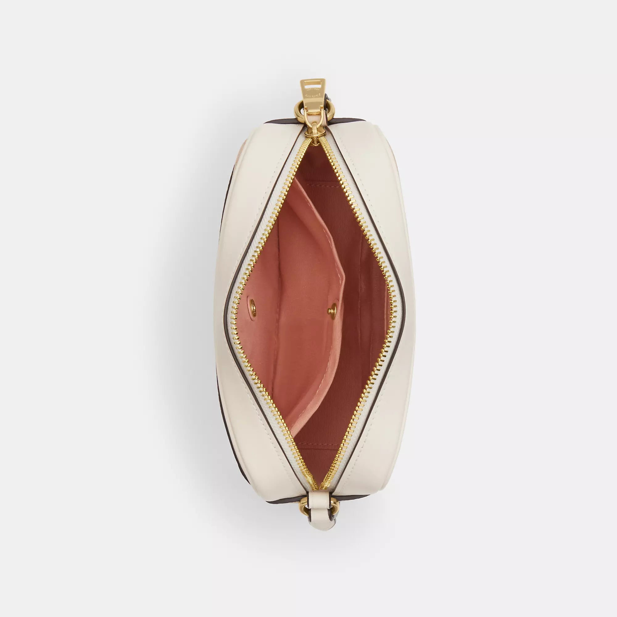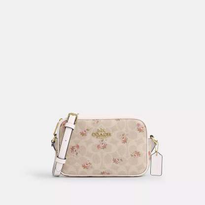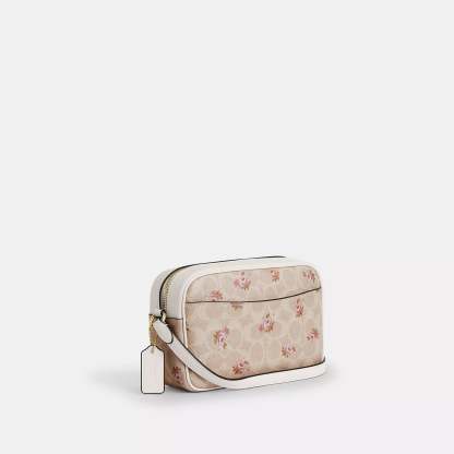 Signature coated canvas Two credit card slots Inside snap pocket Zip closure fabric lining Outside open pocket Adjustable strap with 22 1/2 drop for shoulder or crossbody wear 7 3/4 (L) x 5 (H) x 2 1/2 (W) Style No. CBA86 | Coach Outlet Mini Jamie Camera Bag In Signature Canvas With Floral Print - Beige
