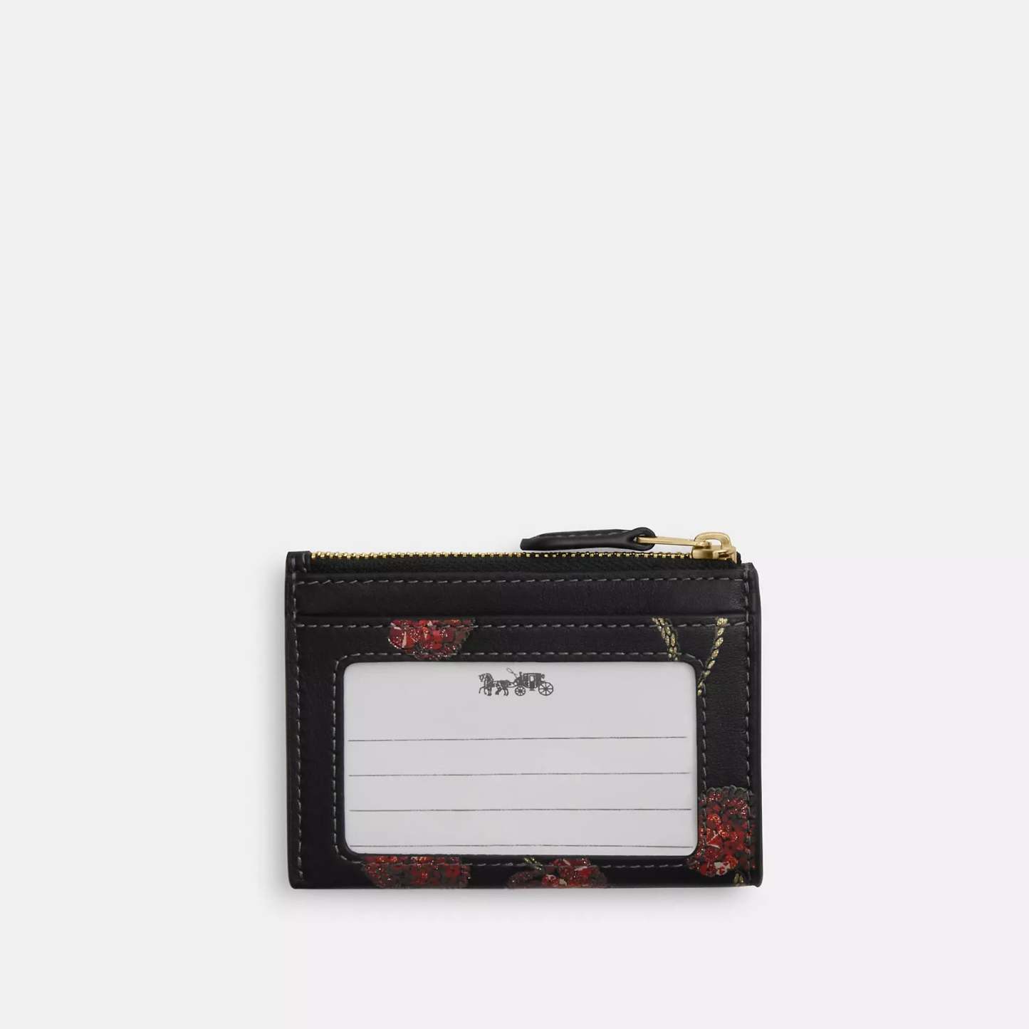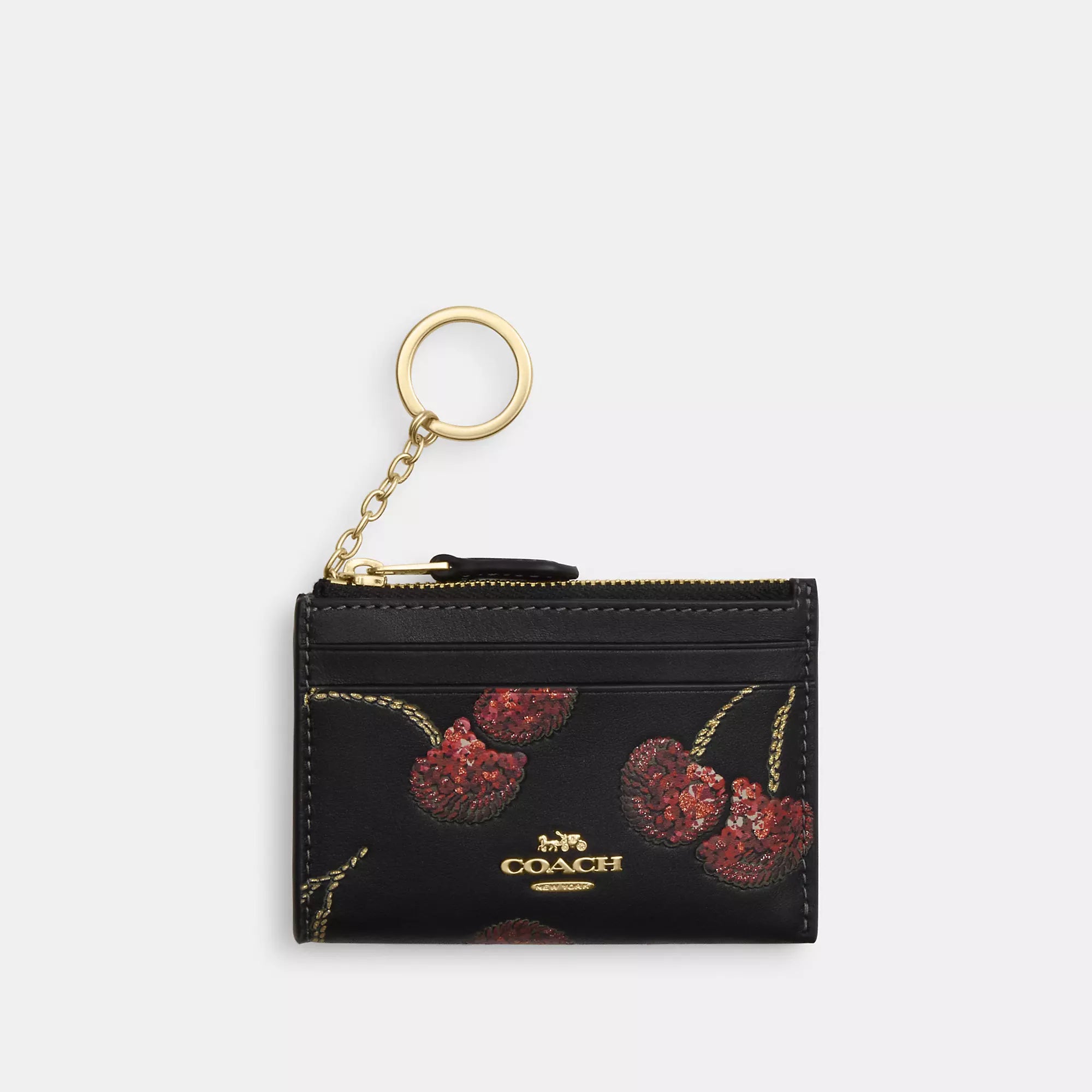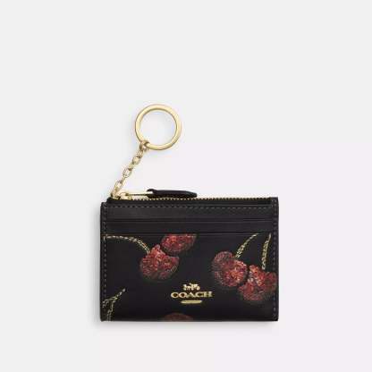Smooth leather Two credit card slots ID window Zip-top closure fabric lining Attached split key ring 4 1/4 (L) x 3 (H) x 1/2 (W) Style No. CDF83 | Coach Outlet Mini Skinny Id Case With Cherry Print - Black