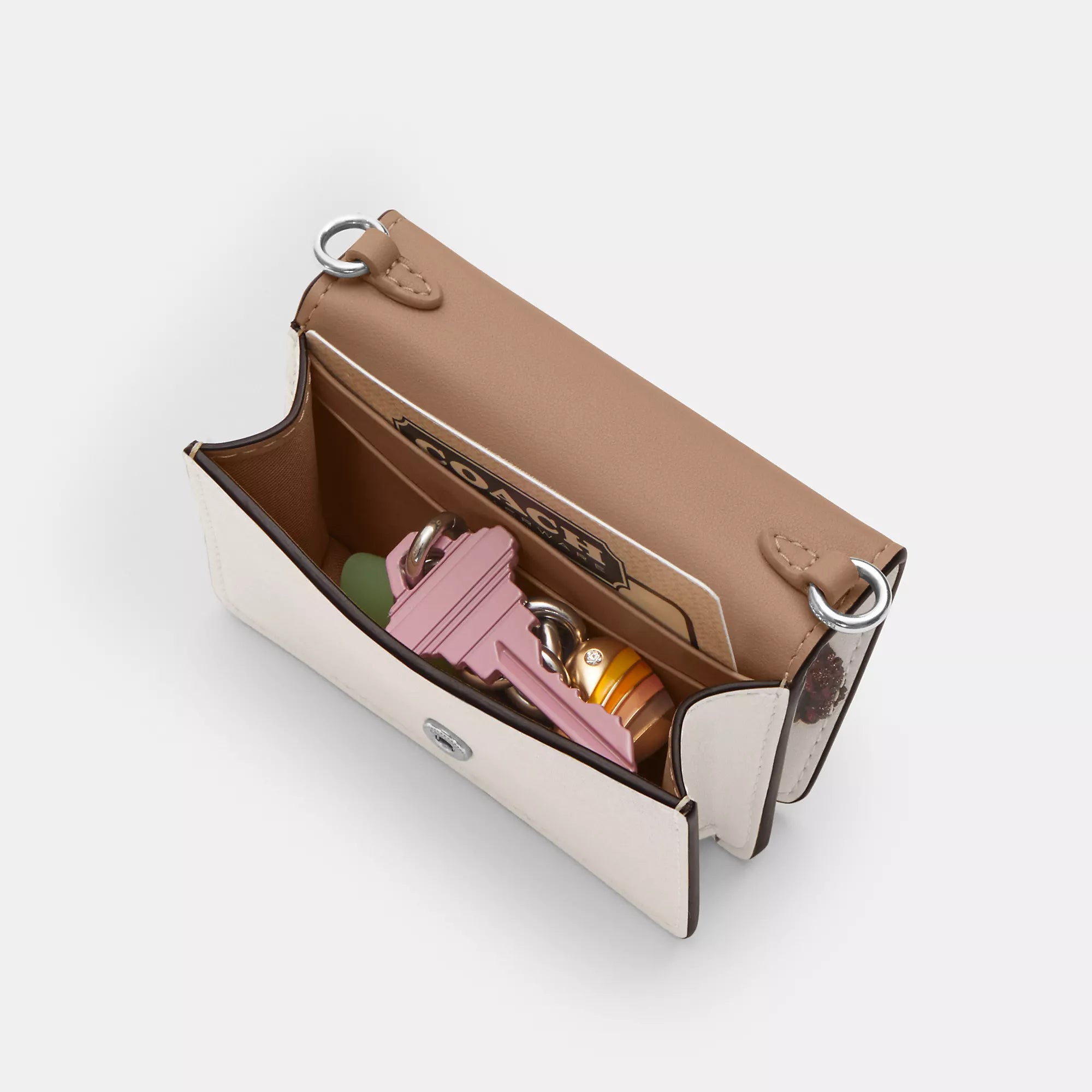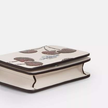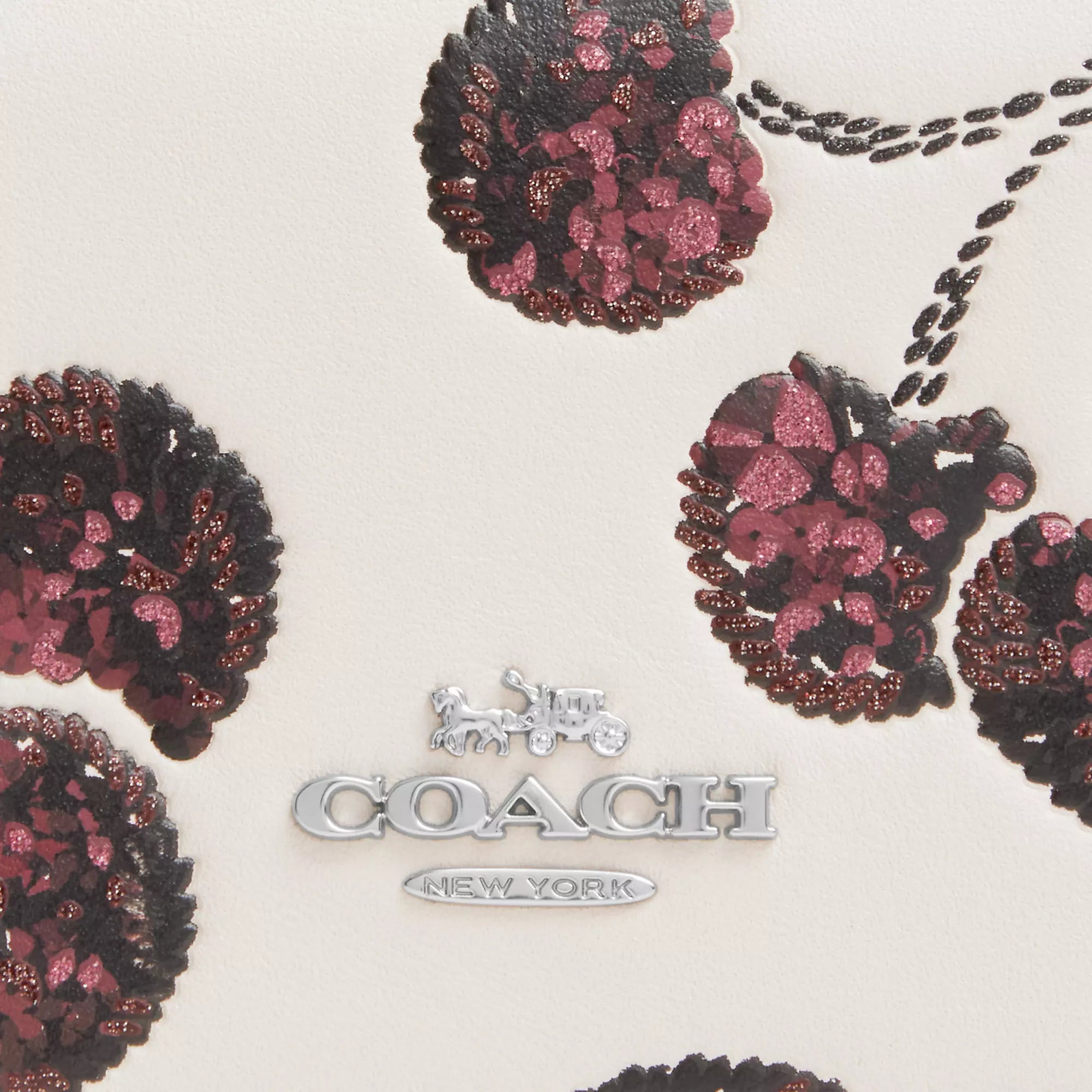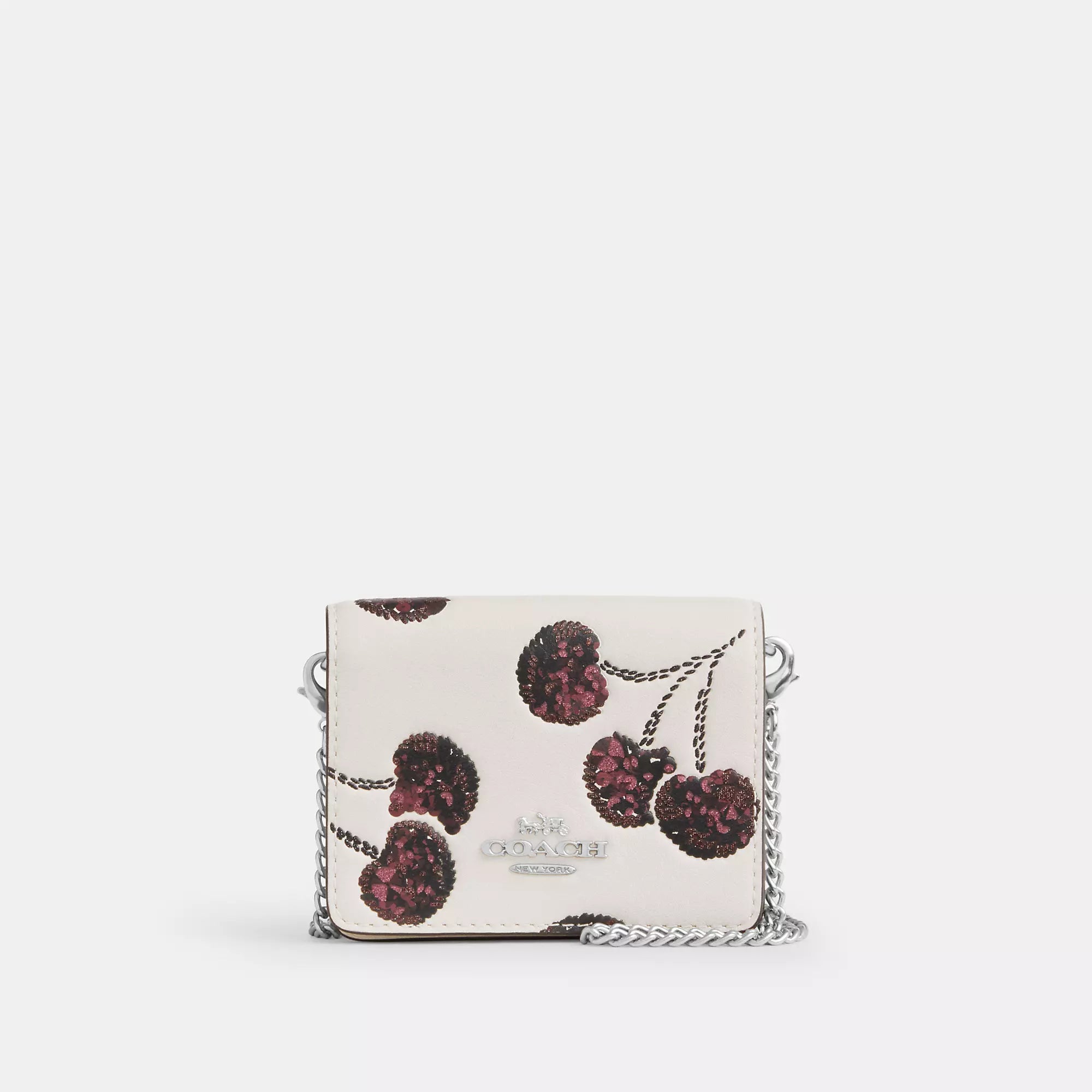 Smooth leather Two credit card slots Snap closure fabric lining Outside open pocket Detachable chain strap with 23 1/4 drop for shoulder or crossbody wear 4 (L) x 3 (H) x 1 (W) Style No. CDE98 | Coach Outlet Mini Wallet On A Chain With Cherry Print - White