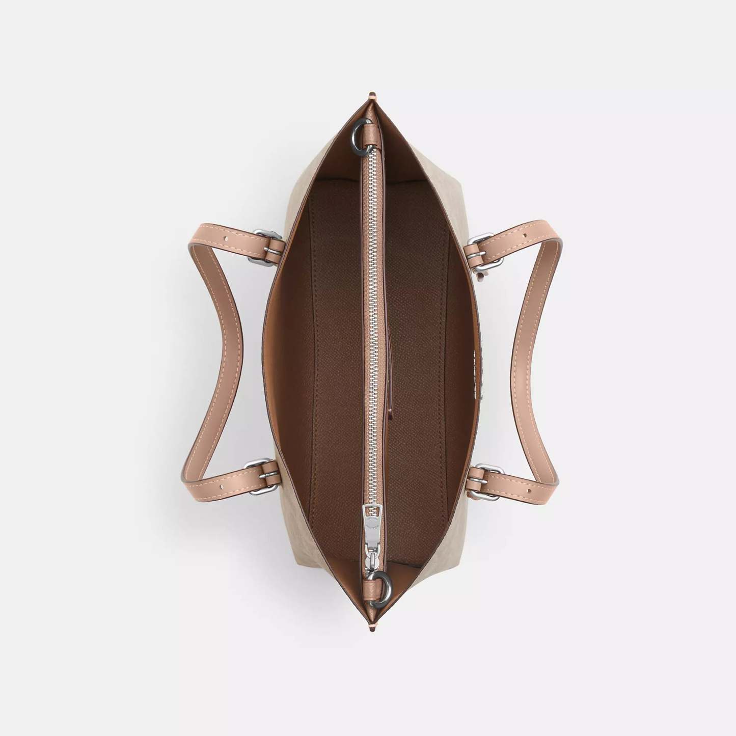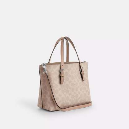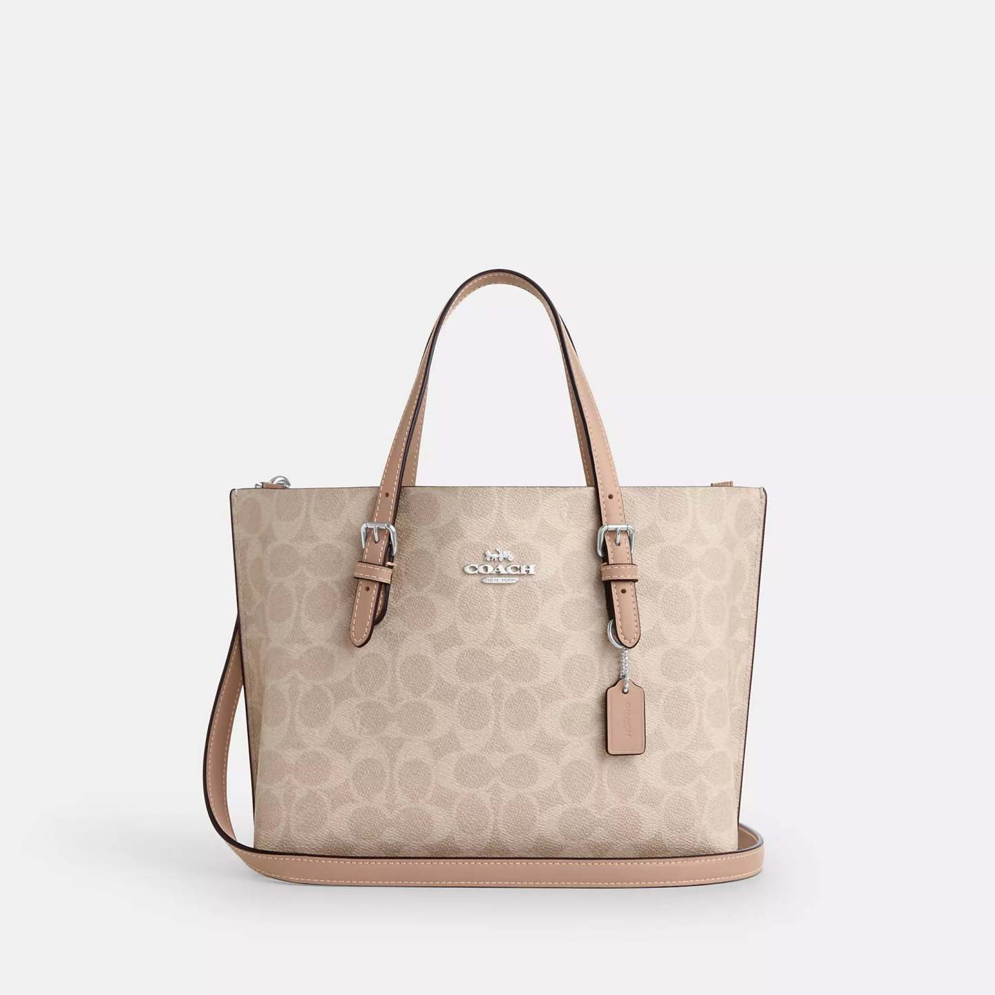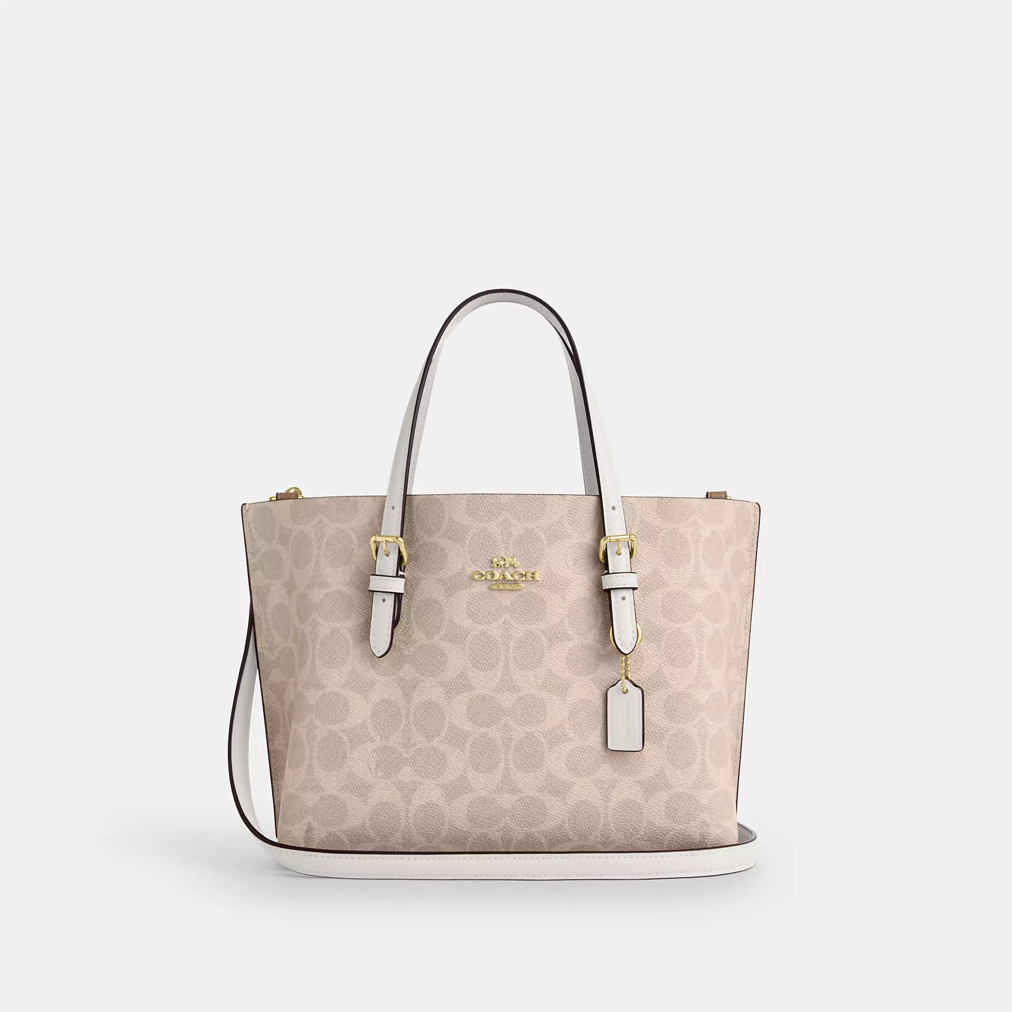 Signature coated canvas Zip-top closure fabric lining Side open compartments Handles with 4 3/4 drop Detachable strap with 22 drop for shoulder or crossbody wear 9 3/4 (L) x 7 1/2 (H) x 4 3/4 (W) Style No. CV965 | Coach Outlet Mollie Tote Bag 25 In Signature Canvas - Beige