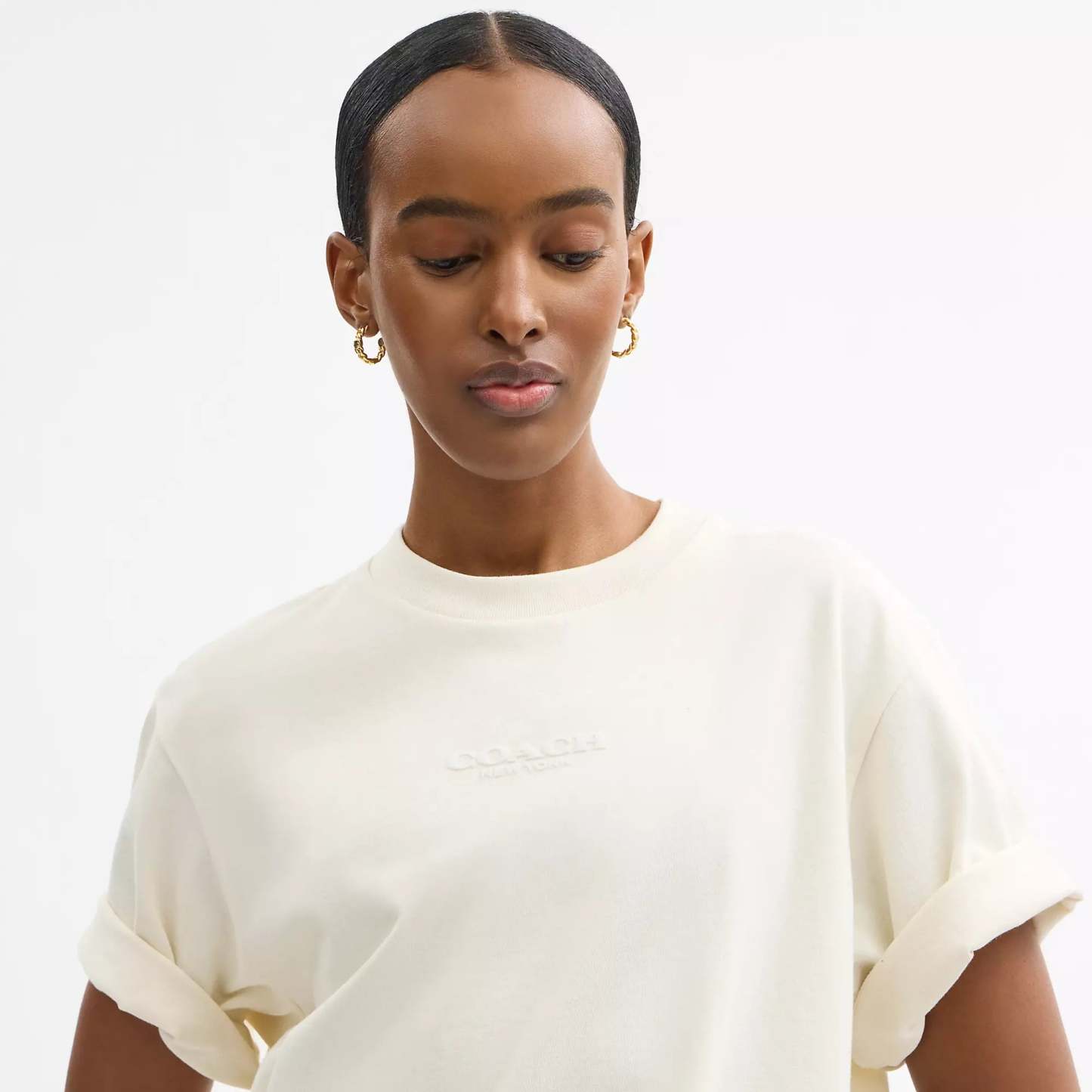 100% organic cotton Length - 35 Machine wash Model is 5'10 (178cm) chest 31 (79cm) waist 24 (61cm) hips 35 (89cm) and wears a size S Style No. CBF37 | Coach Outlet New York T-Shirt Dress In Organic Cotton - Beige, Size - Medium