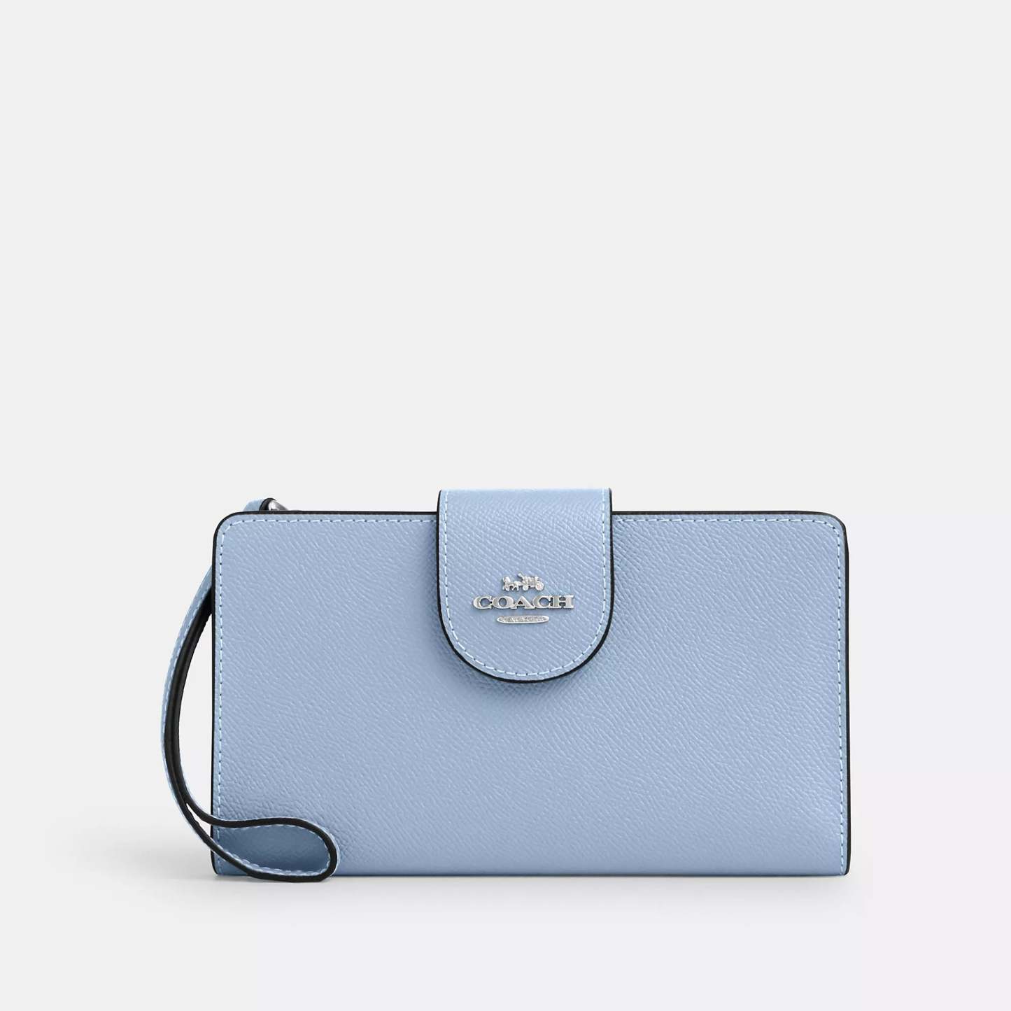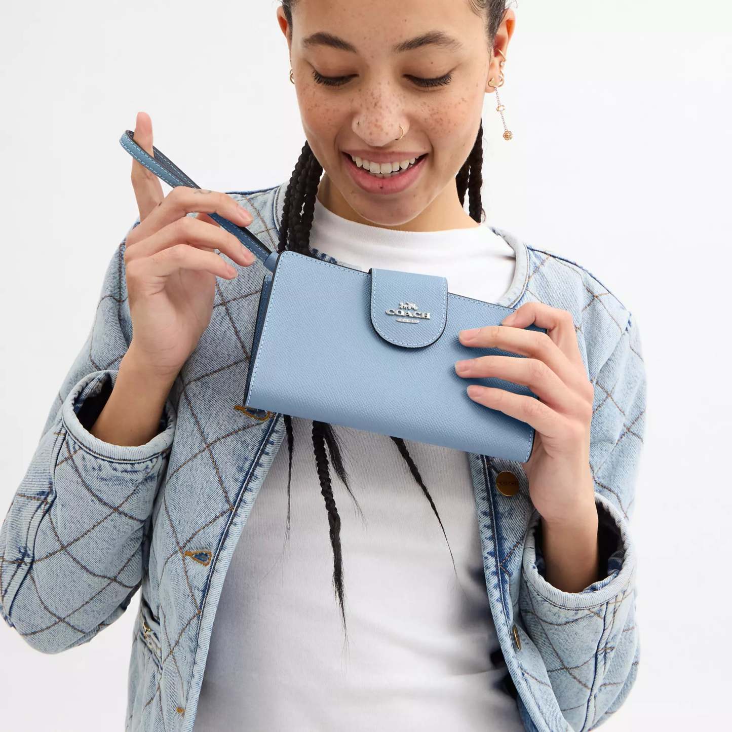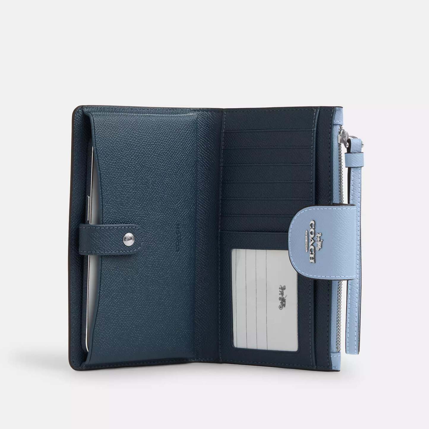 Crossgrain leather Six credit card slots ID window Full-length bill compartment Snap phone pocket Snap closure Outside zip coin pocket Wrist strap attached 7 1/4 (L) x 4 1/4 (H) Style No. CS441 | Coach Outlet Phone Wallet - Blue
