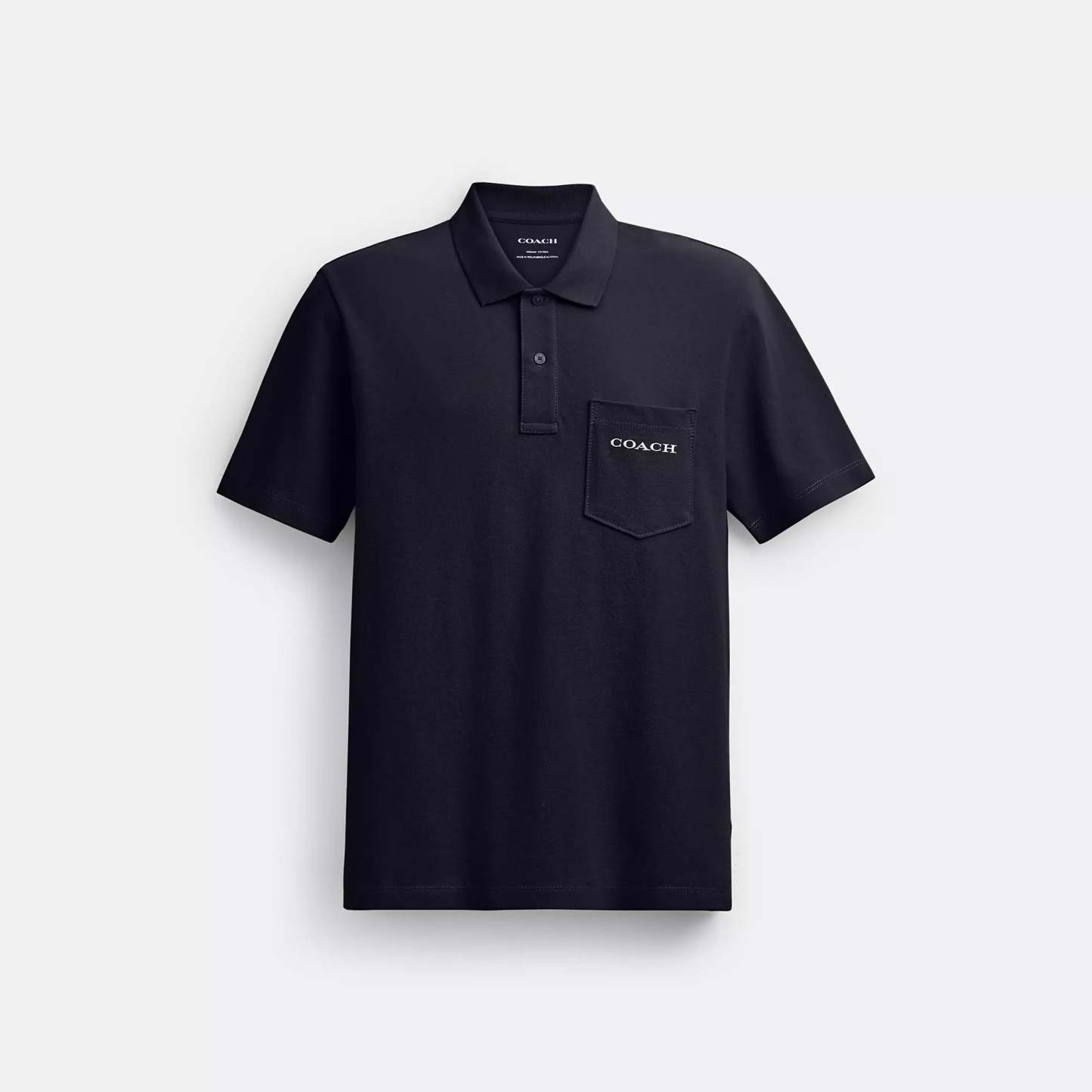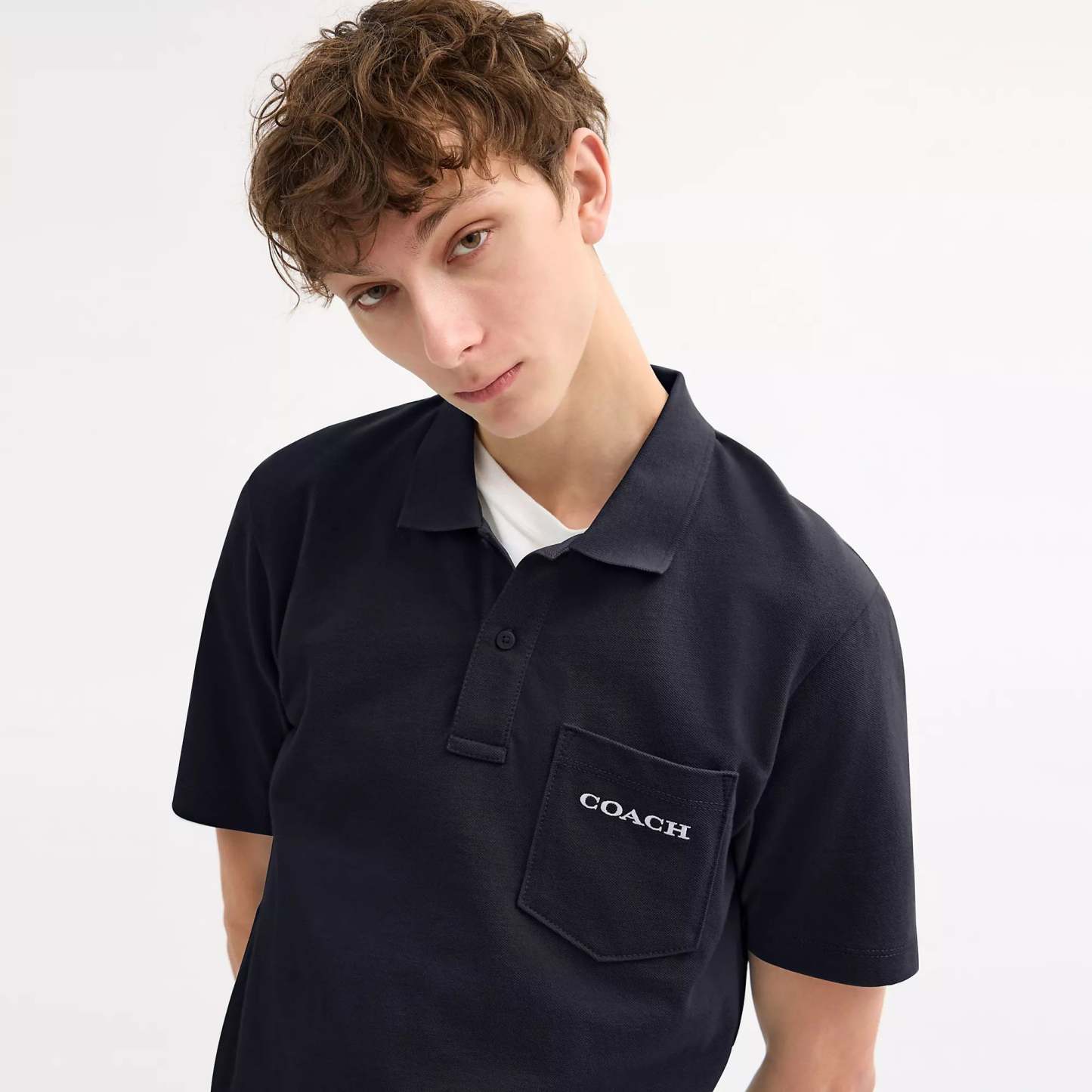 100% organic cotton Button closure Length - 28 1/4 Machine wash Model is 6'2 (188cm) and wears a size M Style No. CAH62 | Coach Outlet Pocket Polo In Organic Cotton - Blue, Size - 2X-XLarge