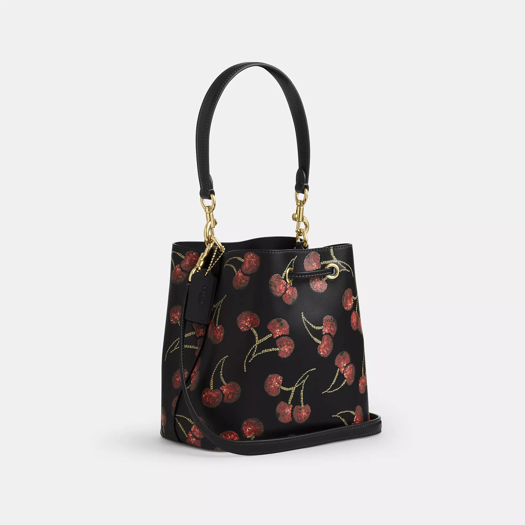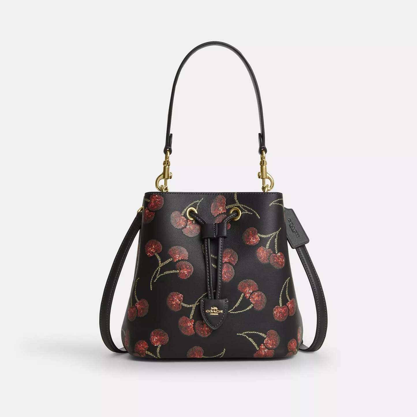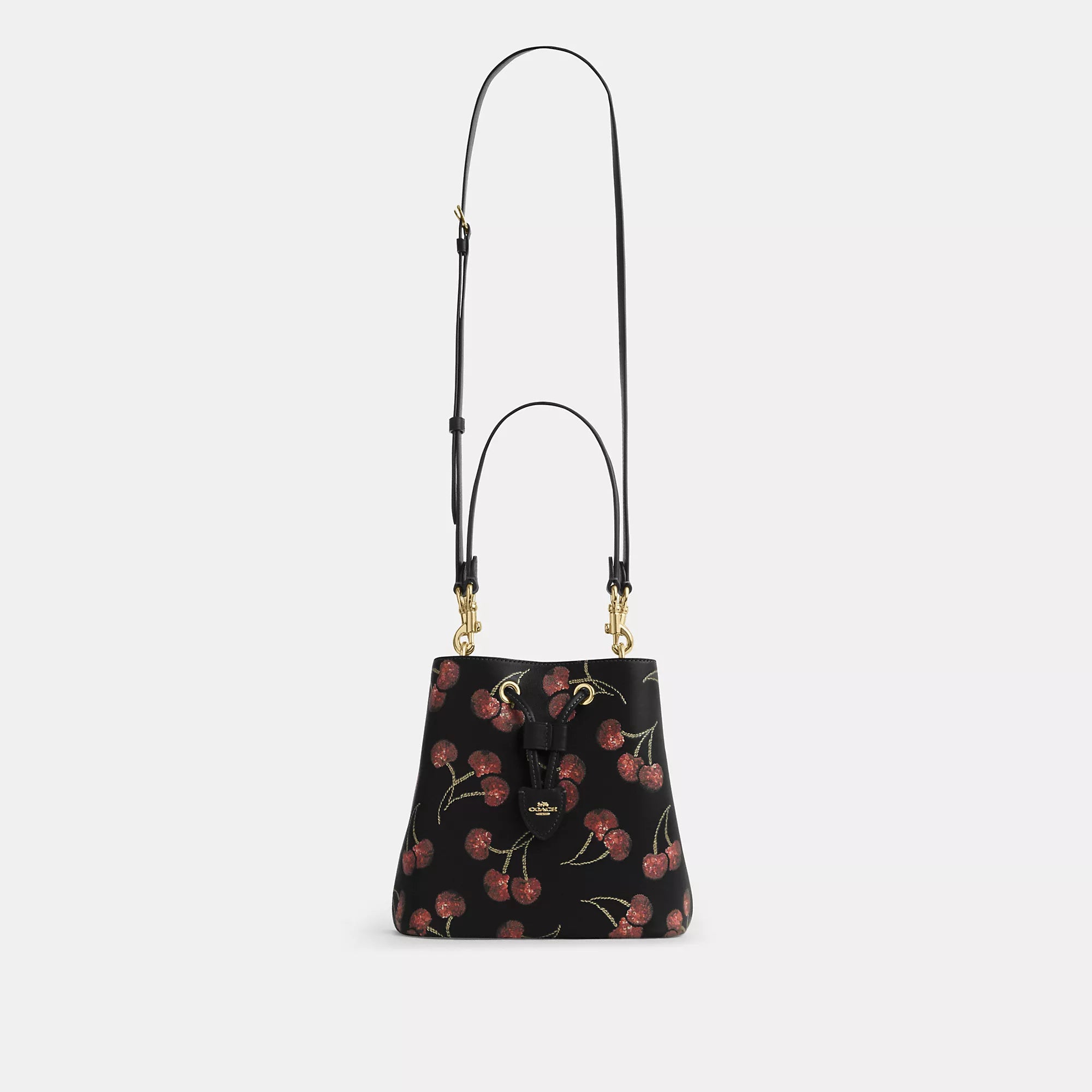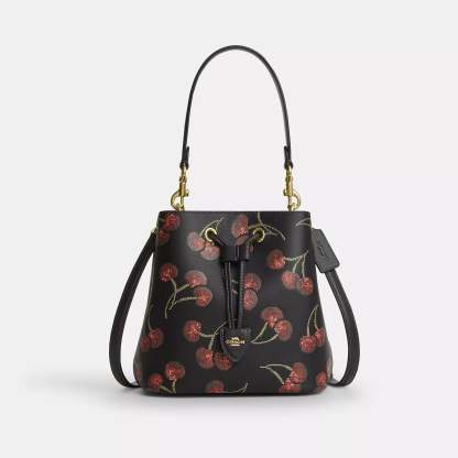Smooth leather Removable zip pouch Center open compartment Drawstring closure fabric lining Detachable handle with 8 3/4 drop Detachable strap with 22 drop for shoulder or crossbody wear 8 1/2 (L) x 8 1/2 (H) x 5 1/2 (W) Style No. CCZ17 | Coach Outlet Rowan Bucket Bag With Cherry Print - Black, Size - Medium