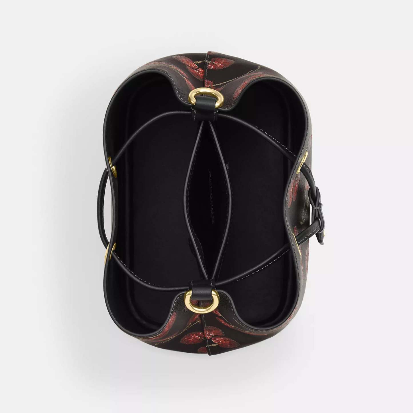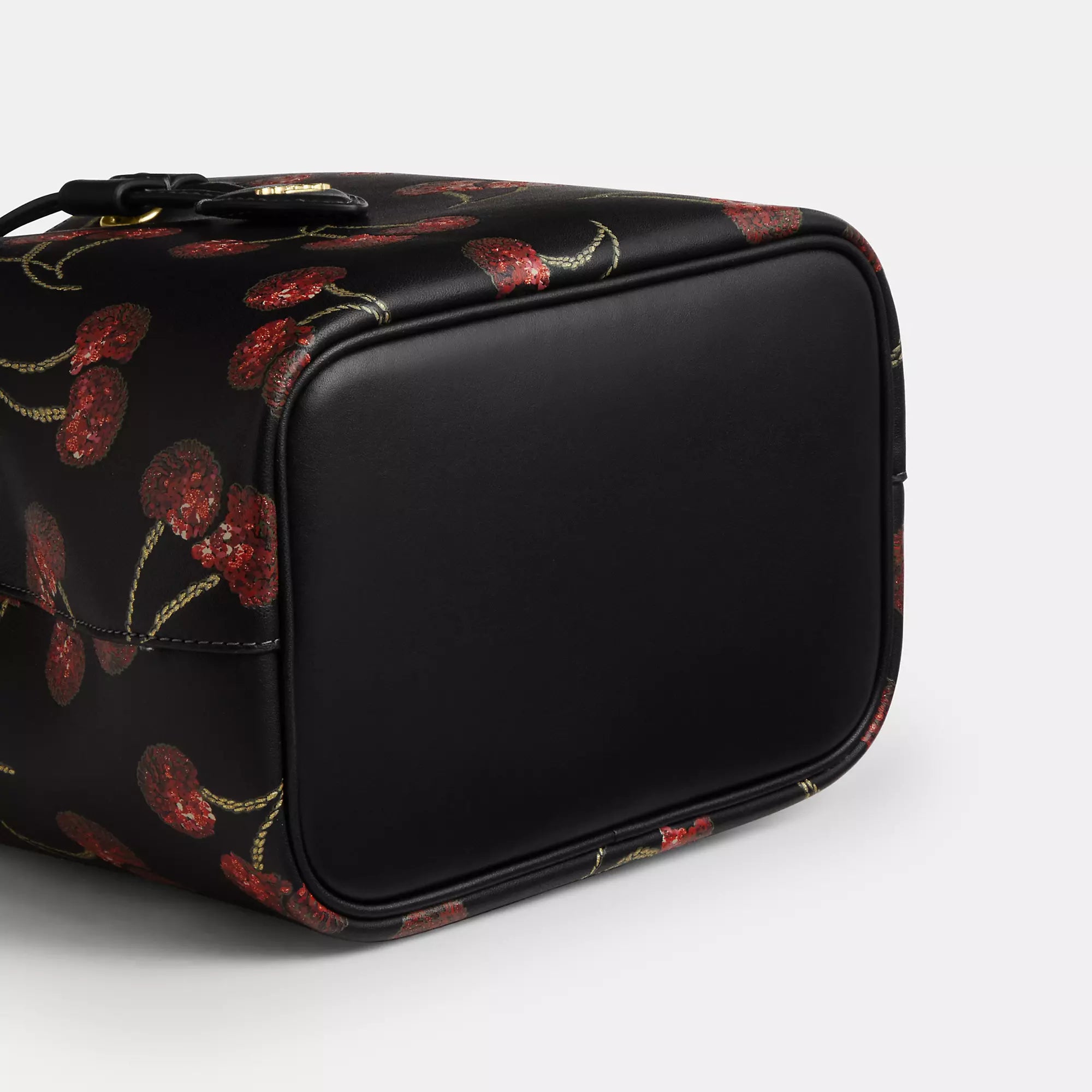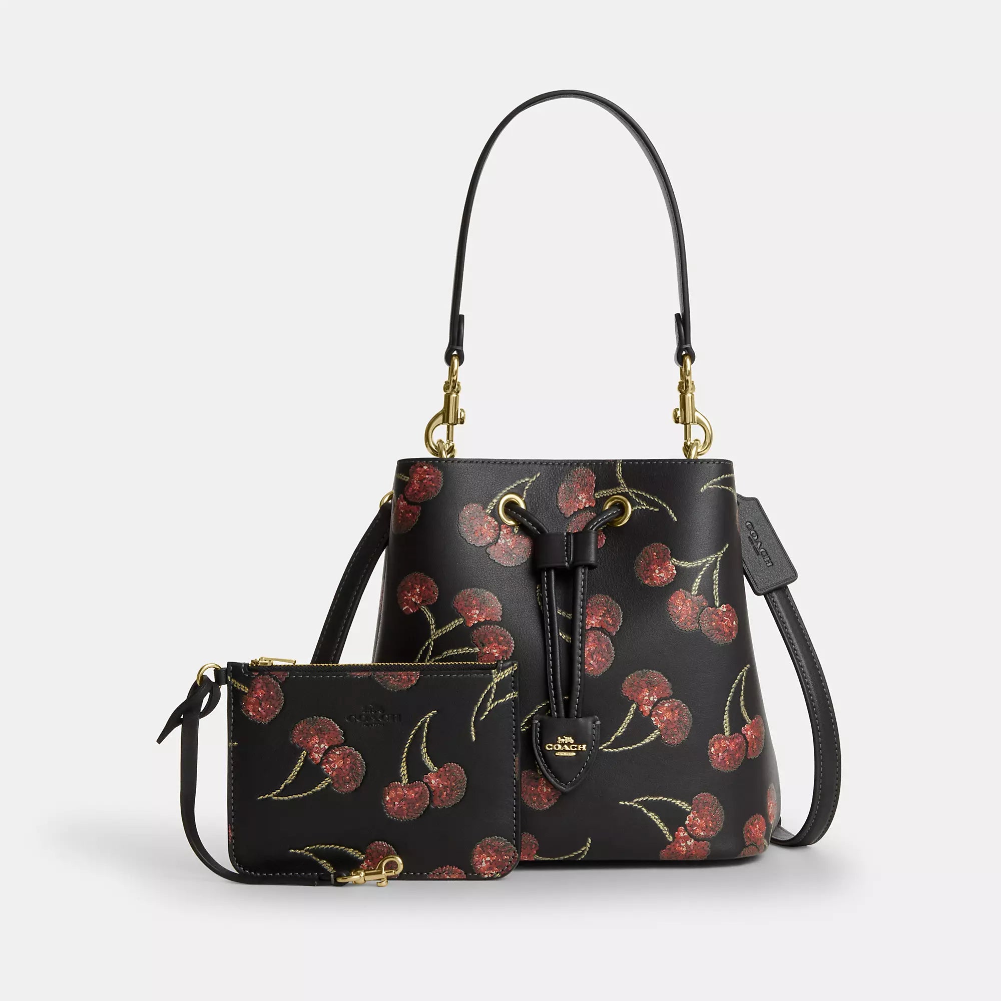 Smooth leather Removable zip pouch Center open compartment Drawstring closure fabric lining Detachable handle with 8 3/4 drop Detachable strap with 22 drop for shoulder or crossbody wear 8 1/2 (L) x 8 1/2 (H) x 5 1/2 (W) Style No. CCZ17 | Coach Outlet Rowan Bucket Bag With Cherry Print - Black, Size - Medium