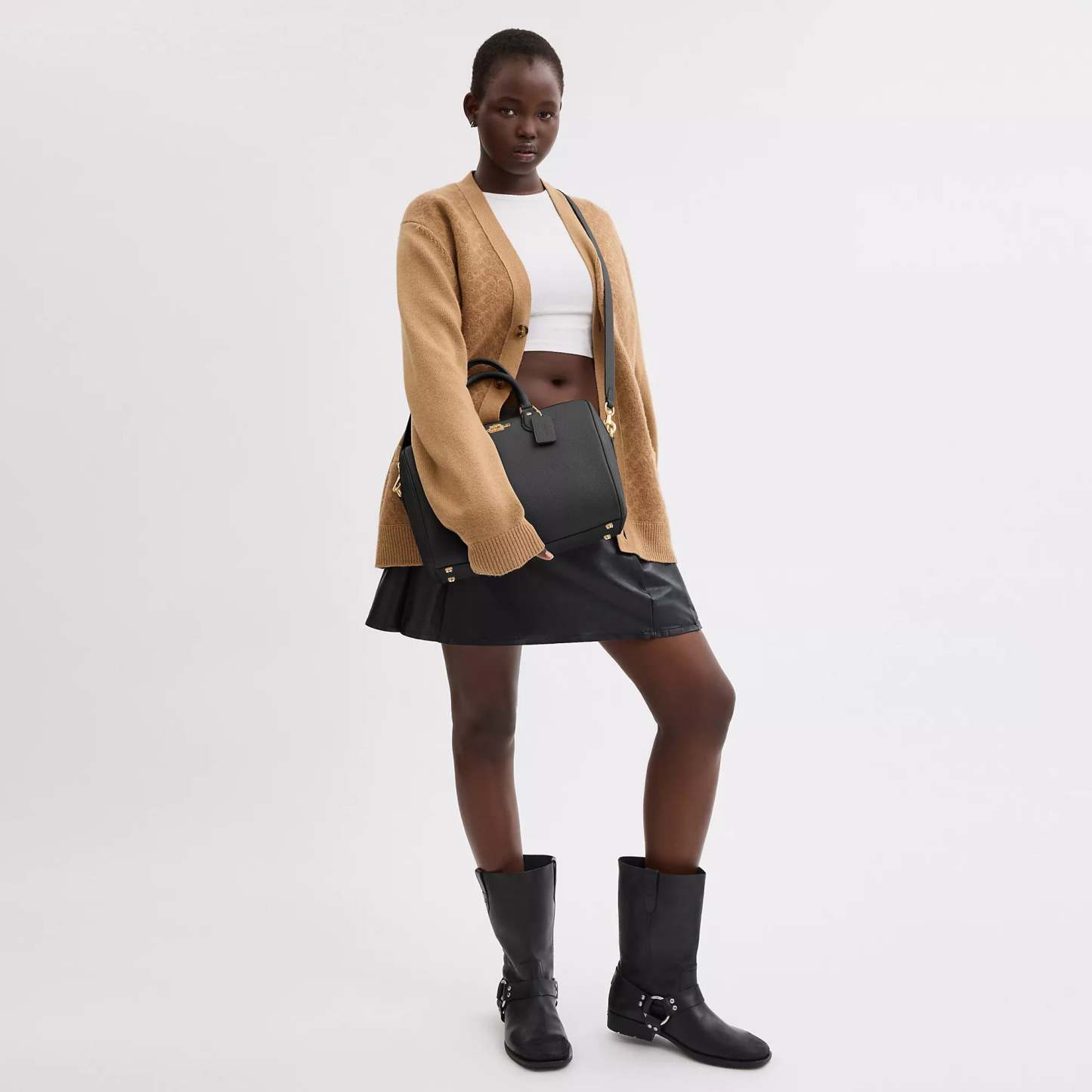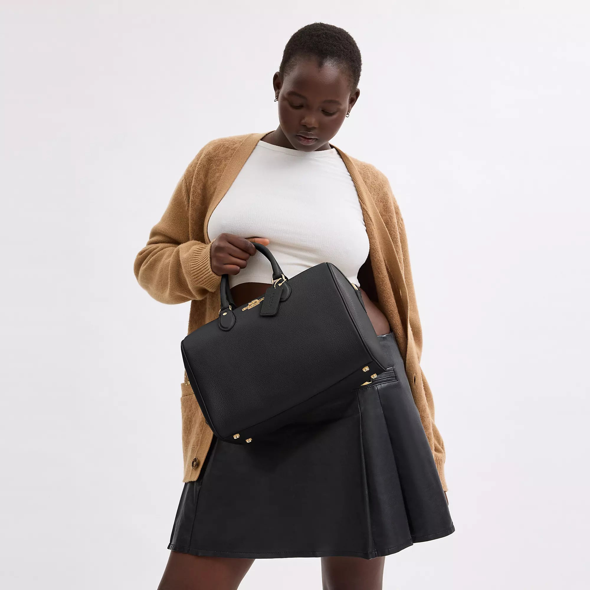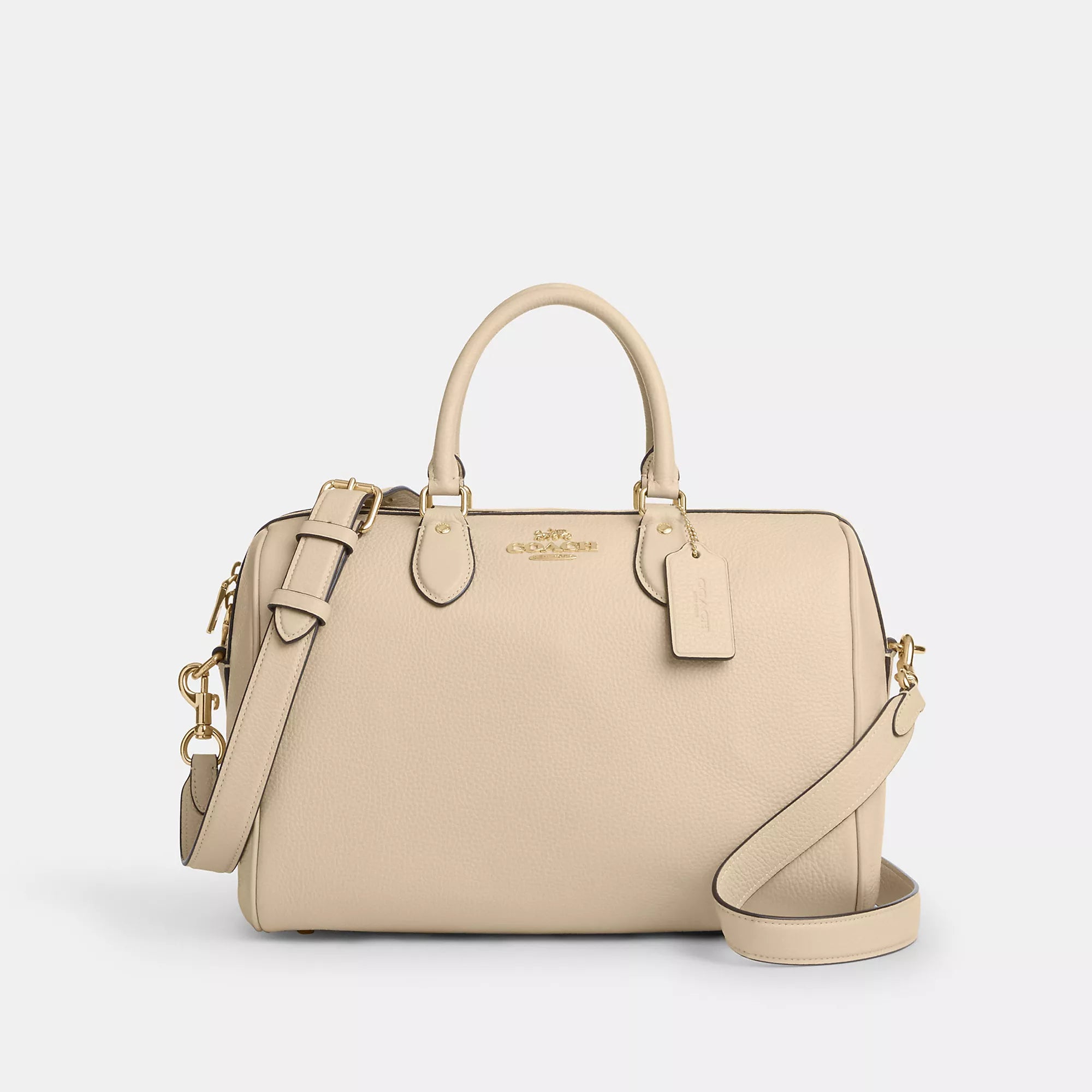 Refined pebble leather Inside snap and zip pockets Zip closure fabric lining Handle with 4 1/2 drop Outside zip pocket Detachable strap with 20 drop for shoulder or crossbody wear 11 3/4 (L) x 8 1/4 (H) x 7 (W) Style No. CV960 | Coach Outlet Rowan Large Satchel Bag - Black