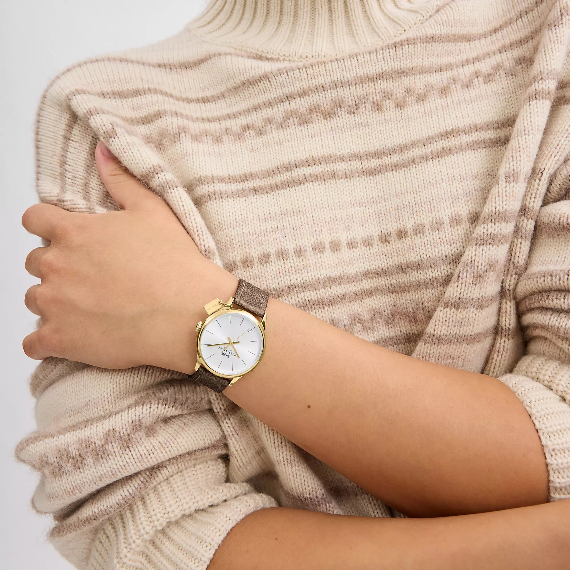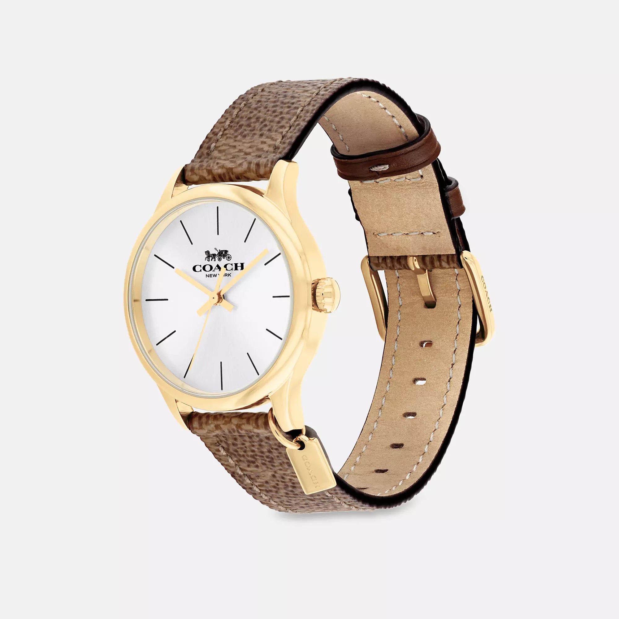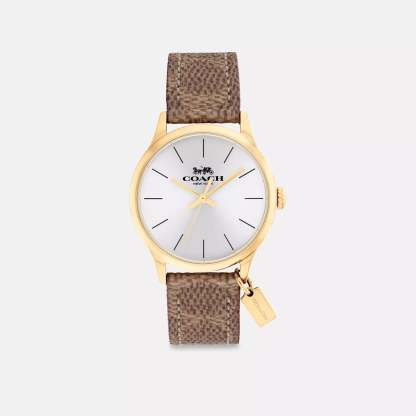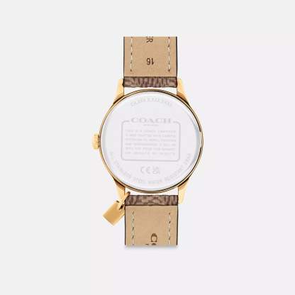Gold tone case and Signature coated canvas strap Approx. case diameter - 32mm Mineral crystal Quartz movement Buckle closure Water-resistant to 99 feet Style No. CX692 | Coach Outlet Ruby Watch, - Beige, Size - 32 Mm