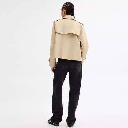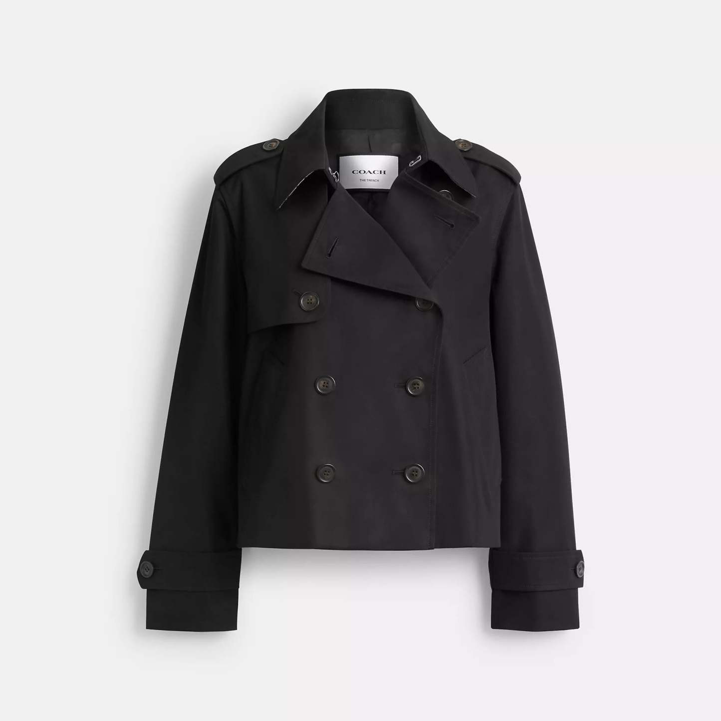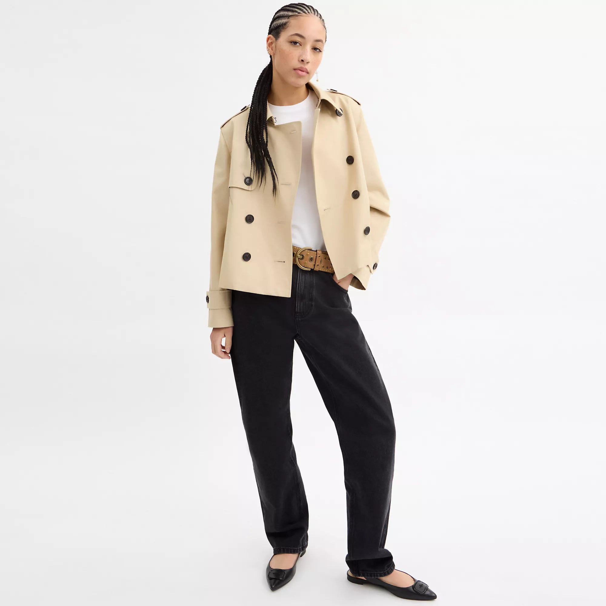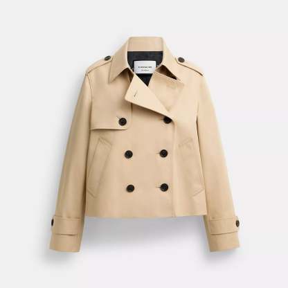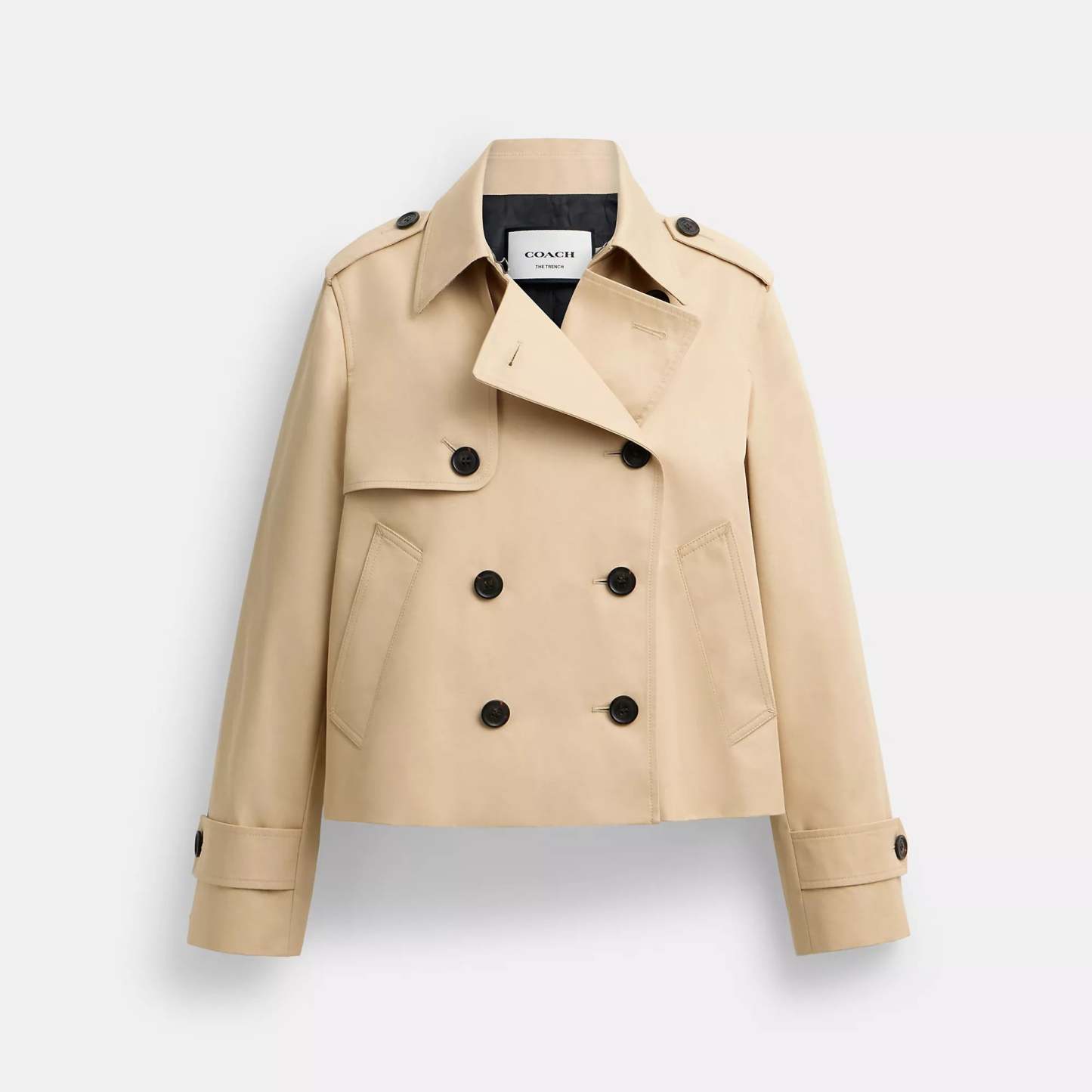 70% cotton 30% polyester Body lining - 58% polyester 42% viscose Sleeve lining/facings/pocket lining - 56% polyester 44% viscose Button closure Slip pockets Length - 22 Dry clean Model is 6'2 (188cm) chest 37 (94cm) waist 28 (71cm) hips 28 (71cm) and wears a size S Style No. CAB93 | Coach Outlet Short Trench - Beige, Size - Large