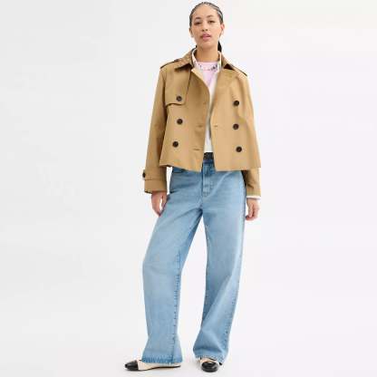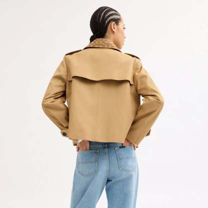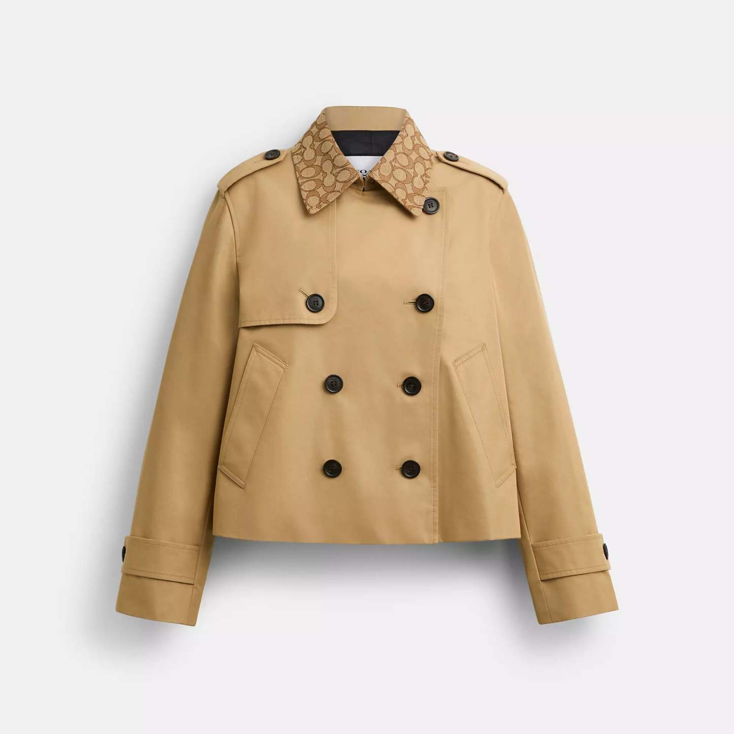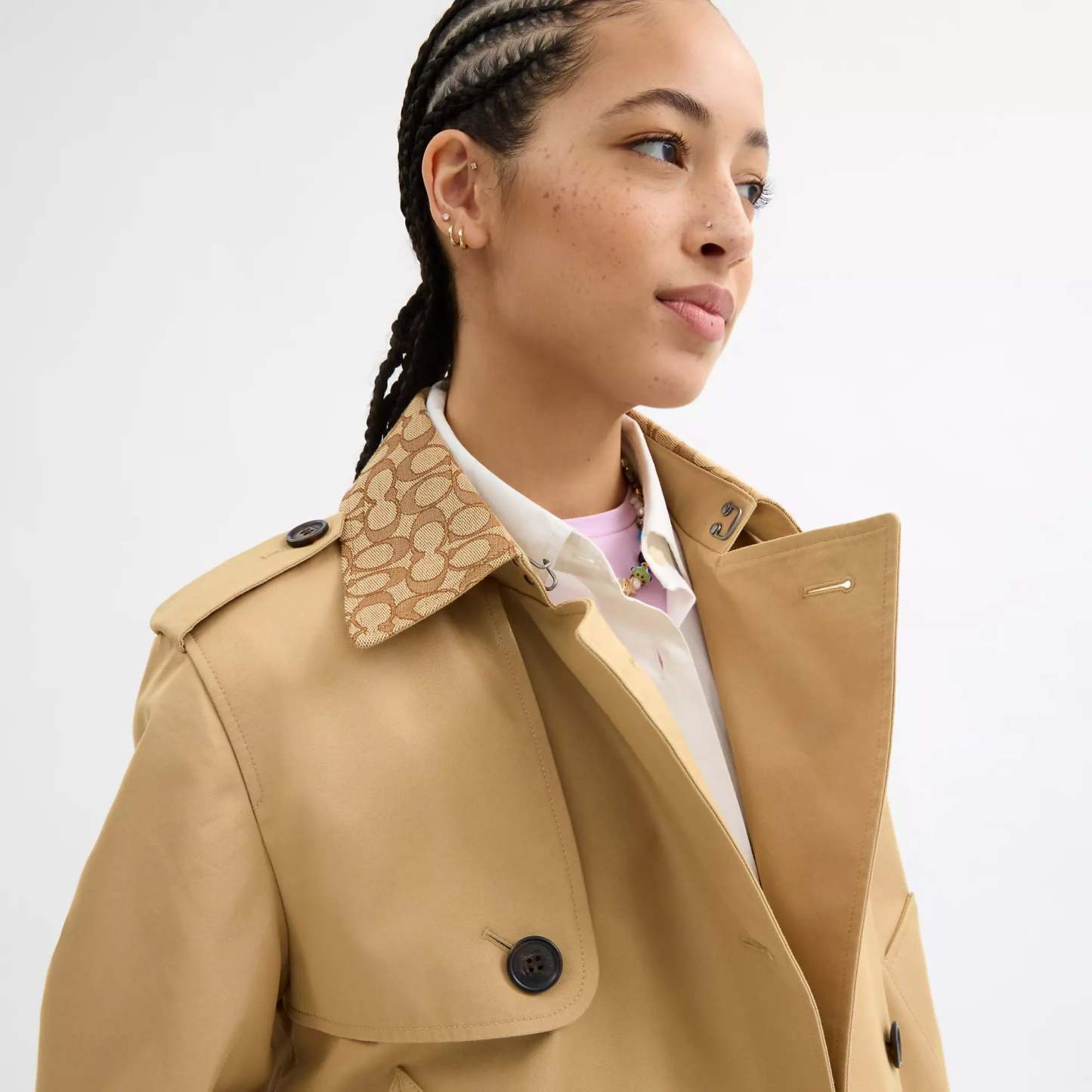 70% cotton 30% polyester Body lining - 58% polyester 42% viscose Sleeves lining/facings/pocket lining - 56% polyester 44% viscose Button closure Slip pockets Length - 22 Dry clean Model is 5'10 (178cm) chest 31 (79cm) waist 24 (61cm) hips 35 (89cm) and wears a size S Style No. CAB91 | Coach Outlet Short Trench Coat With Signature Collar - Beige, Size - Medium