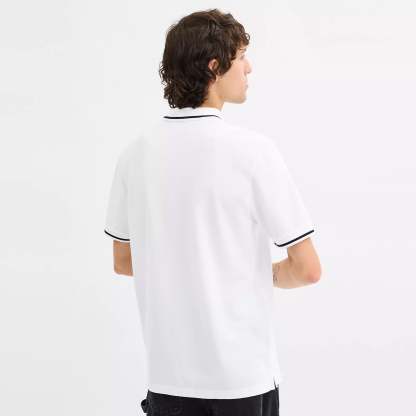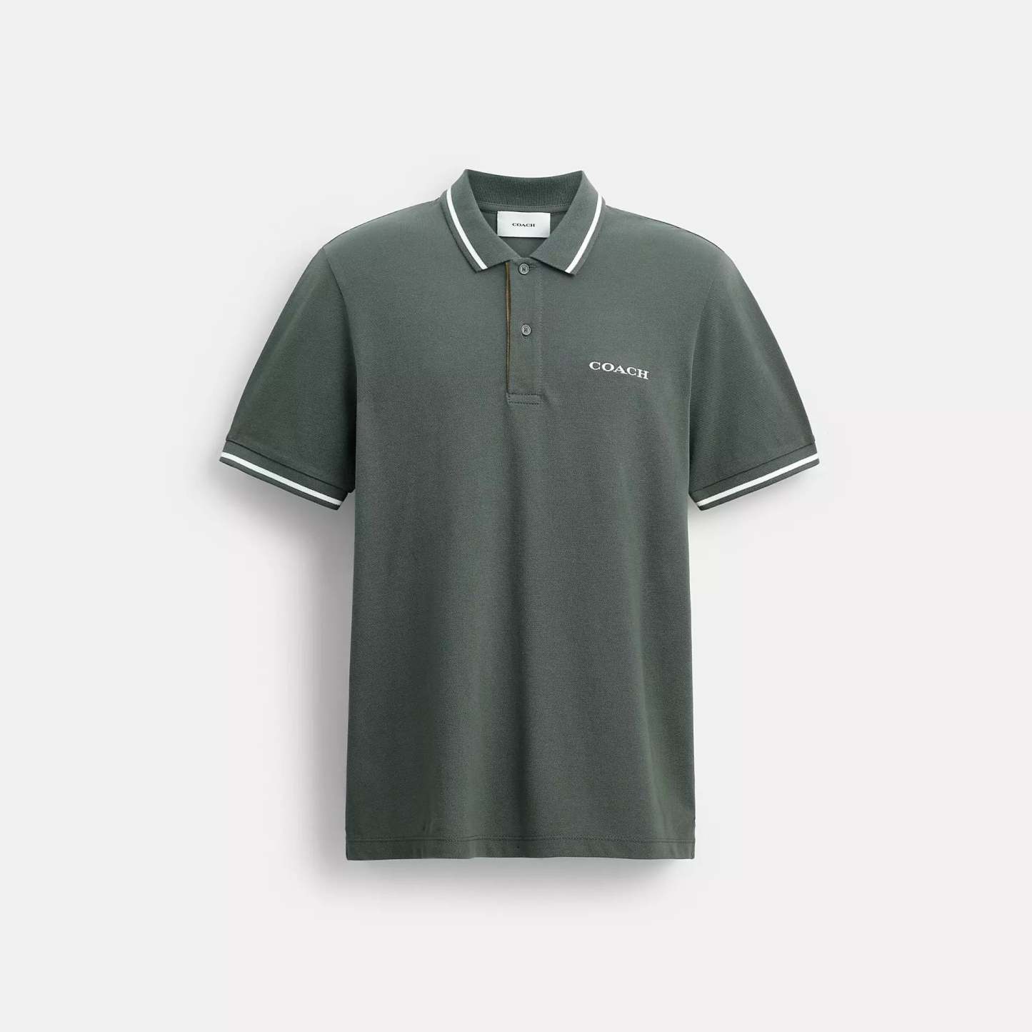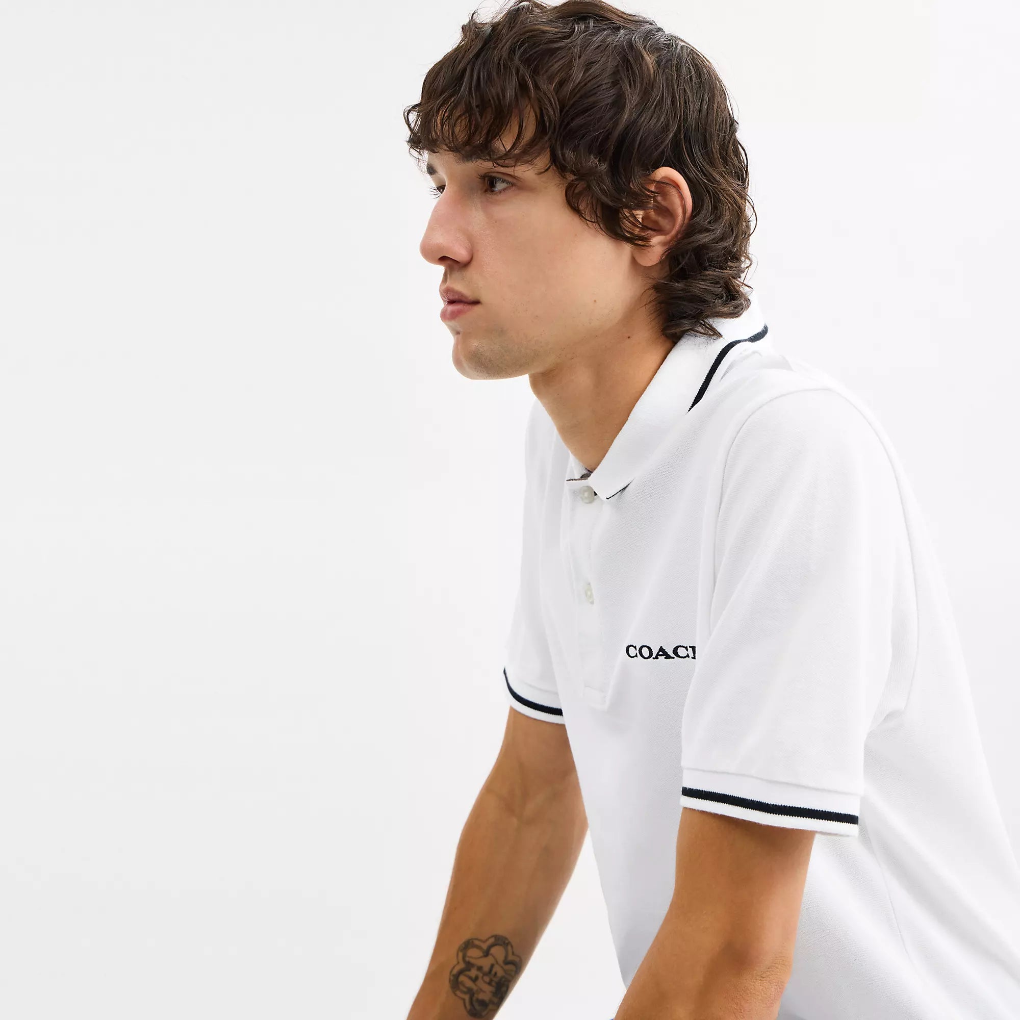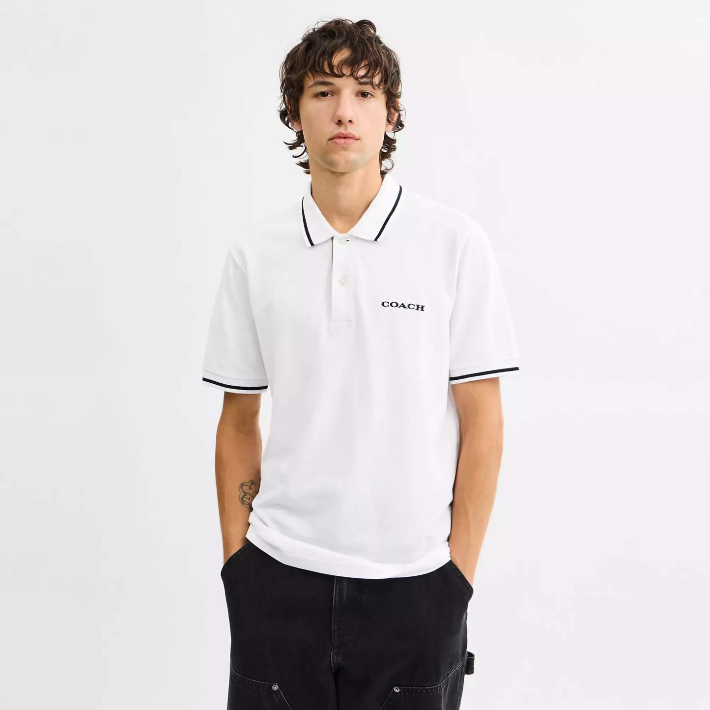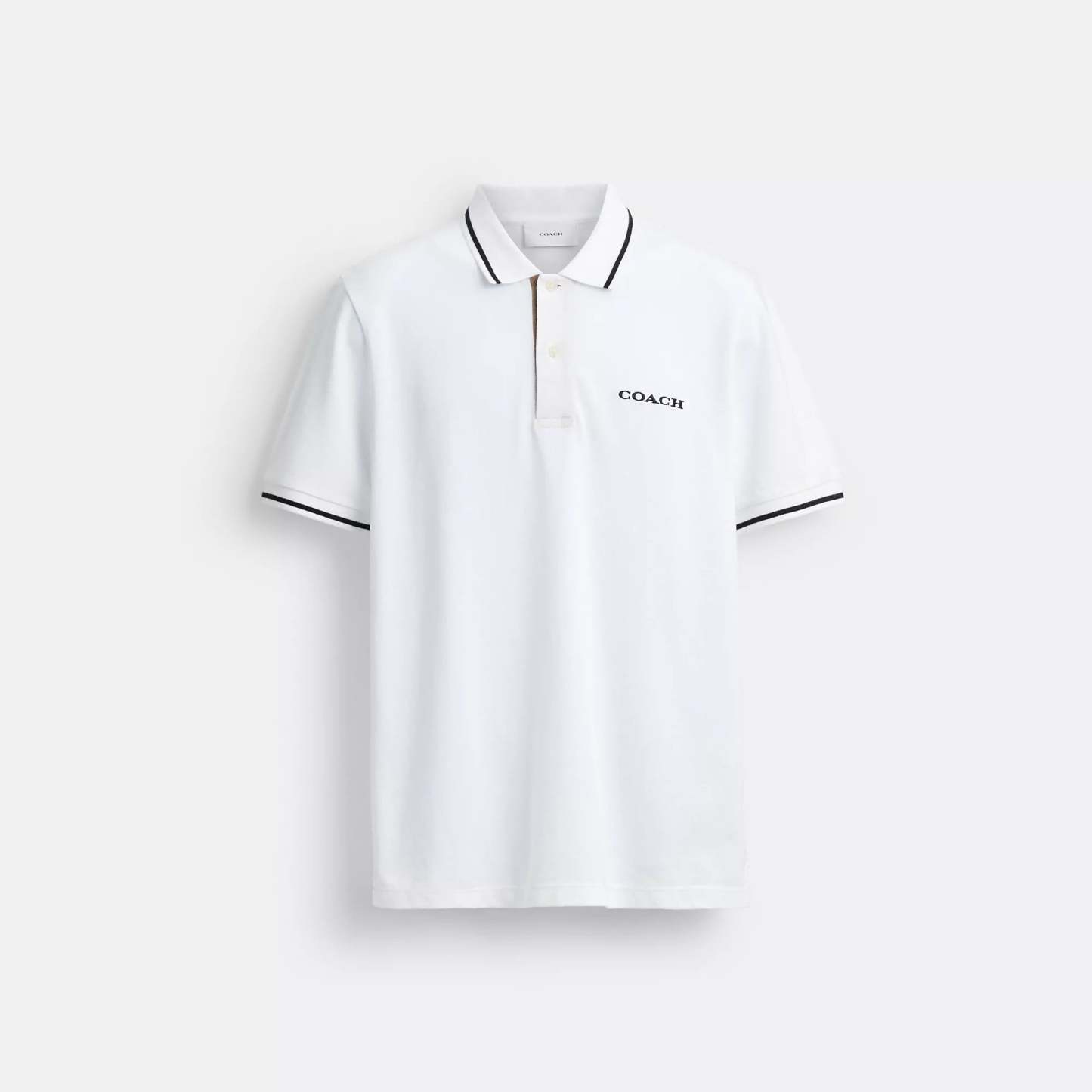 100% organic cotton Button closure Length - 28 1/4 Machine wash Model is 6'2 (188cm) chest 37 (94cm) waist 28 (71cm) hips 28 (71cm) and wears a size M Style No. CBW44 | Coach Outlet Signature Trim Polo In Organic Cotton - White, Size - Large