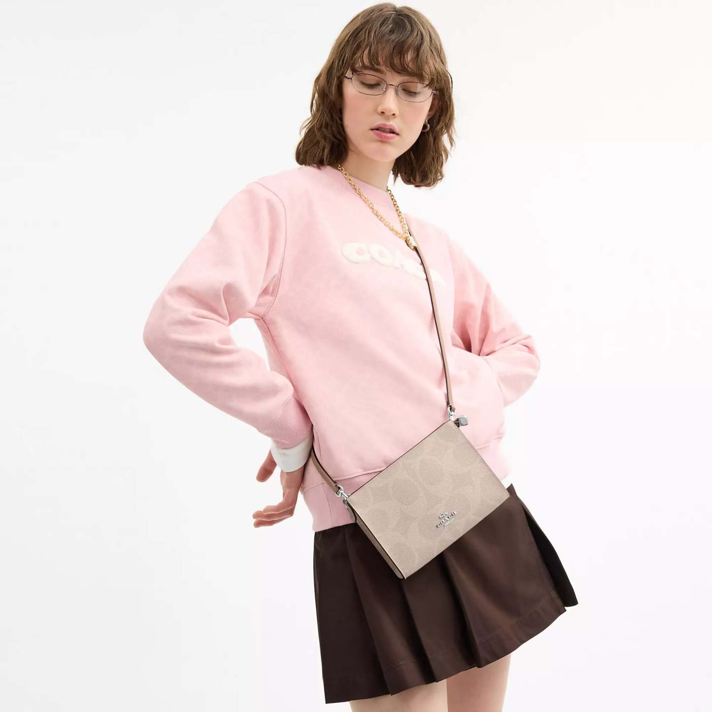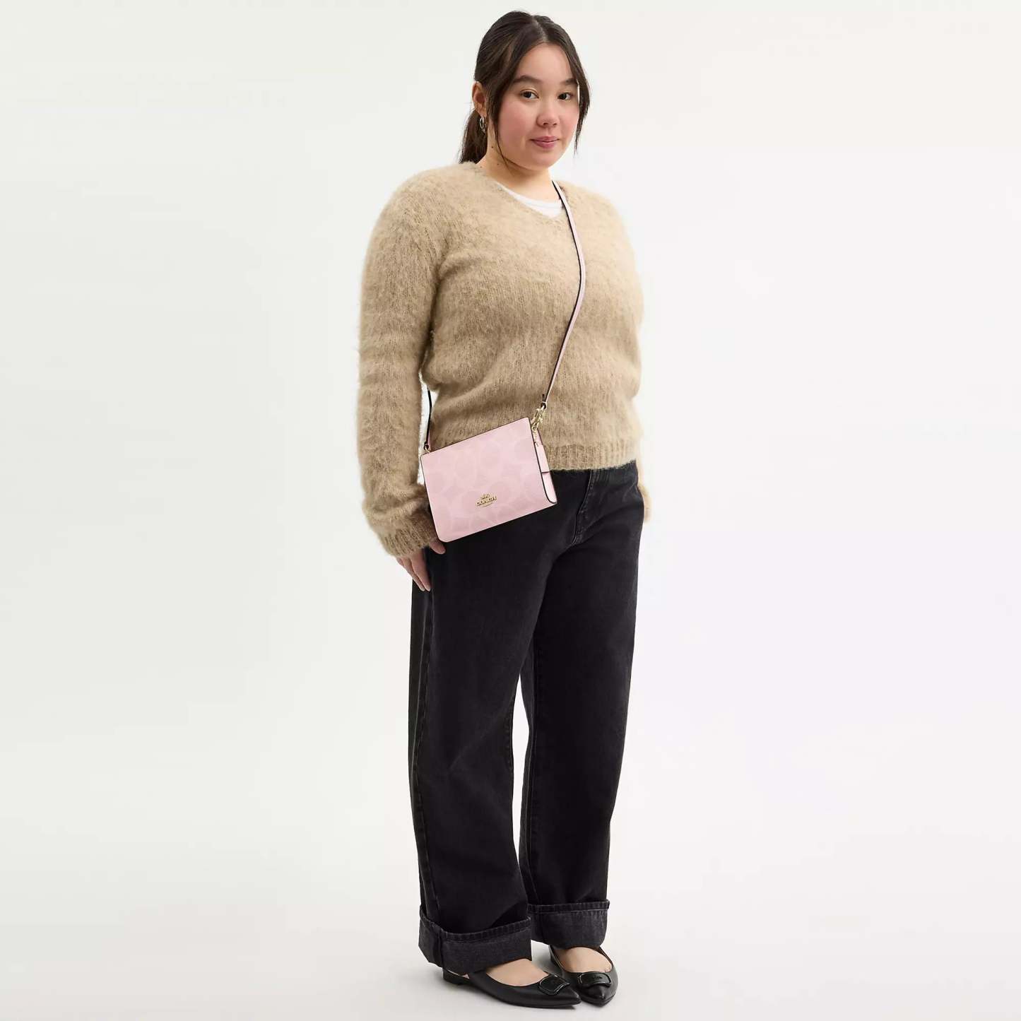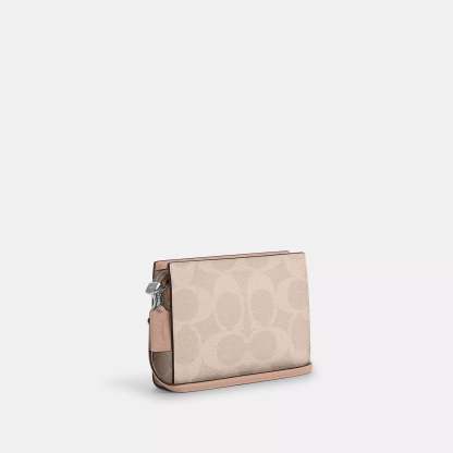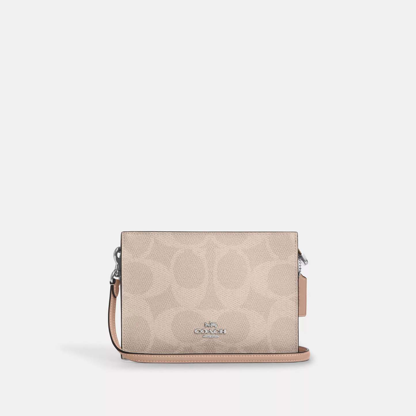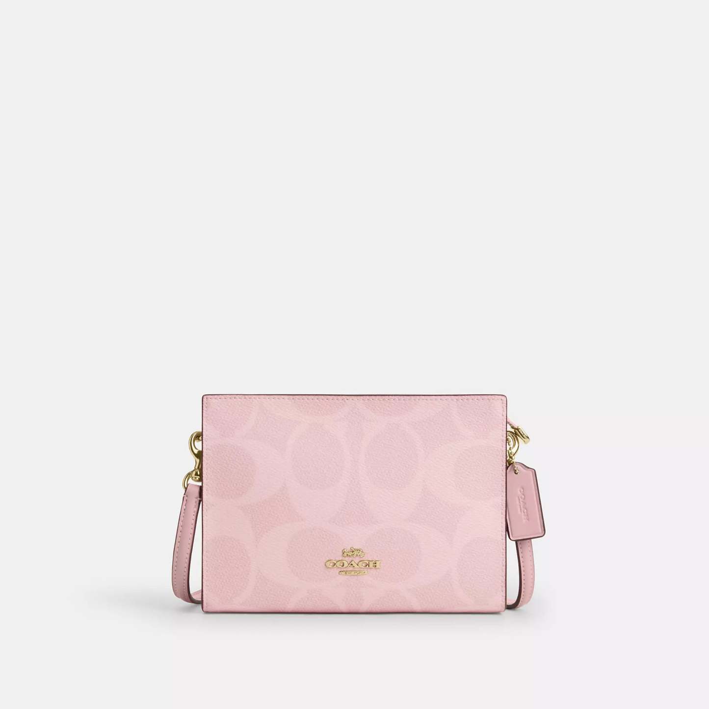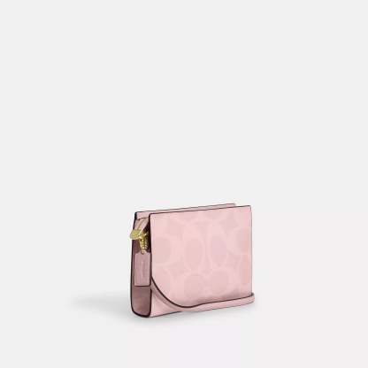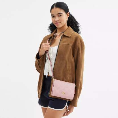 Signature coated canvas Two credit card slots Zip-top closure fabric lining Chain strap with 22 1/2 drop for shoulder or crossbody wear 7 3/4 (L) x 5 1/2 (H) x 1 1/4 (W) Style No. CAR12 | Coach Outlet Slim Crossbody Bag In Signature Canvas - Pink