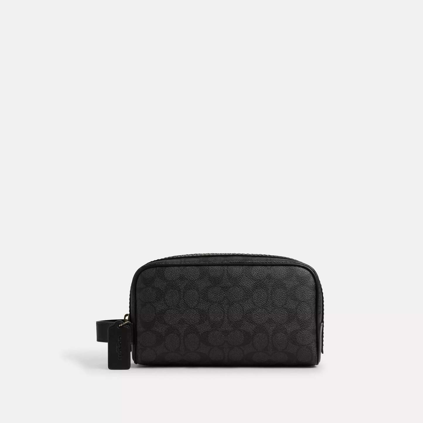 Signature coated canvas and smooth calf leather Inside multifunction pocket Zip closure fabric lining Handle with 2 1/4 drop Outside open pocket 8 3/4 (L) x 5 (H) x 3 1/4 (W) Style No. CAR15 | Coach Outlet Small Travel Kit In Signature Canvas - Multi