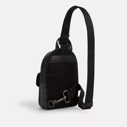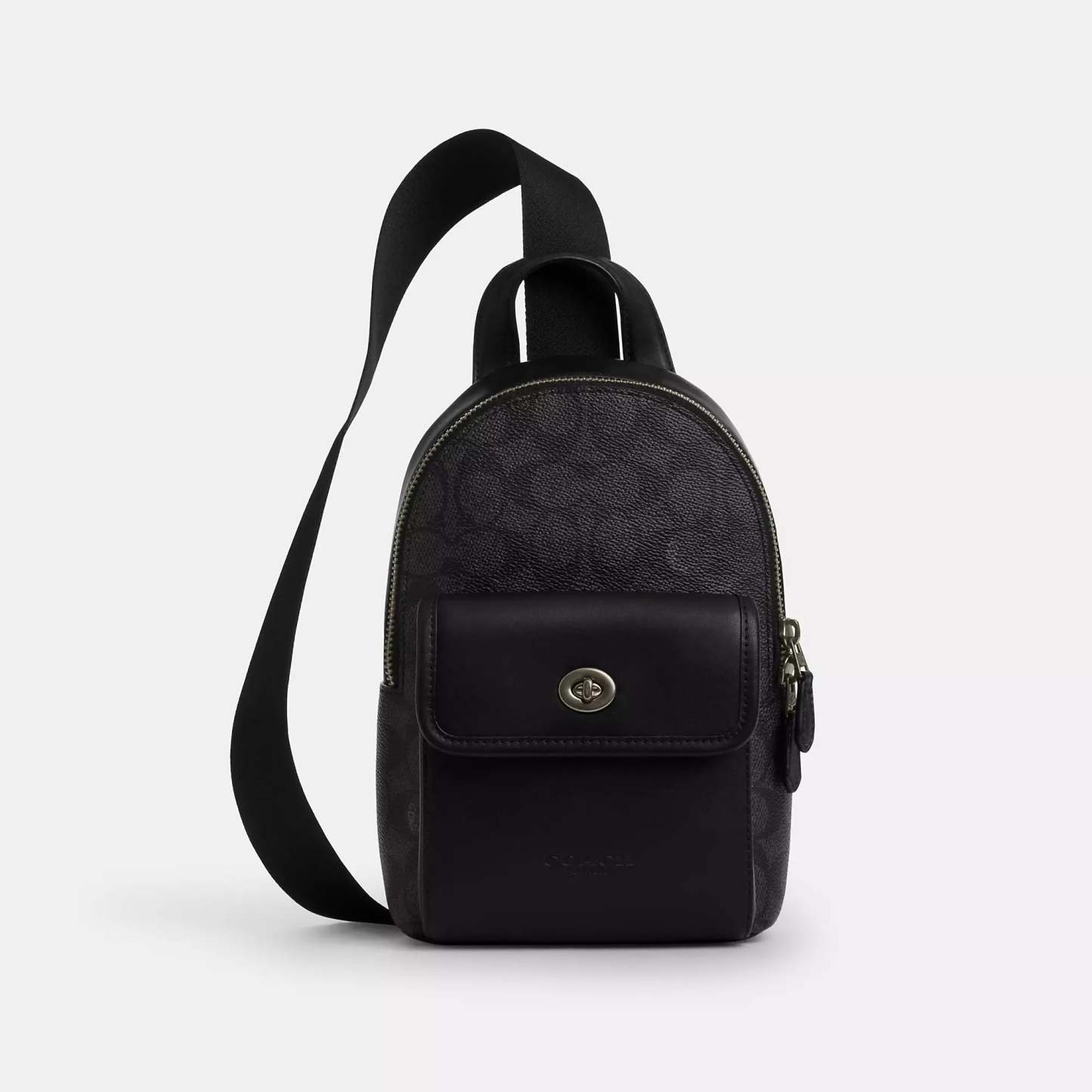Signature coated canvas and smooth calf leather Zip closure fabric lining Top handle with 1 1/2 drop Outside turnlock pocket Adjustable shoulder strap with 53 1/2 length for crossbody wear (clip left or right) 6 1/4 (L) x 9 1/4 (H) x 3 3/4 (W) Style No. CAJ29 | Coach Outlet Small Turnlock Sling Pack In Signature Canvas - Black