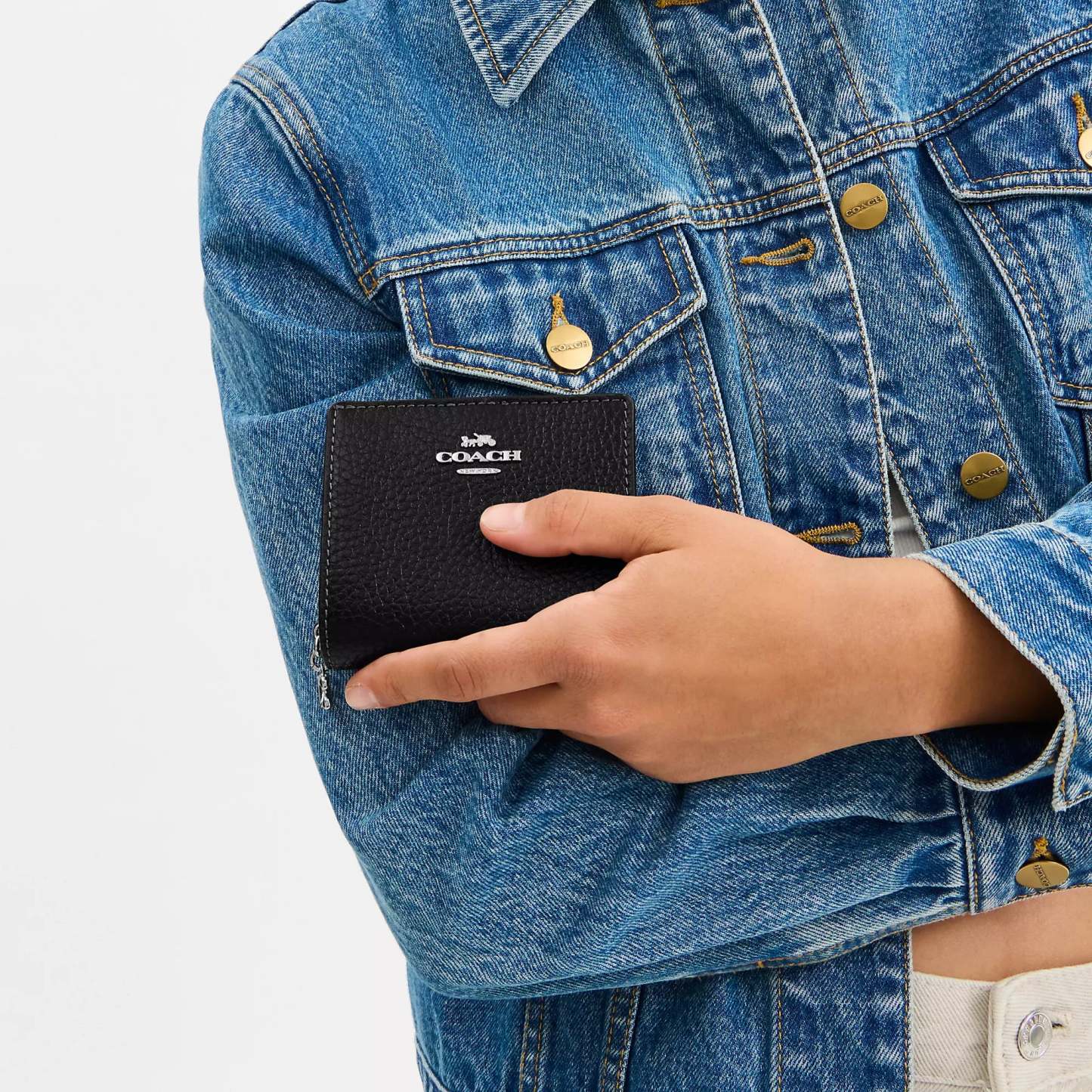 Shiny pebble leather Three credit card slots ID window Full-length bill compartment Snap closure Outside zip coin pocket 4 1/4 (L) x 3 1/2 (H) x 1 (W) Style No. CBO77 | Coach Outlet Snap Wallet - Black