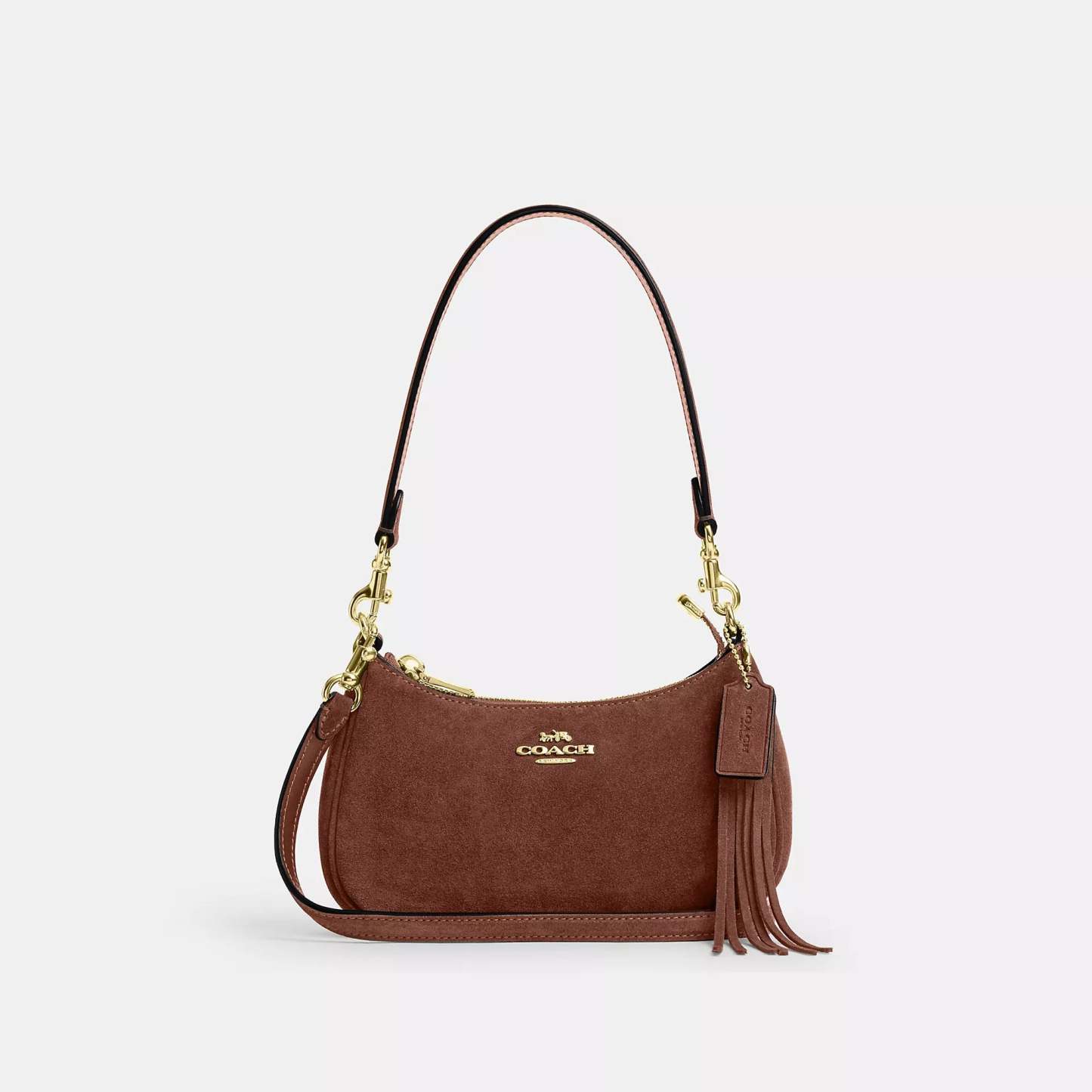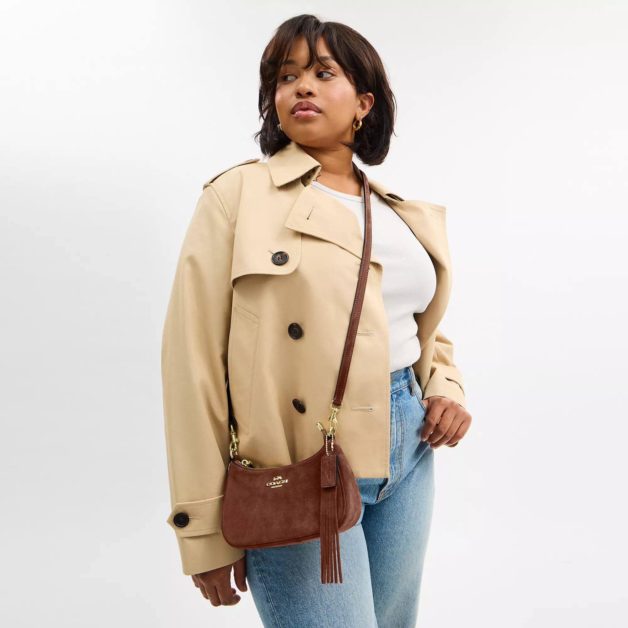 Suede and smooth leather Two credit card slots Inside snap pocket Zip-top closure fabric lining Detachable short strap with 8 3/4 drop Detachable long strap with 22 1/2 drop for shoulder or crossbody wear 7 3/4 (L) x 5 (H) x 2 1/4 (W) Style No. CCE42 | Coach Outlet Teri Mini Crossbody Bag - Brown