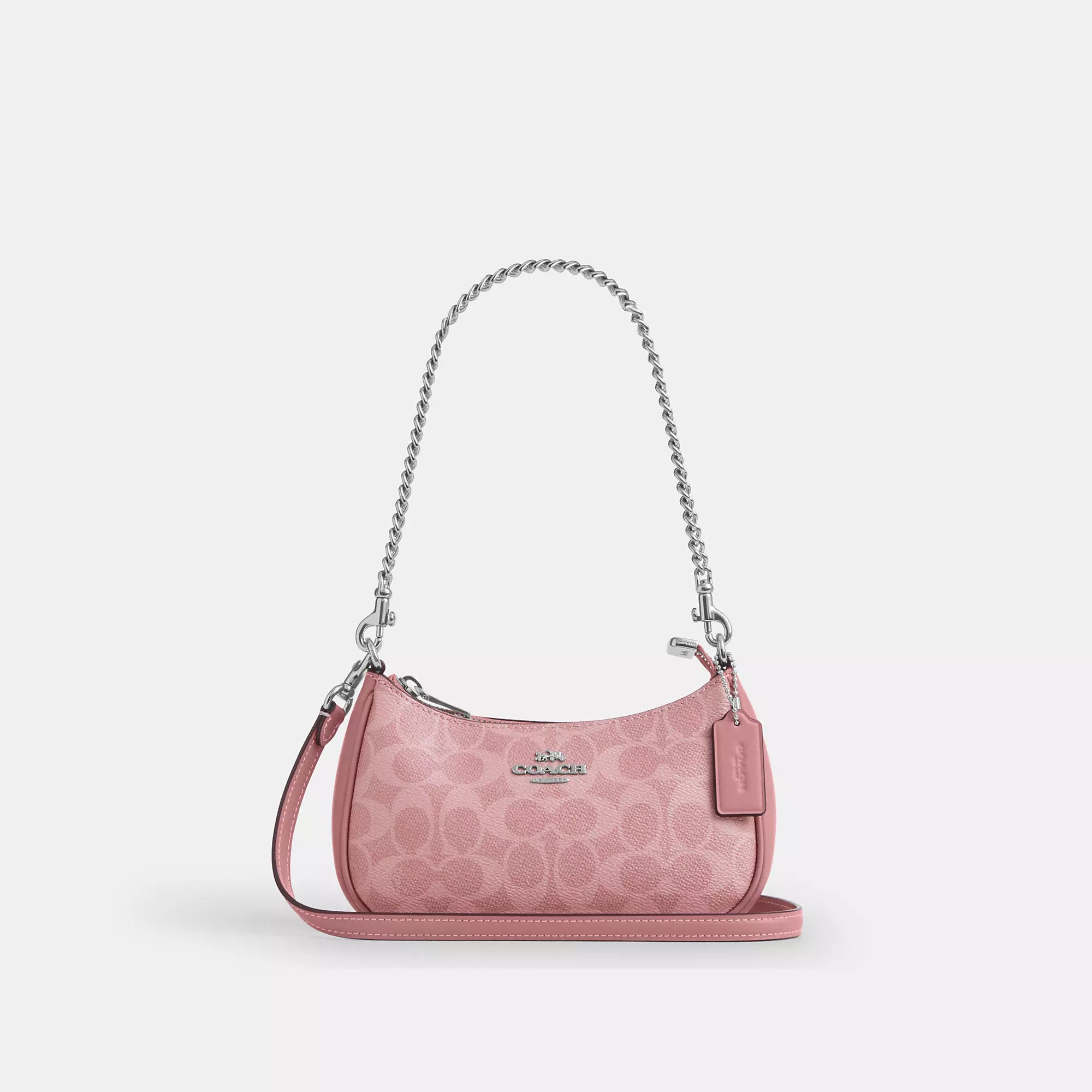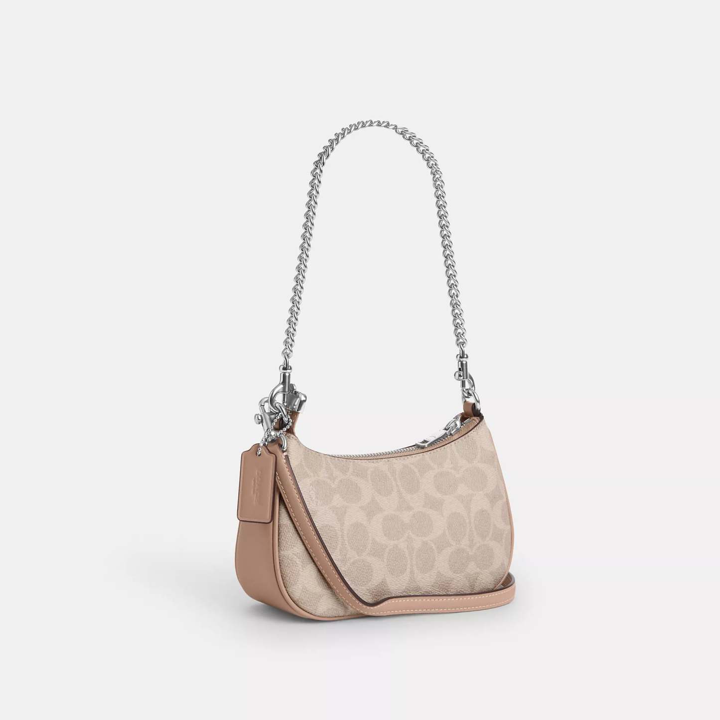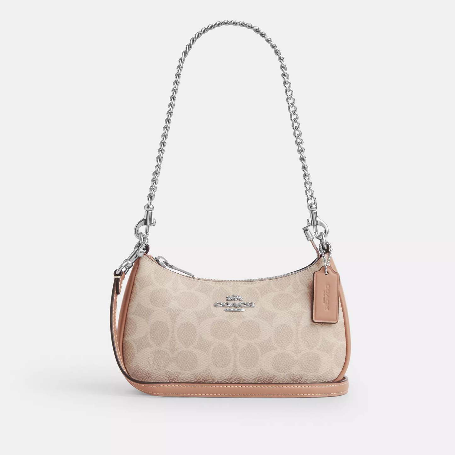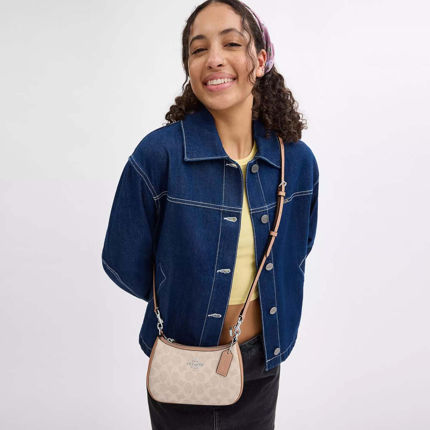 Signature coated canvas Two credit card slots Inside snap pocket Zip closure fabric lining Detachable short strap with 8 3/4 drop Detachable long strap with 22 1/2 drop for shoulder or crossbody wear 7 3/4 (L) x 5 (H) x 2 1/4 (W) Style No. CW323 | Coach Outlet Teri Mini Crossbody Bag In Signature Canvas - White