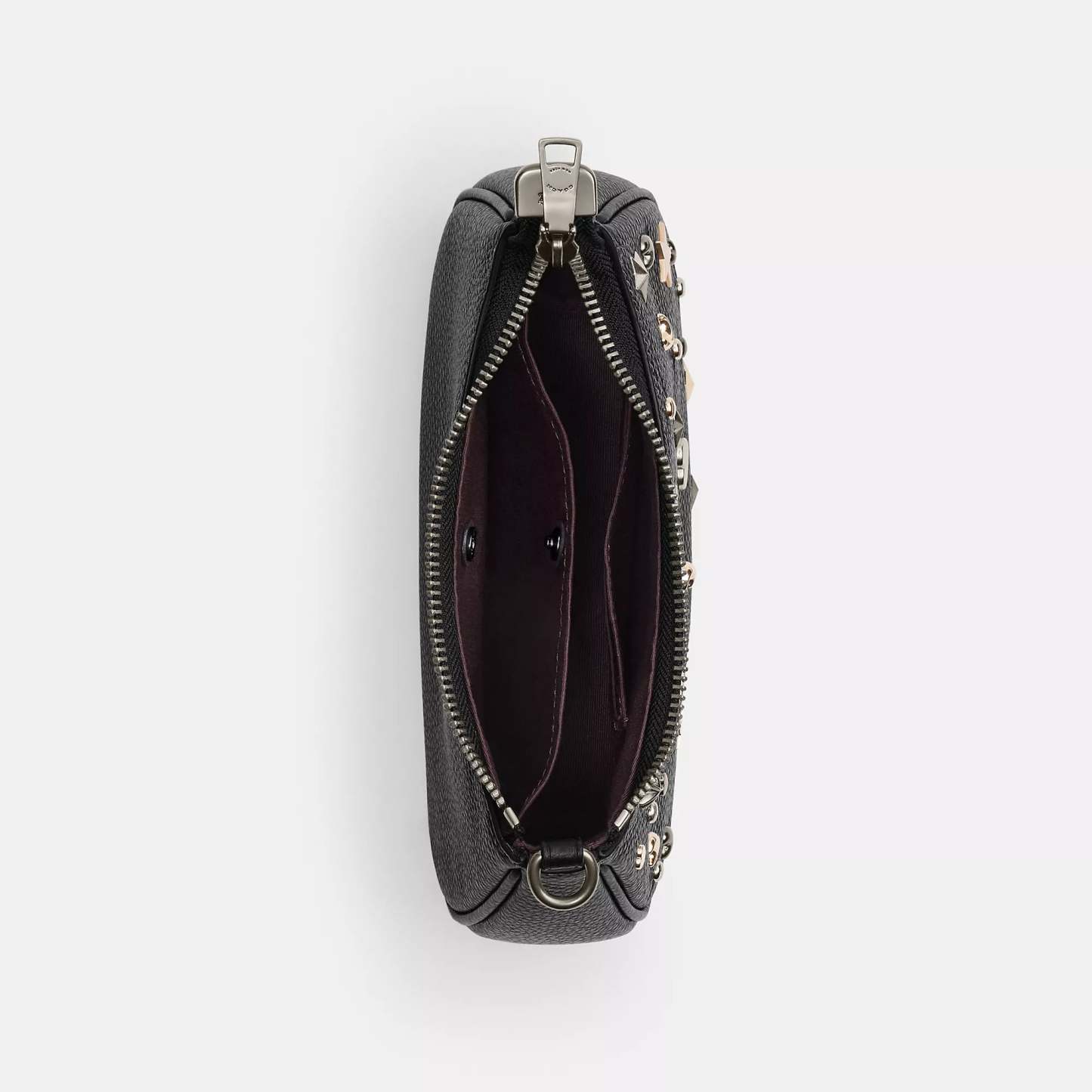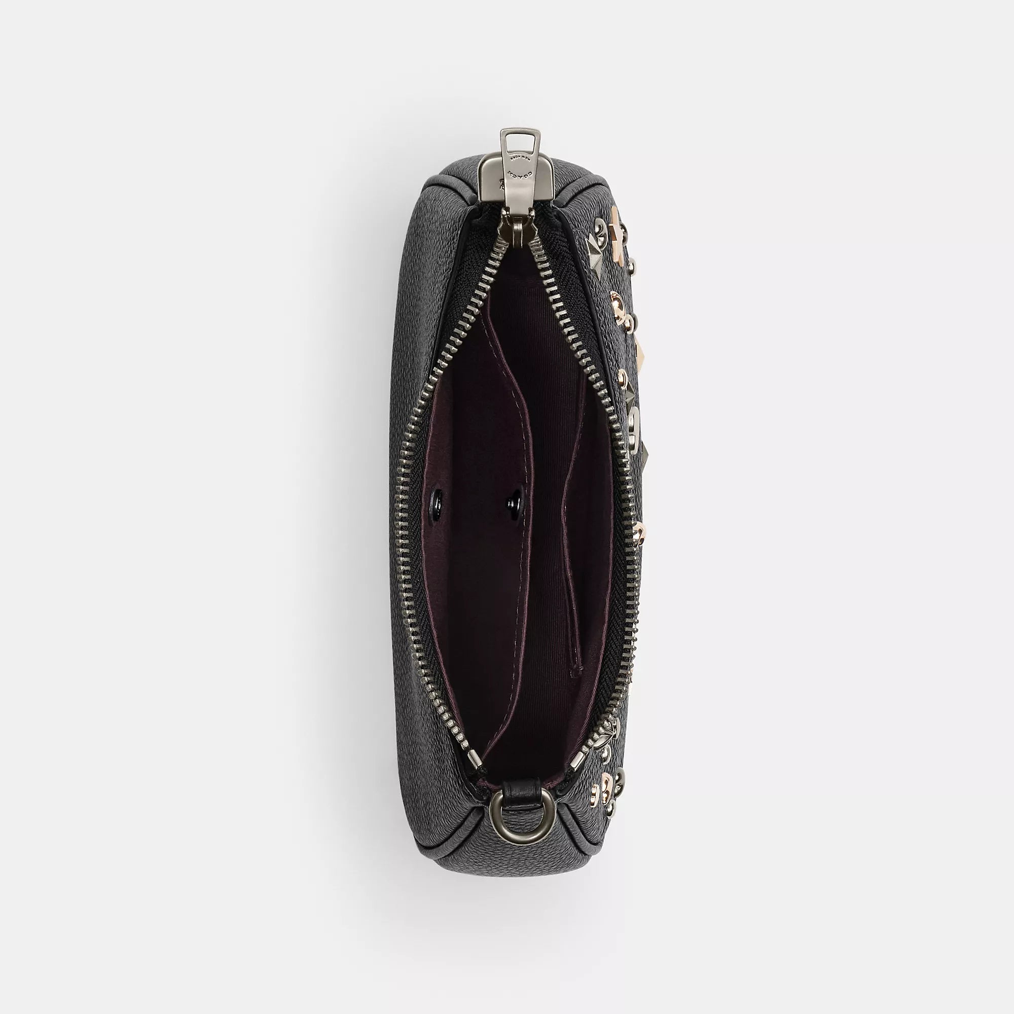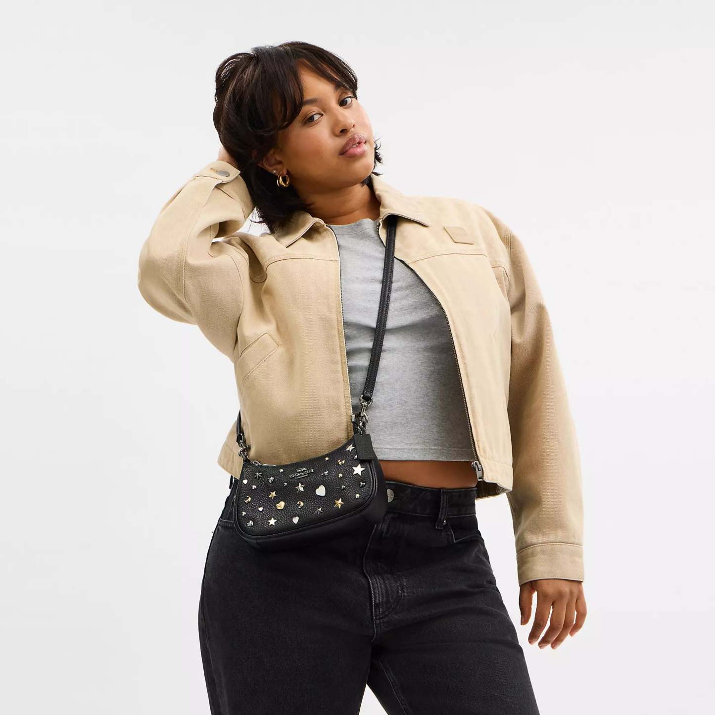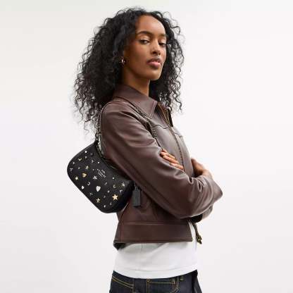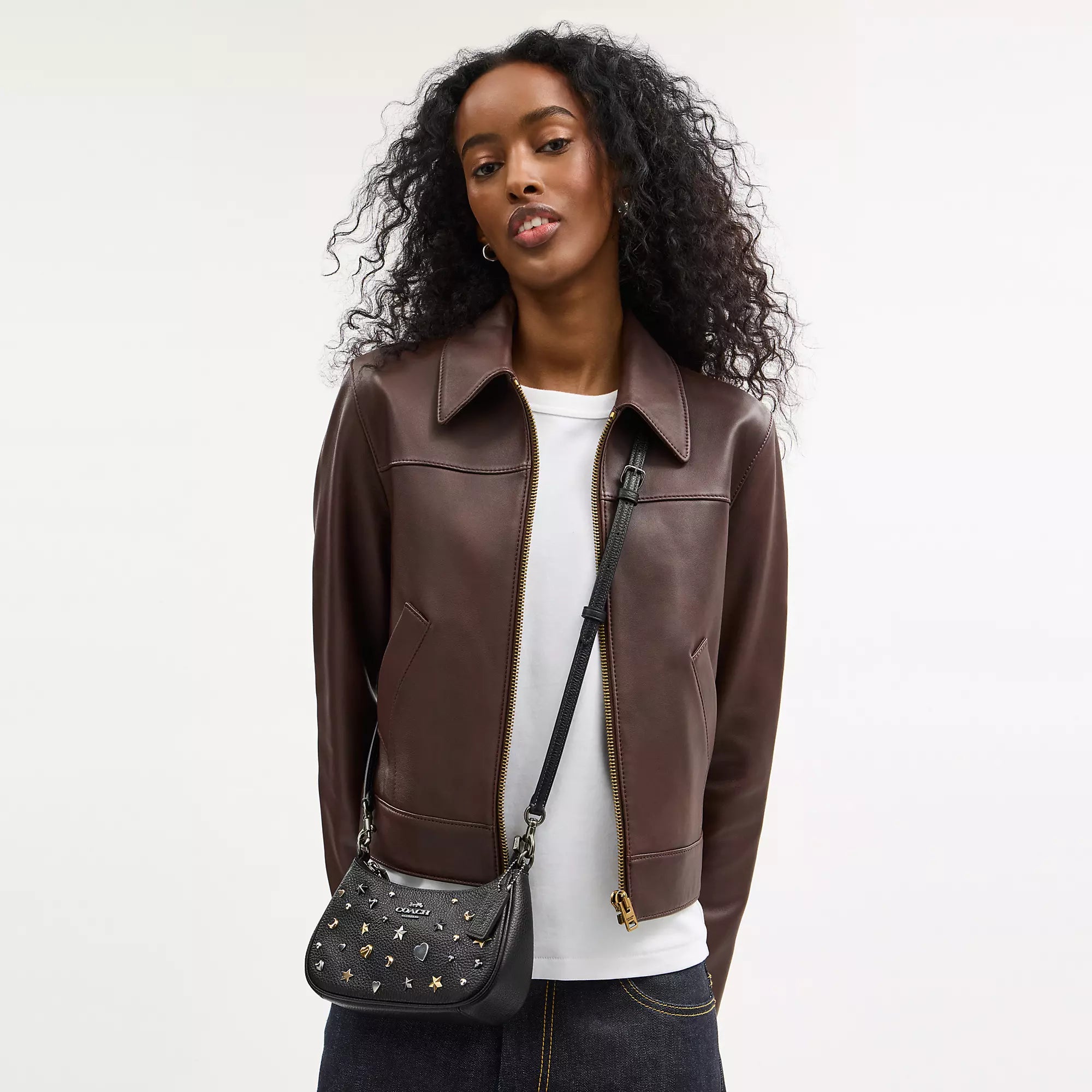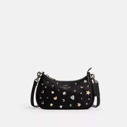 Refined pebble leather Two credit card slots Inside snap pocket Zip-top closure fabric lining Detachable short strap with 8 3/4 drop Detachable long strap with 22 1/2 drop for shoulder or crossbody wear 7 3/4 (L) x 5 (H) x 2 1/4 (W) Style No. CCE44 | Coach Outlet Teri Mini Crossbody Bag With Rivets - Black