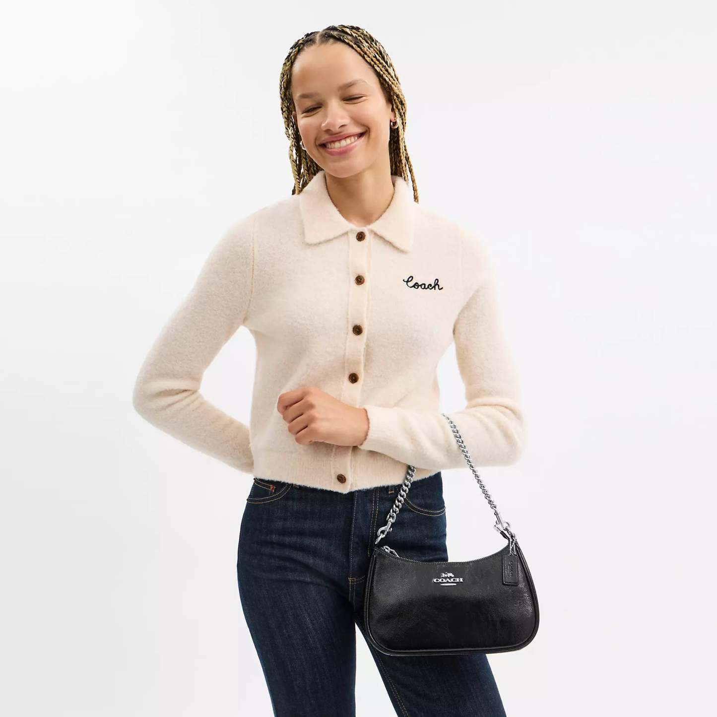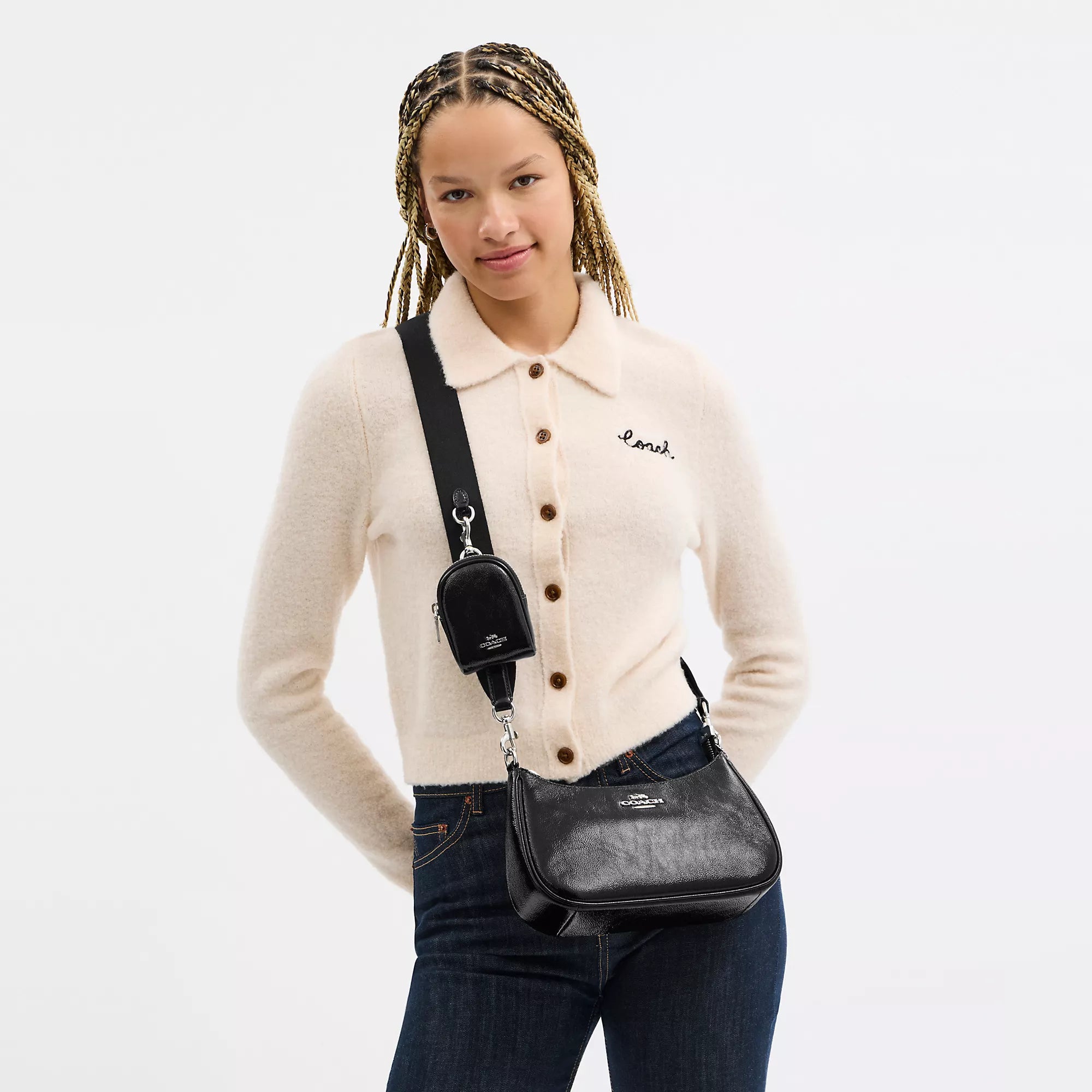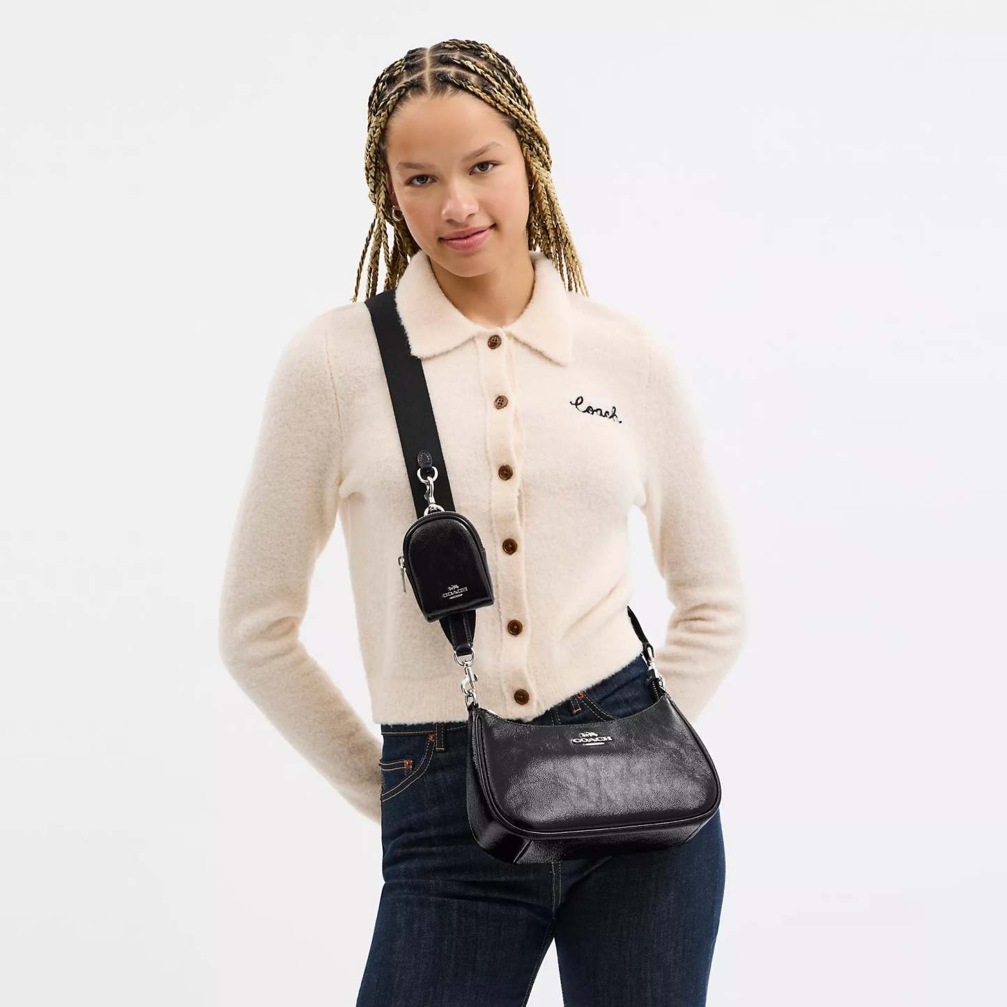 Crinkle patent leather Inside multifunction pocket Zip-top closure fabric lining Detachable handle with 8 3/4 drop Detachable strap with 22 3/4 drop for shoulder or crossbody wear 9 1/2 (L) x 6 (H) x 3 (W) Removable pouch - 2 1/4 (L) x 4 (H) x 3/4 (W) Style No. CCD78 | Coach Outlet Teri Shoulder Bag With Pouch - Black