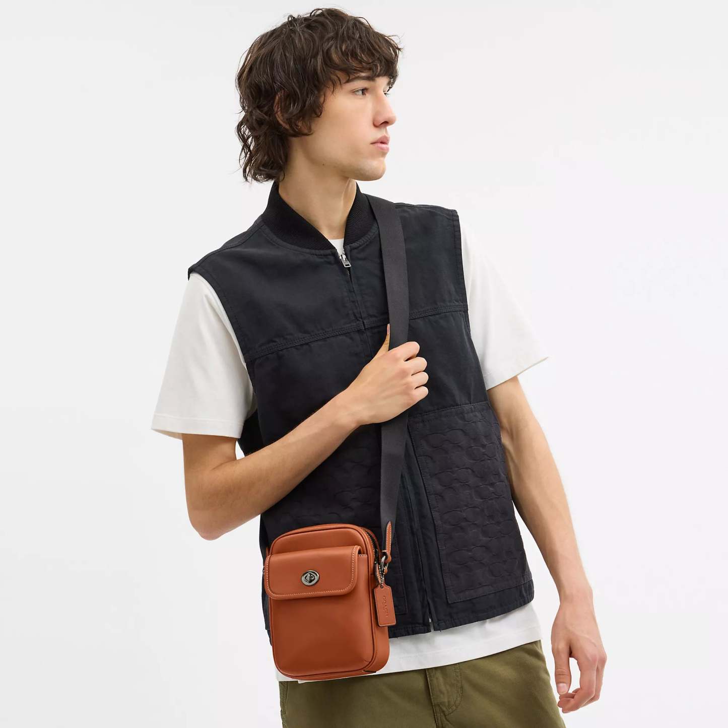 Smooth grain leather Inside multifunction pocket Zip closure fabric lining Outside turnlock and open pockets Adjustable strap with 28 drop for shoulder or crossbody wear 6 (L) x 8 (H) x 2 (W) Style No. CBI25 | Coach Outlet Turnlock Crossbody Bag - Beige