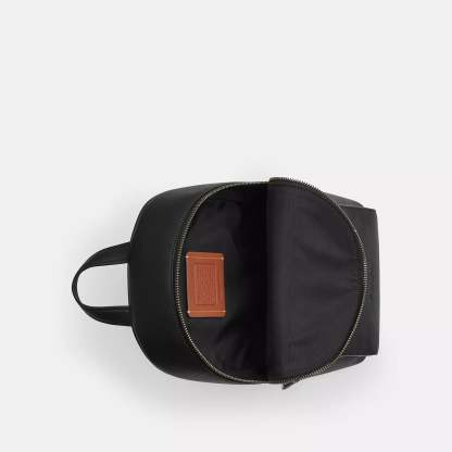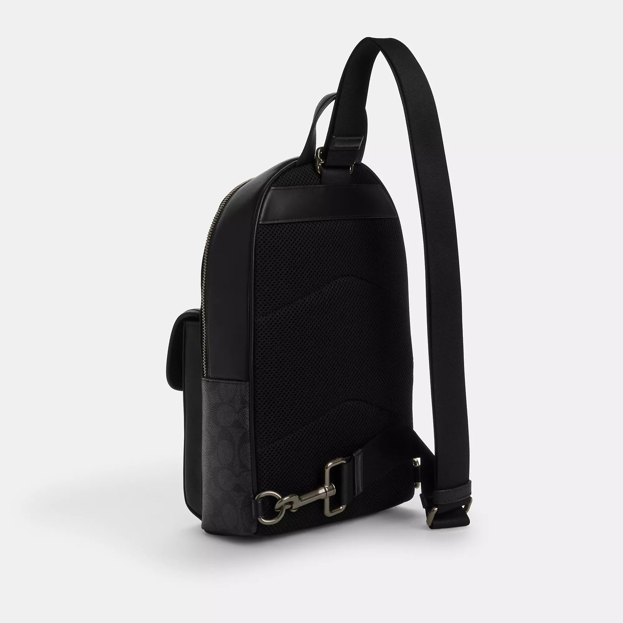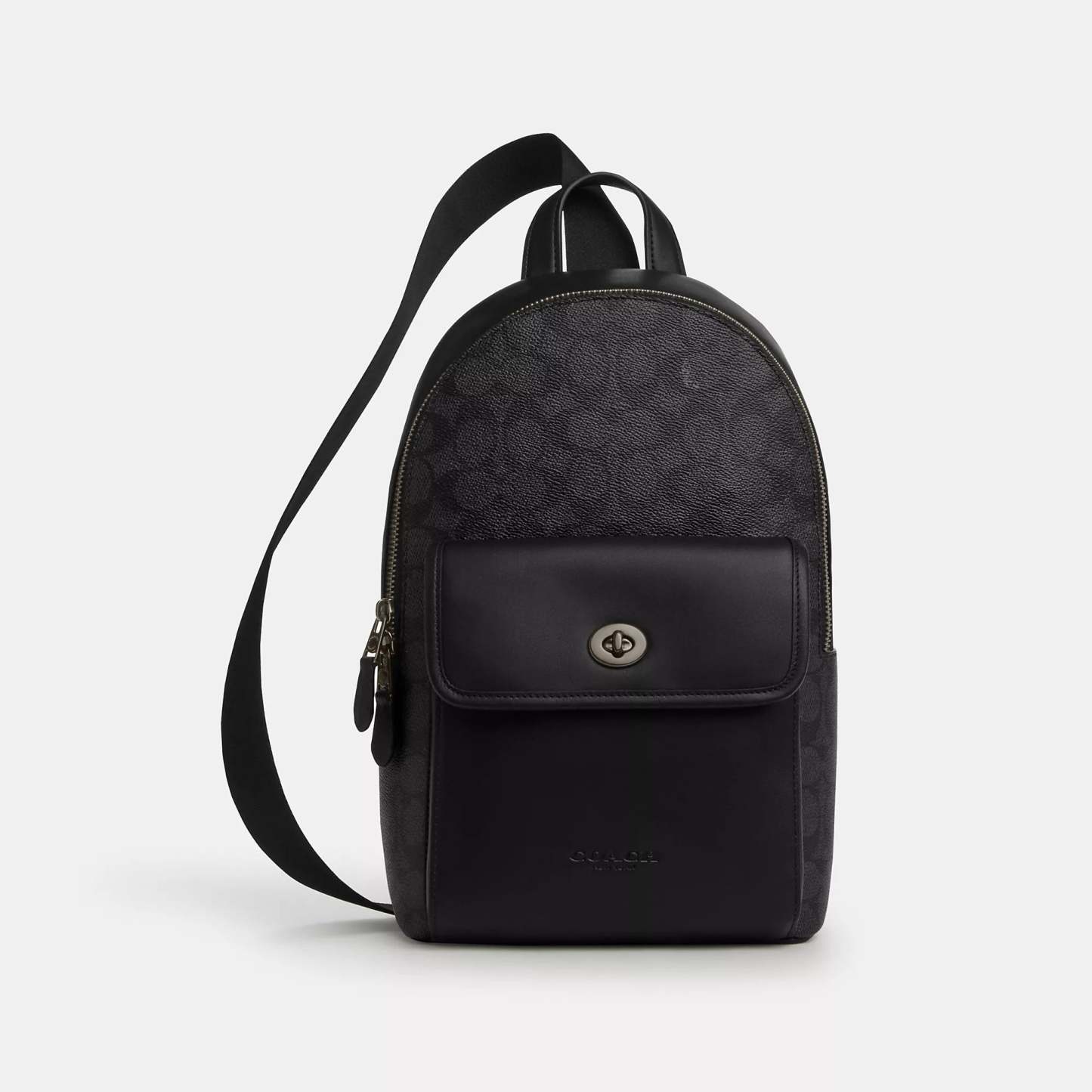 Signature coated canvas and smooth calf leather Zip closure fabric lining Outside turnlock pocket Top handle with 2 drop Adjustable shoulder strap with 50 1/2 length for crossbody wear (clip left or right) 8 1/2 (L) x 12 3/4 (H) x 5 (W) Style No. CAJ92 | Coach Outlet Turnlock Sling Pack In Signature Canvas - Black