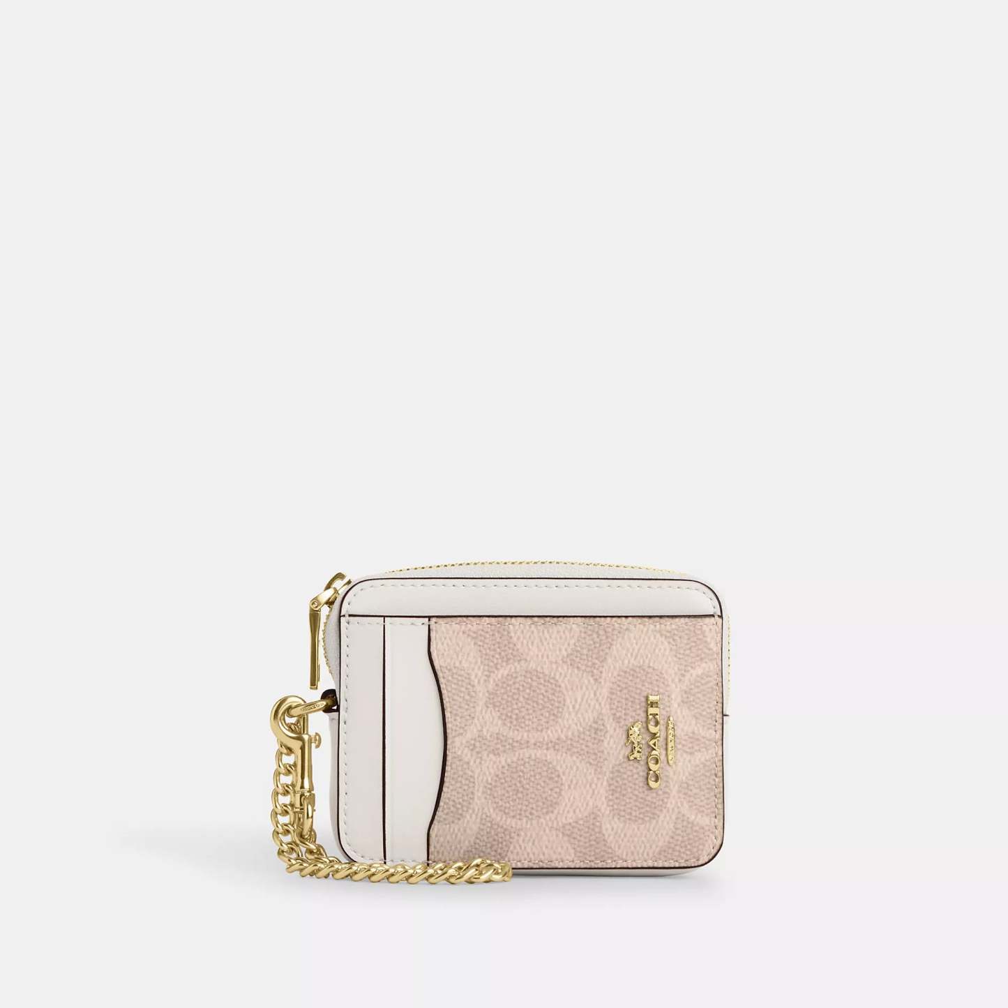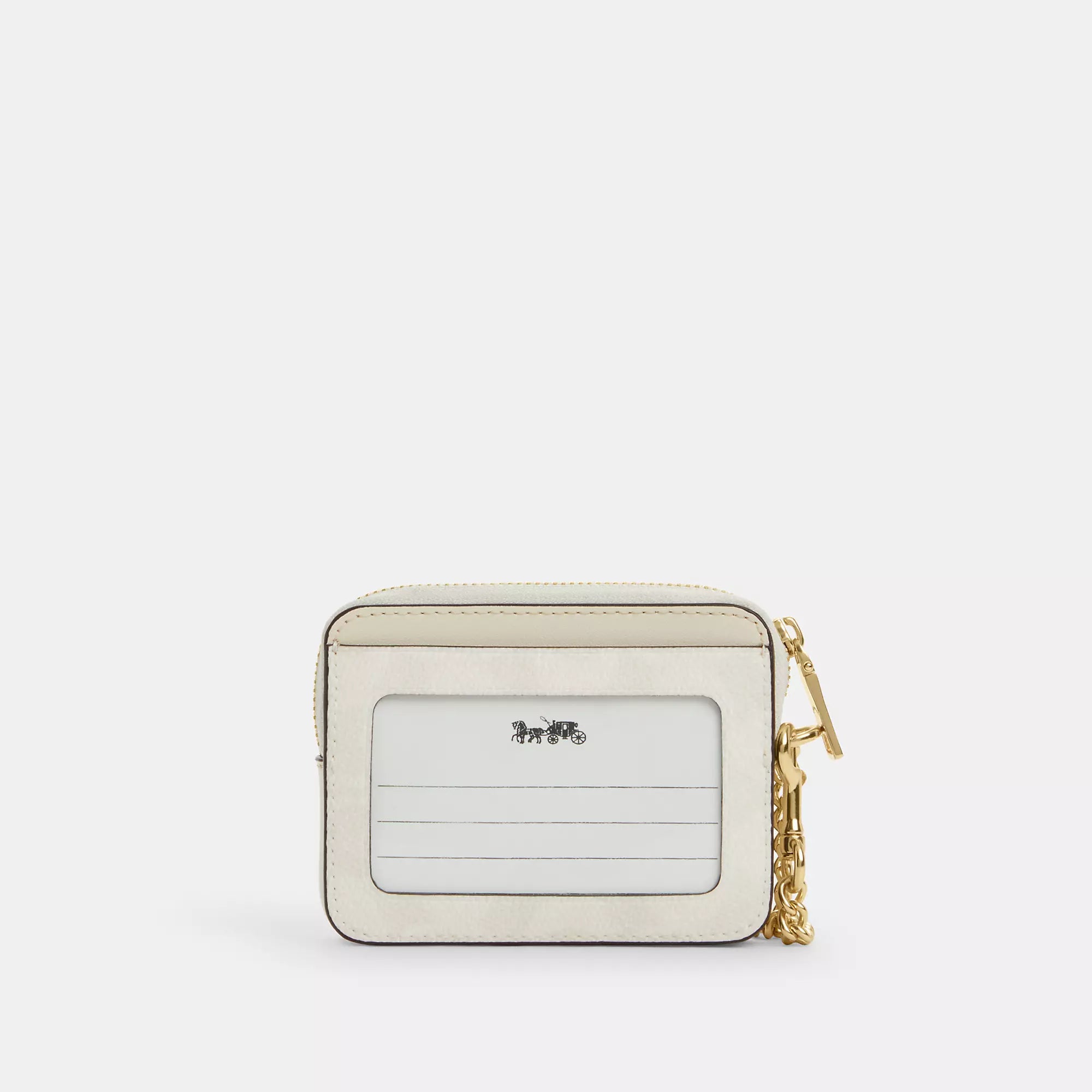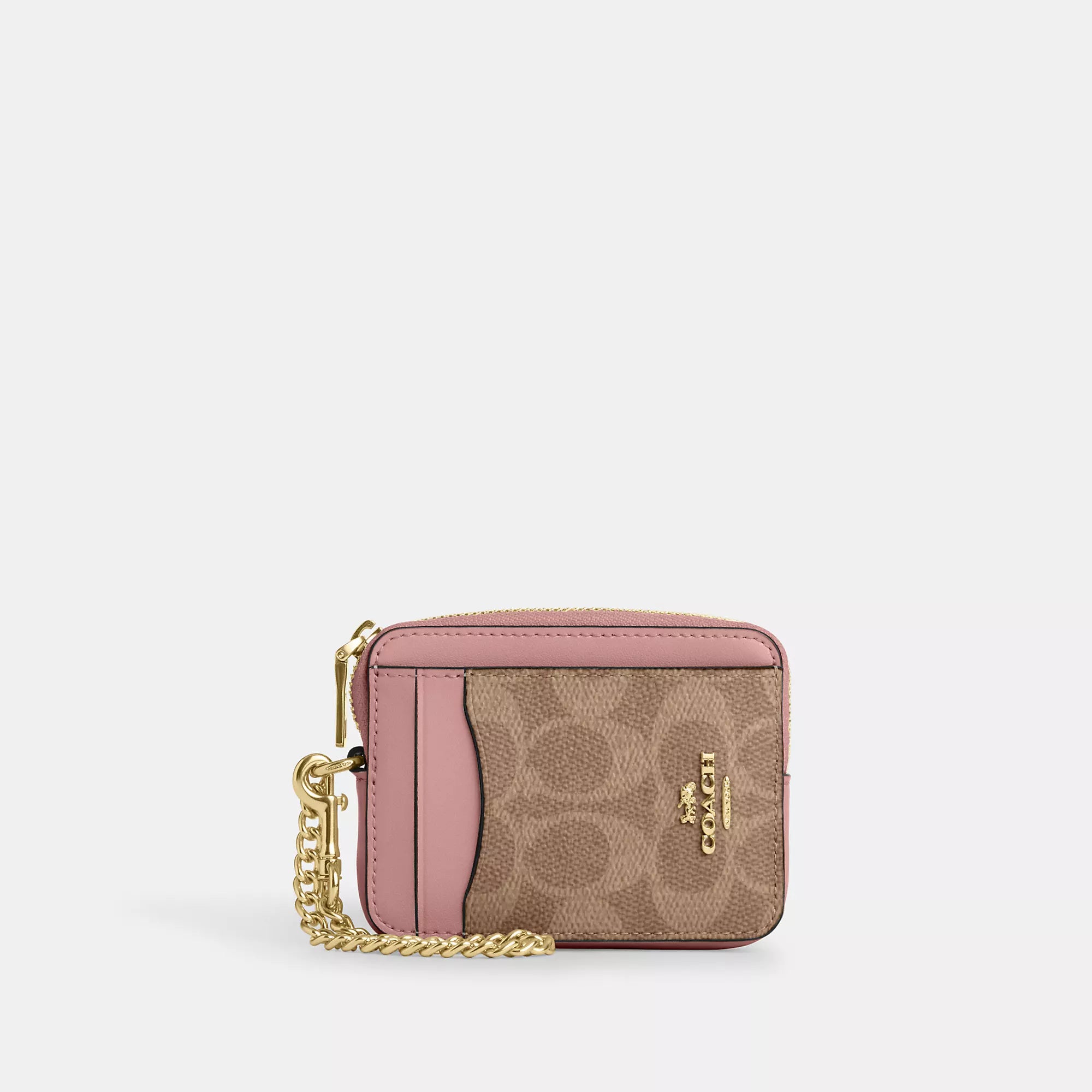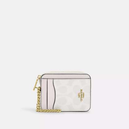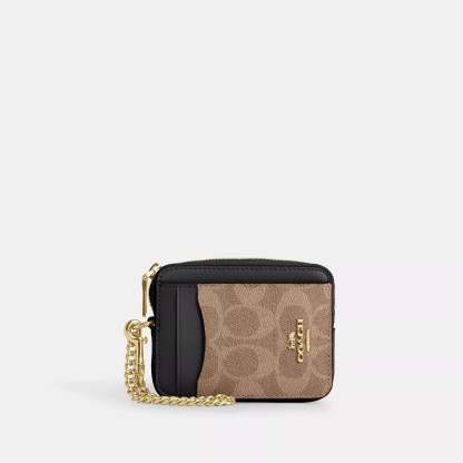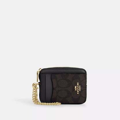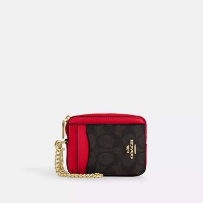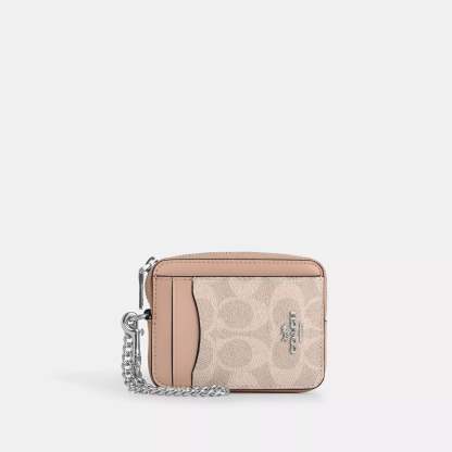 Signature coated canvas Two credit card slots ID window Open pocket Zip compartment Chain wrist strap with dogleash clip attached 3 (L) x 4 1/4 (H) x 3/4 (W) Style No. CW883 | Coach Outlet Zip Card Case In Signature Canvas - Multi