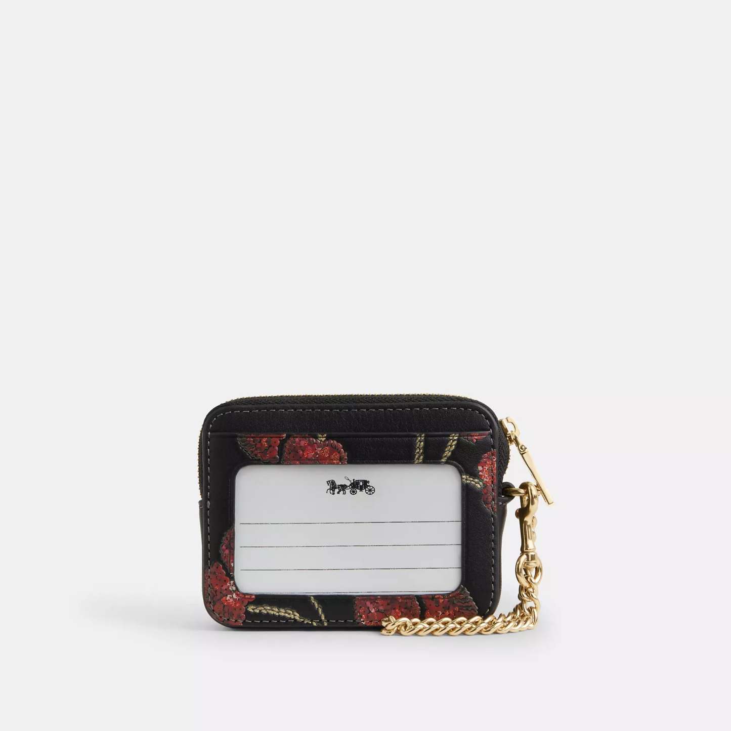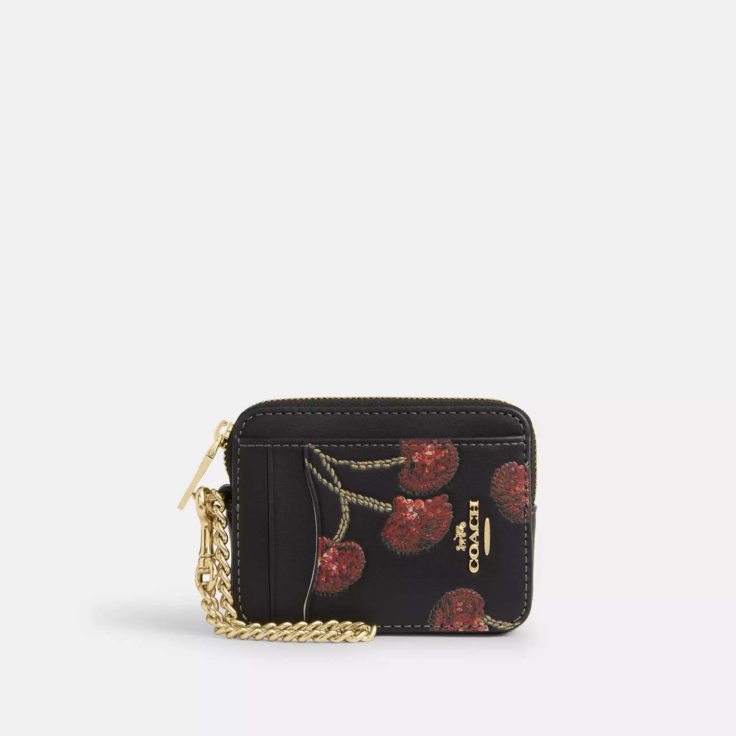 Smooth leather Two credit card slots ID window Open pocket Zip compartment Chain wrist strap with dogleash clip attached 3 (L) x 4 1/4 (H) x 3/4 (W) Style No. CDF99 | Coach Outlet Zip Card Case With Cherry Print - Black