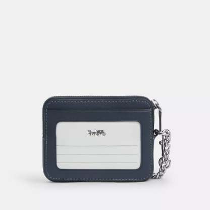 Denim and smooth leather Two credit card slots ID window Open pocket Zip compartment Chain wrist strap with dogleash clip attached 3 (L) x 4 1/4 (H) x 3/4 (W) Exclusive of trim this piece is crafted of cotton sourced from farms that use regenerative agricultural practices—those that help to maintain and rejuvenate land increase biological diversity and soil health and could lead to increased carbon absorption Style No. CAR26 | Coach Outlet Zip Card Case With Quilting - Blue