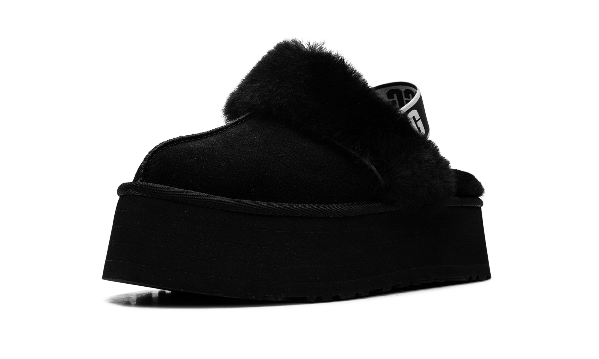 Step out with a funky, retro vibe in the UGG Funkette Slipper WMNS 'Black'! This bold slipper evolves the classic Coquette, combining a plush suede upper with a striking 2-inch platform for fashionable height. The soft sheepskin lining and collar wrap your feet in comforting warmth, while the elastic backstrap-featuring a graphic UGG logo-secures your fit. With a durable SugarSole™ or Treadlite outsole, this slipper is ready for a cozy statement indoors or out.