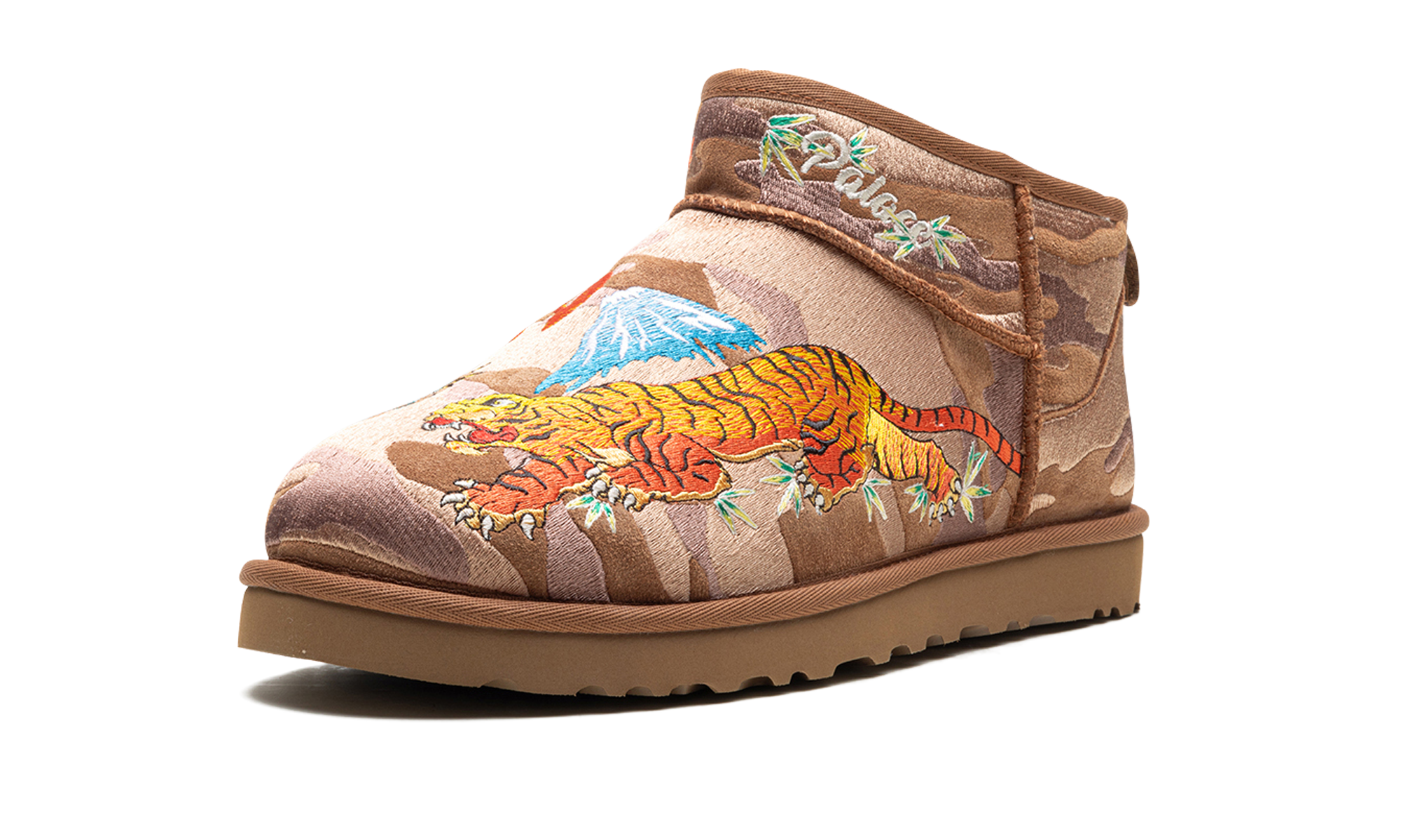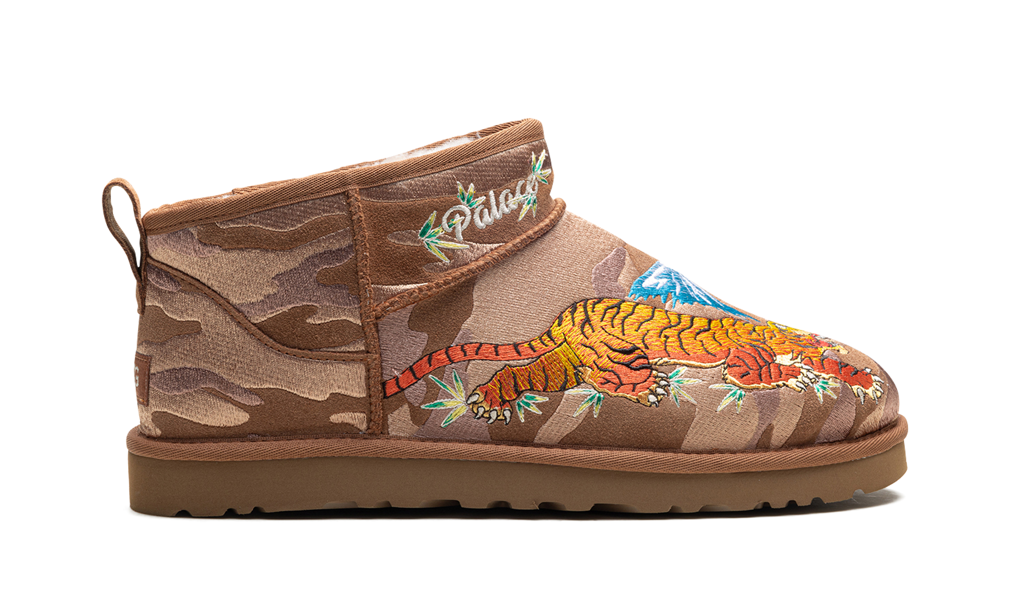 Step into exclusive streetwear comfort with the Mini Boot Palace "Chestnut Camo". This celebrated collaboration features a classic UGG boot updated with a Palace camo pattern on the chestnut suede. The plush wool lining and durable outsole deliver ultimate warmth and a bold aesthetic, perfect for making a statement indoors or out.