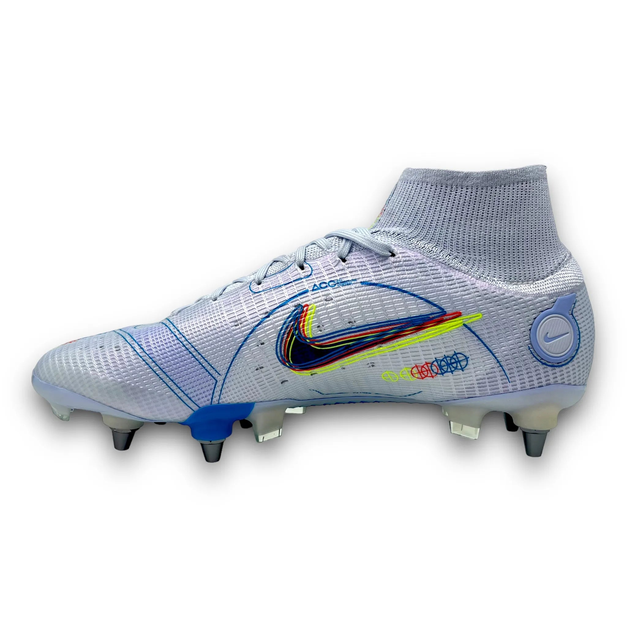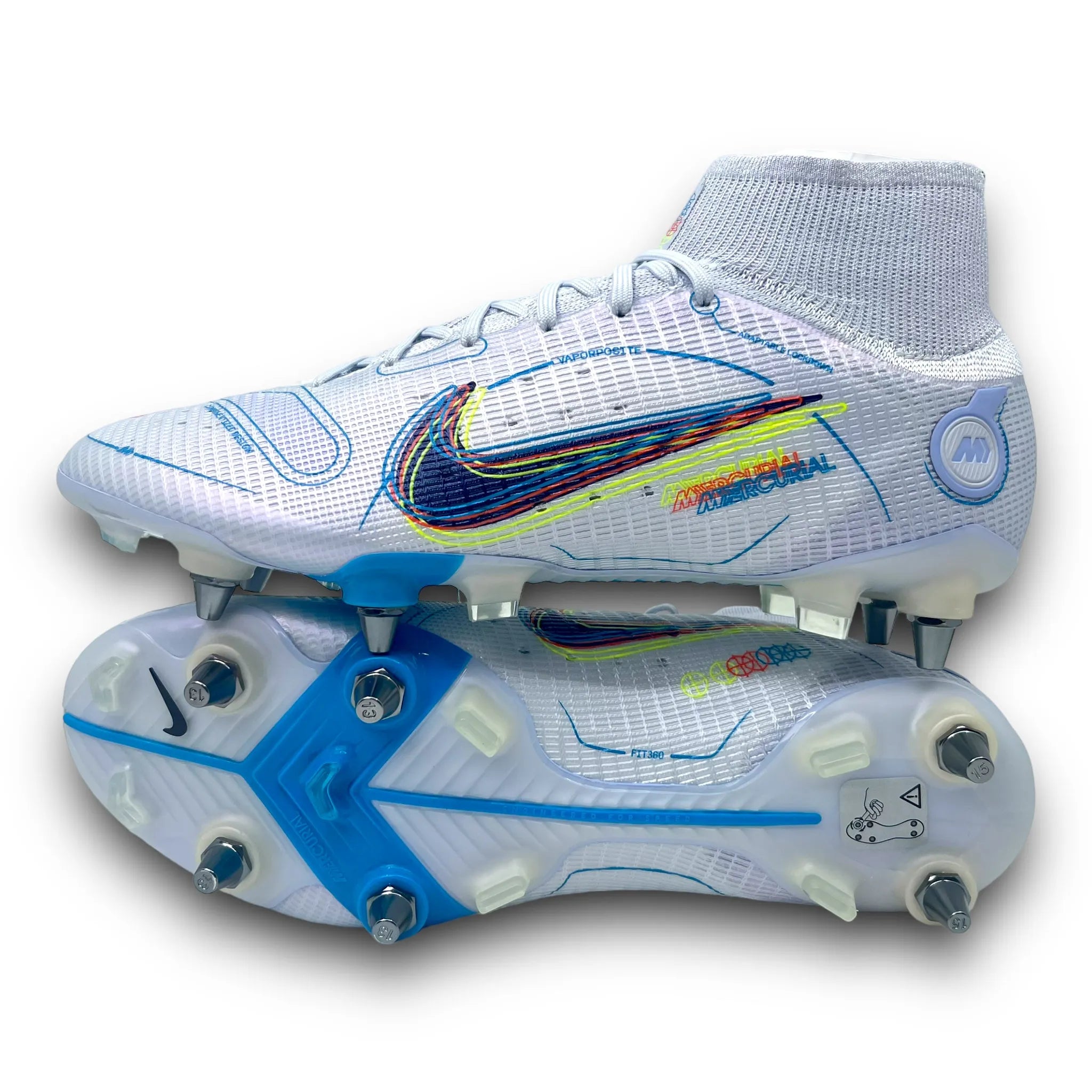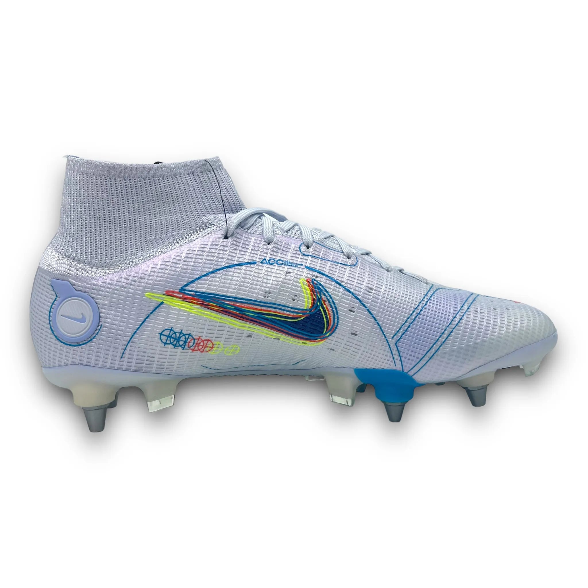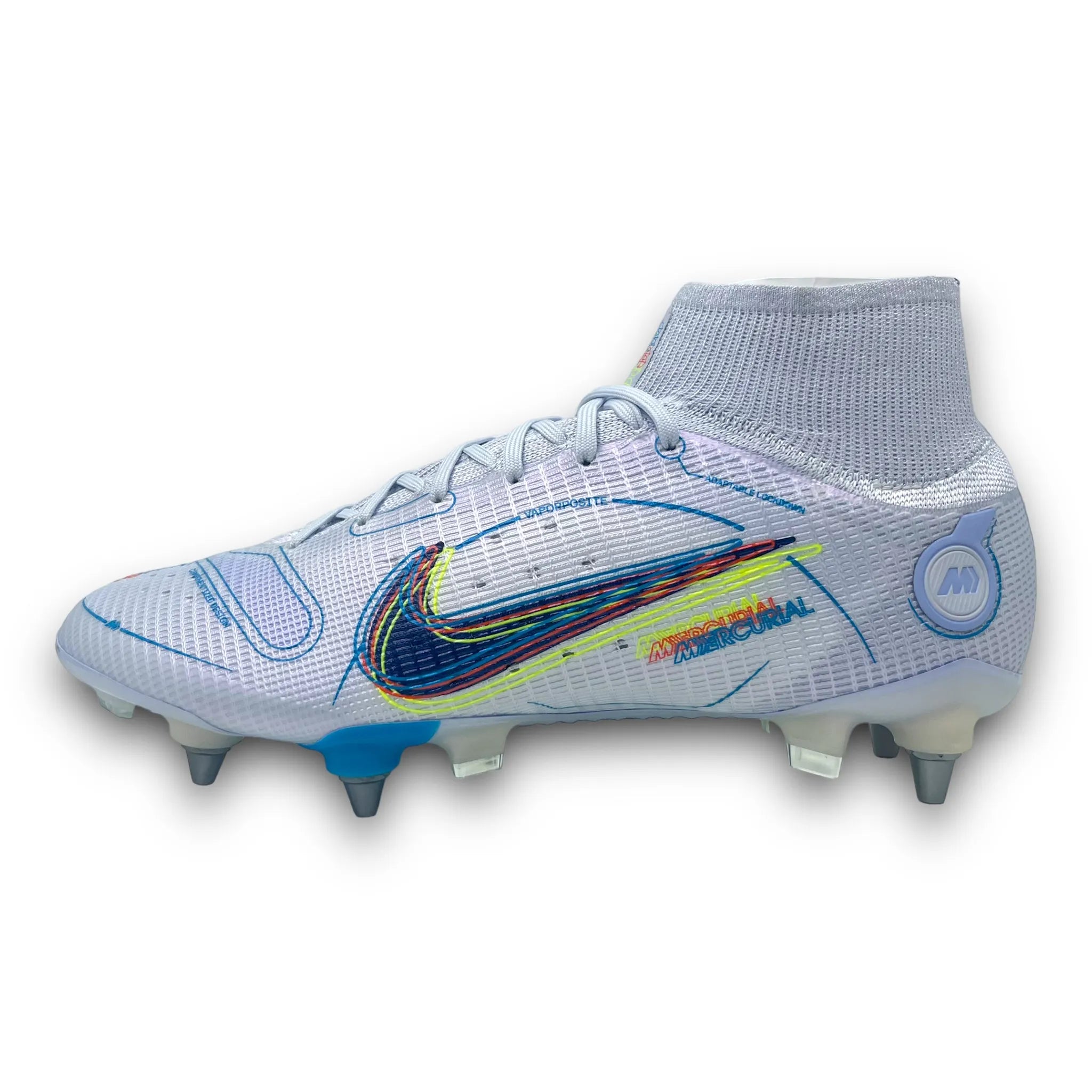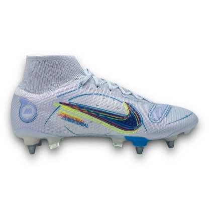 This Nike Mercurial Superfly 8 is designed with a revolutionary "Vaporposite" upper created by four layers called Duragon WT, Engineered Mesh, Titan Synthetic and Avail Q Lining. The result is a unique fit and support with very good grip on the ball. Flyknit compression material is placed at the ankle, which helps create a comfortable feeling, optimal support and increased flexibility. Strategically placed studs, which with their angular shapes and length, act like claws during acceleration and changes of direction. The Dynamic Fit high sock is reinforced compared to previous models, it offers optimal support for the ankle and foot.
