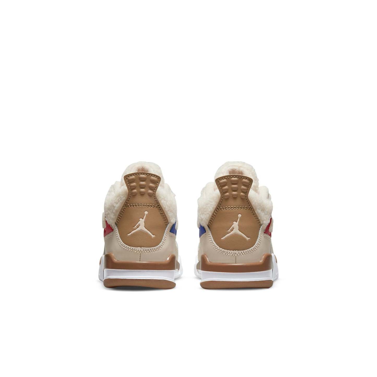Made for little kids, the Air Jordan 4 PS ‘Wild Things’ adds warm fleece construction to the padded collar and tongue, the latter accented with an embroidered Jumpman icon. The rest of the upper is built with tan leather and a quartet of color-popped eyelets in neon green, pink, blue and red. A second Jumpman logo embellishes a molded heel panel in dark beige. The sneaker sits on a two-tone foam midsole, supported by an outsole built with gum rubber under the forefoot and heel.