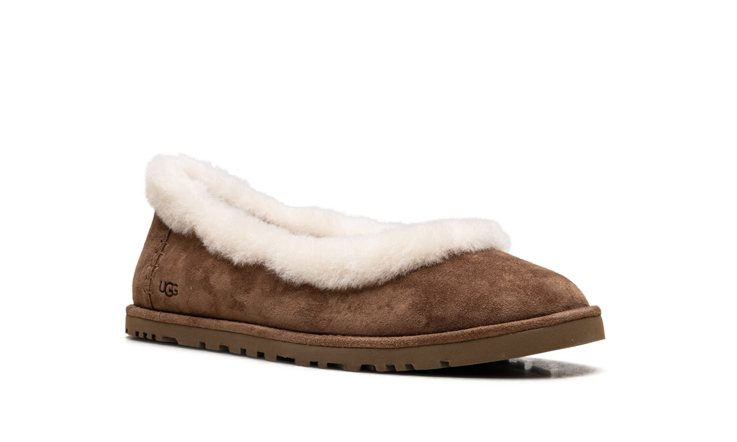 Step into cozy elegance with the UGG Zora Ballet Flat Wmns "Chestnut". This women's flat features a soft suede upper in a rich chestnut hue and a plush sheepskin lining for luxurious comfort. The versatile design delivers a comfortable fit and a refined look, perfect for making a sophisticated statement every day.